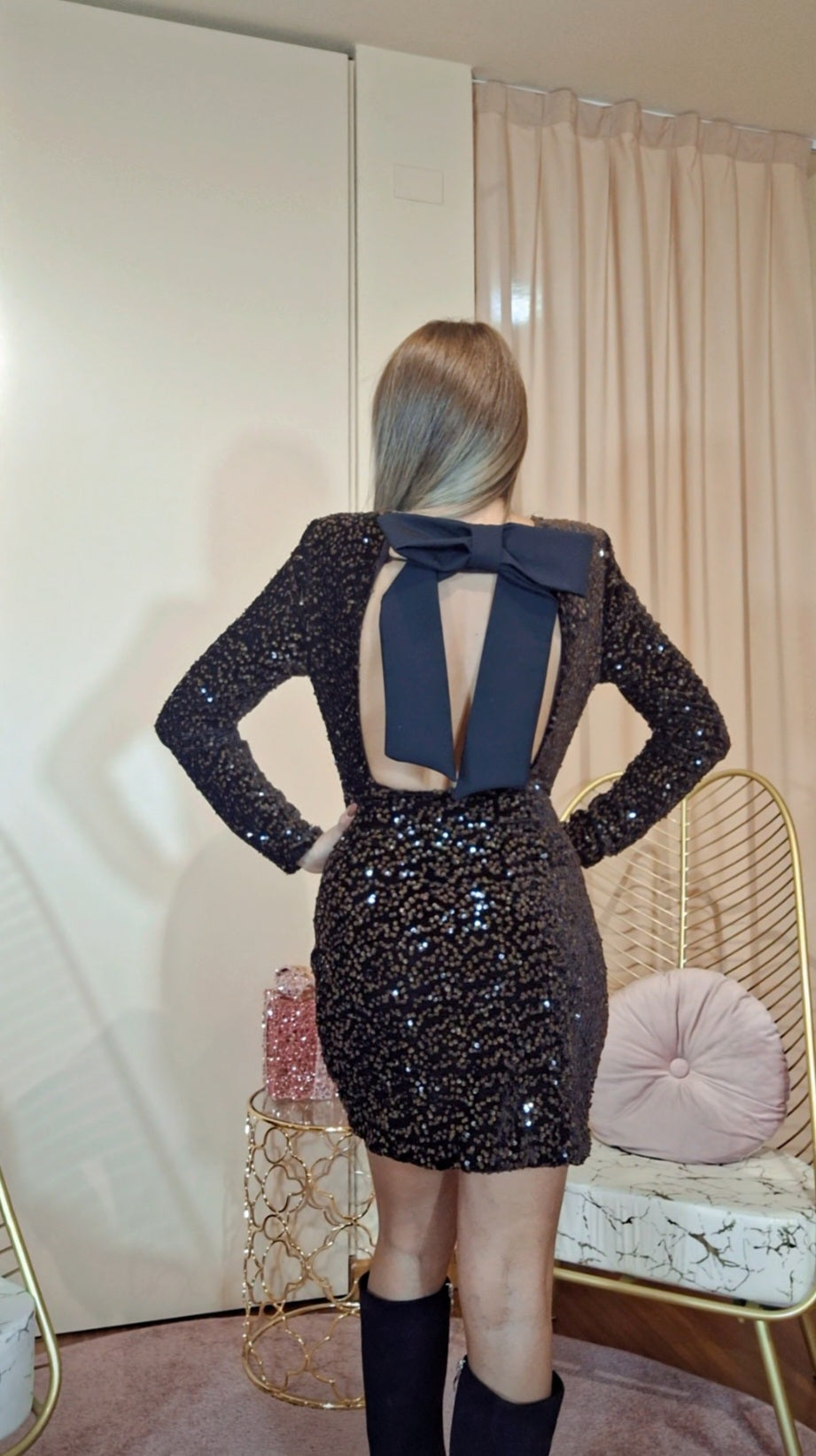 L'abito Airy è un tubino elegante realizzato in paillettes che catturano la luce con ogni movimento. La silhouette aderente valorizza le forme, mentre la scollatura sulla schiena con fiocco e le spalle imbottite aggiungono un tocco di sofisticatezza e femminilità. Perfetto per serate speciali, cene eleganti o eventi che richiedono un look raffinato e glamour. Un capo versatile che trasforma qualsiasi occasione in un momento indimenticabile.