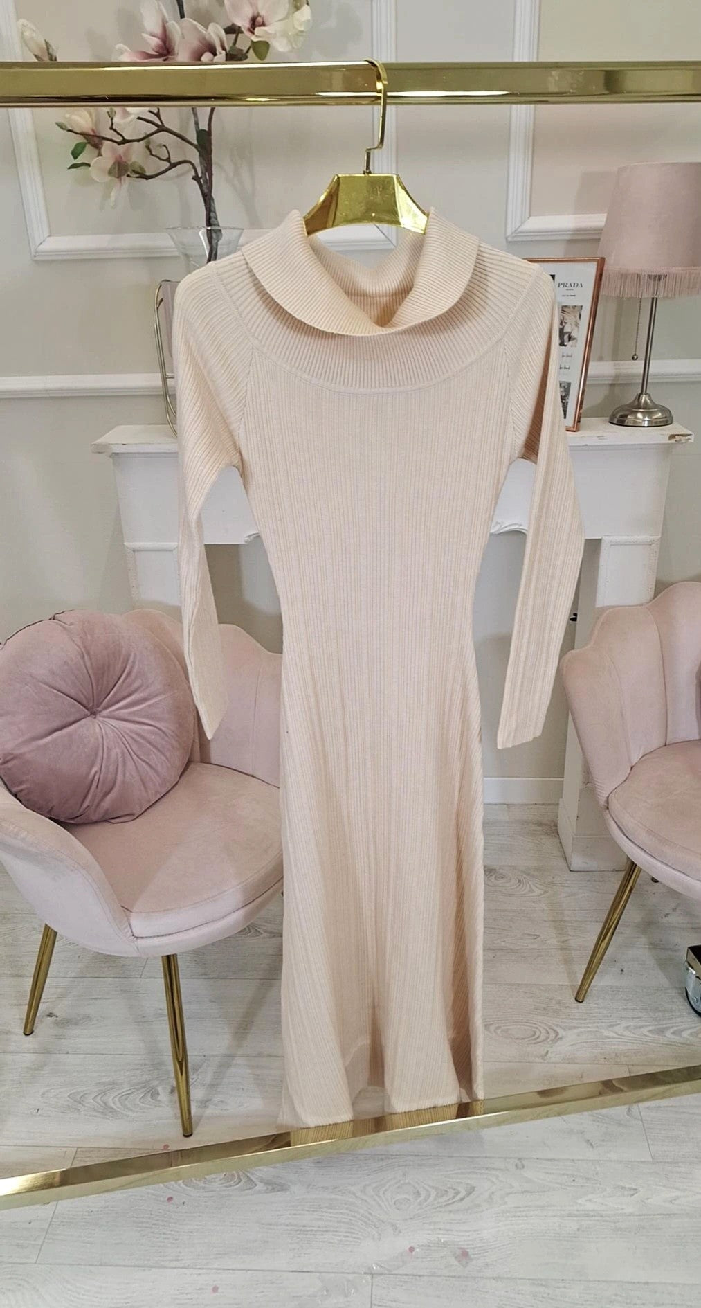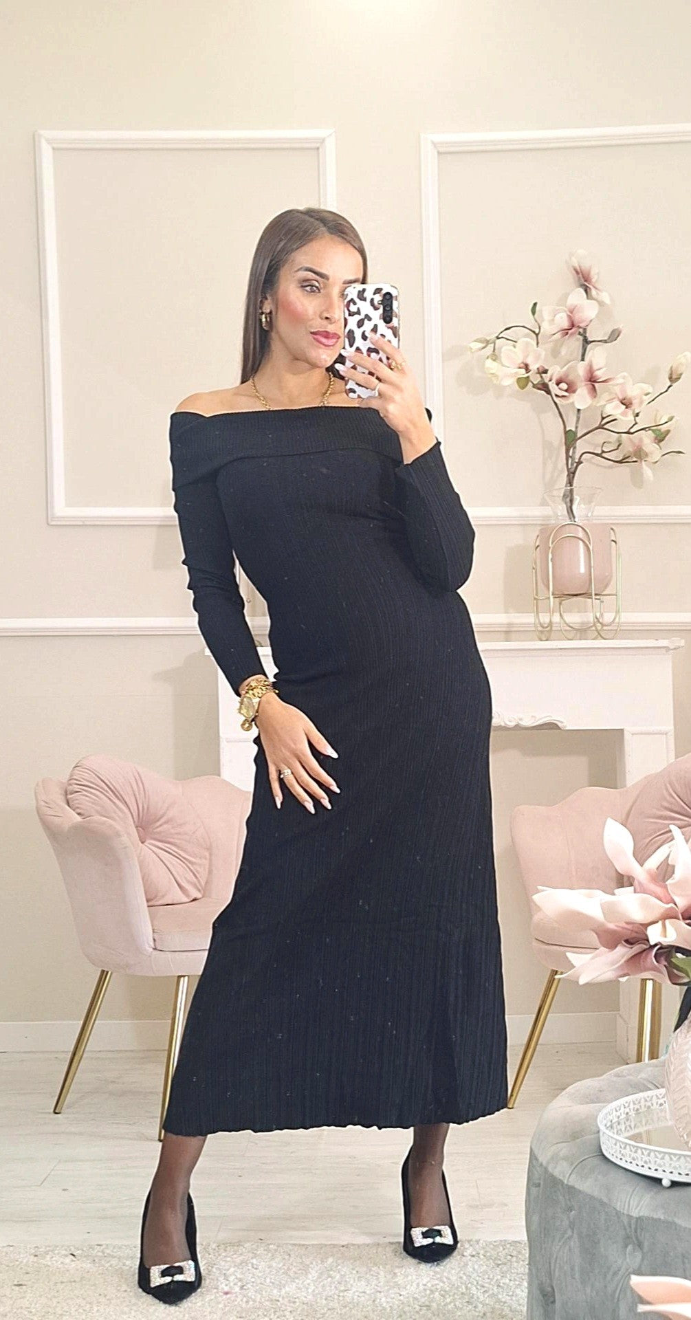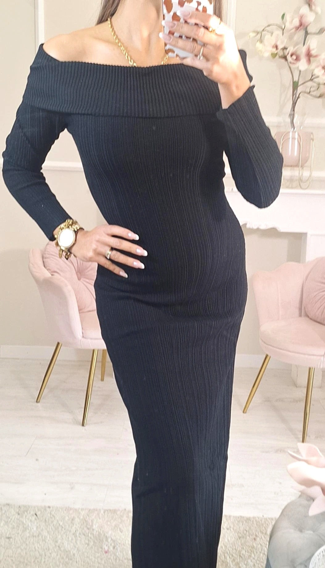 Abito Clarissa- Abito lungo monocolore in maglia svasato con scollo a barchetta e maniche lunghe