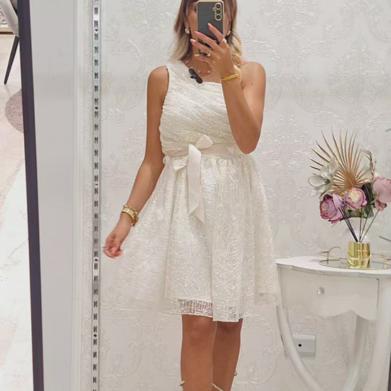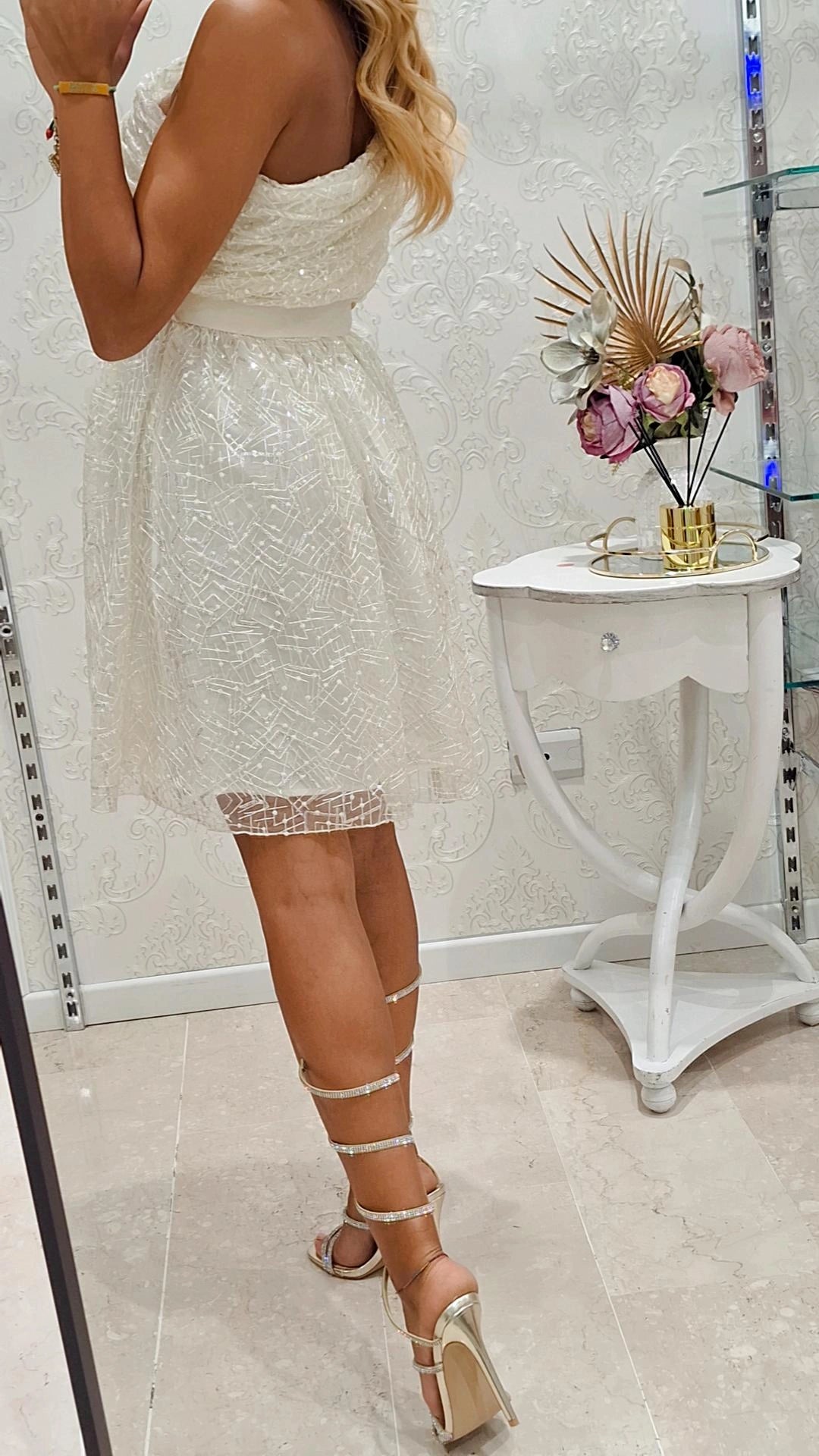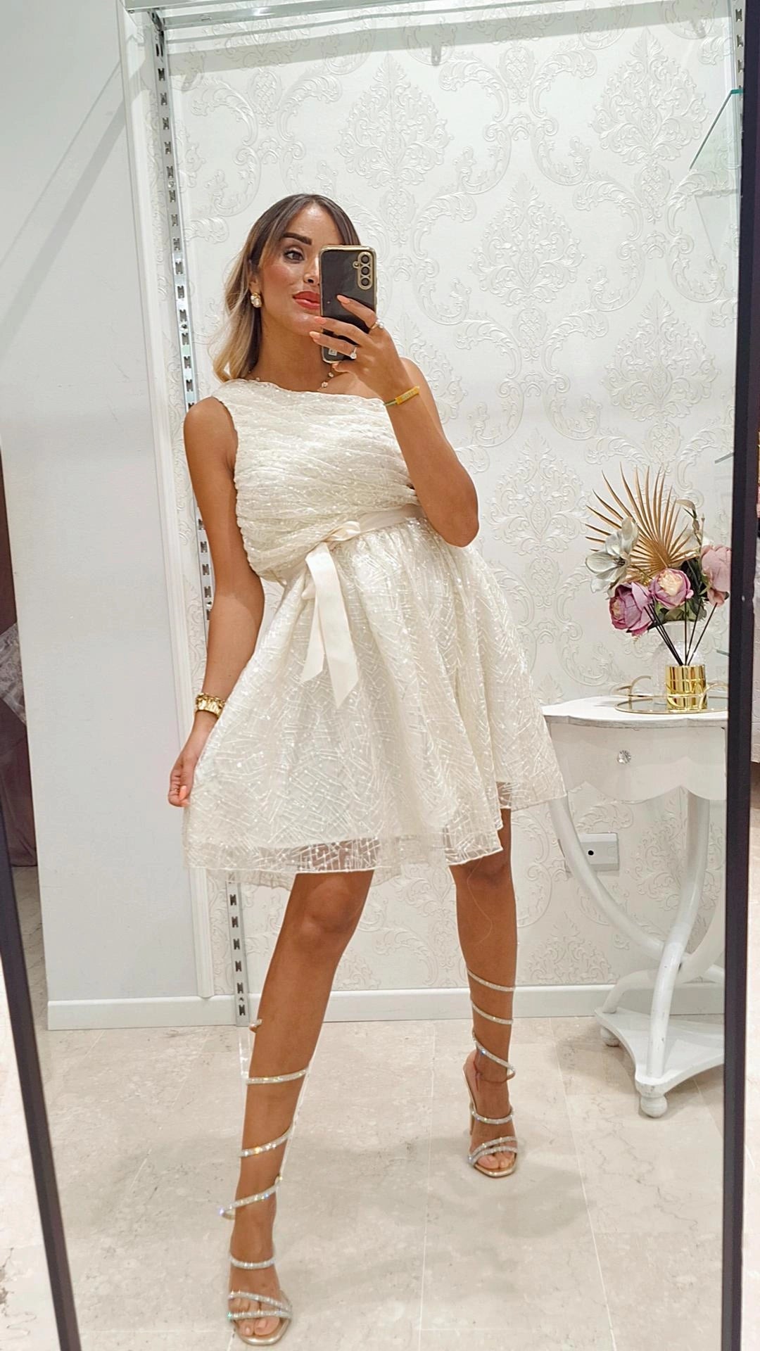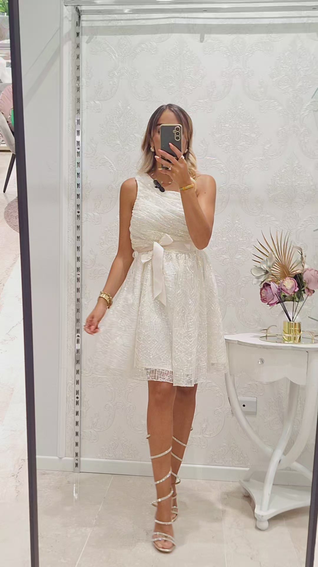 L'abito Greekis è un raffinato vestito da cerimonia corto color panna, caratterizzato da una linea monospalla elegante. La parte superiore drappeggiata esalta la silhouette, mentre il tessuto con brillantinati e strass dona un tocco luminoso e sofisticato. Dotato di cerniera laterale per una vestibilità perfetta, è completato da una cintura che sottolinea il punto vita, offrendo un equilibrio ideale tra stile e comfort. Perfetto per occasioni speciali in cui distinguersi con classe.