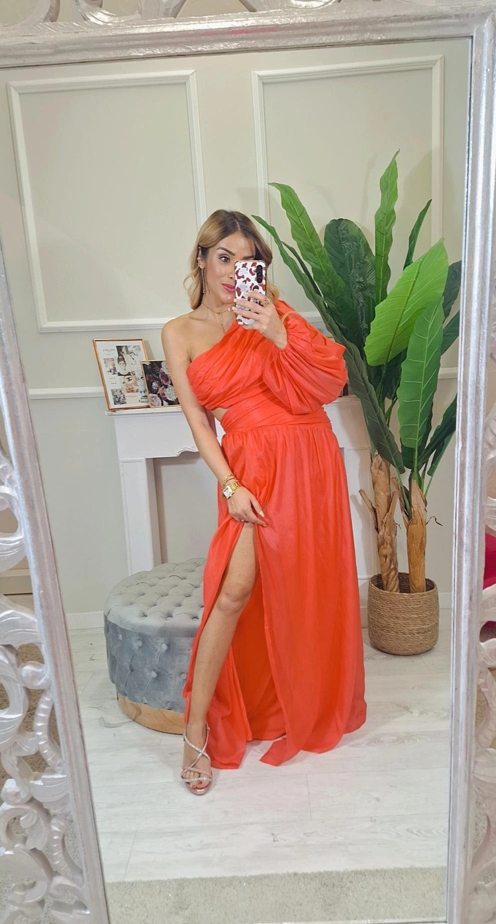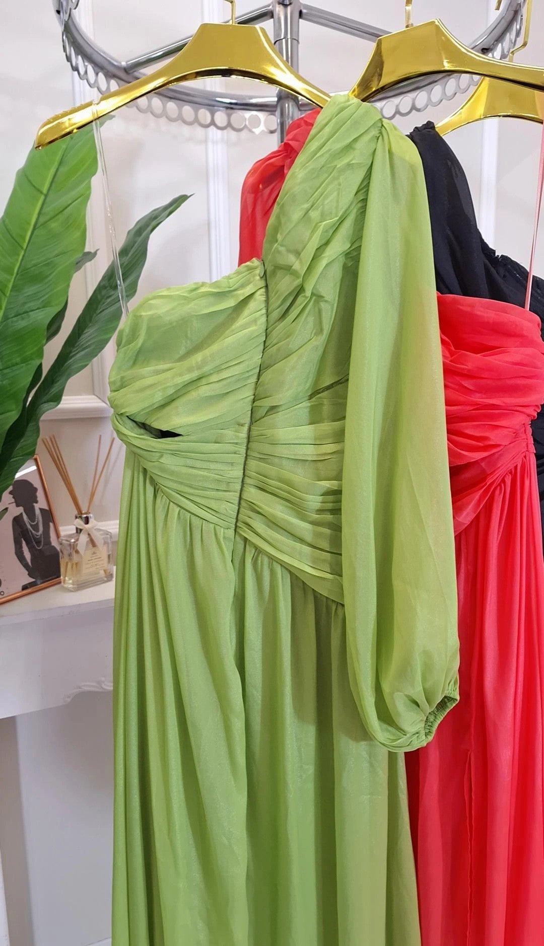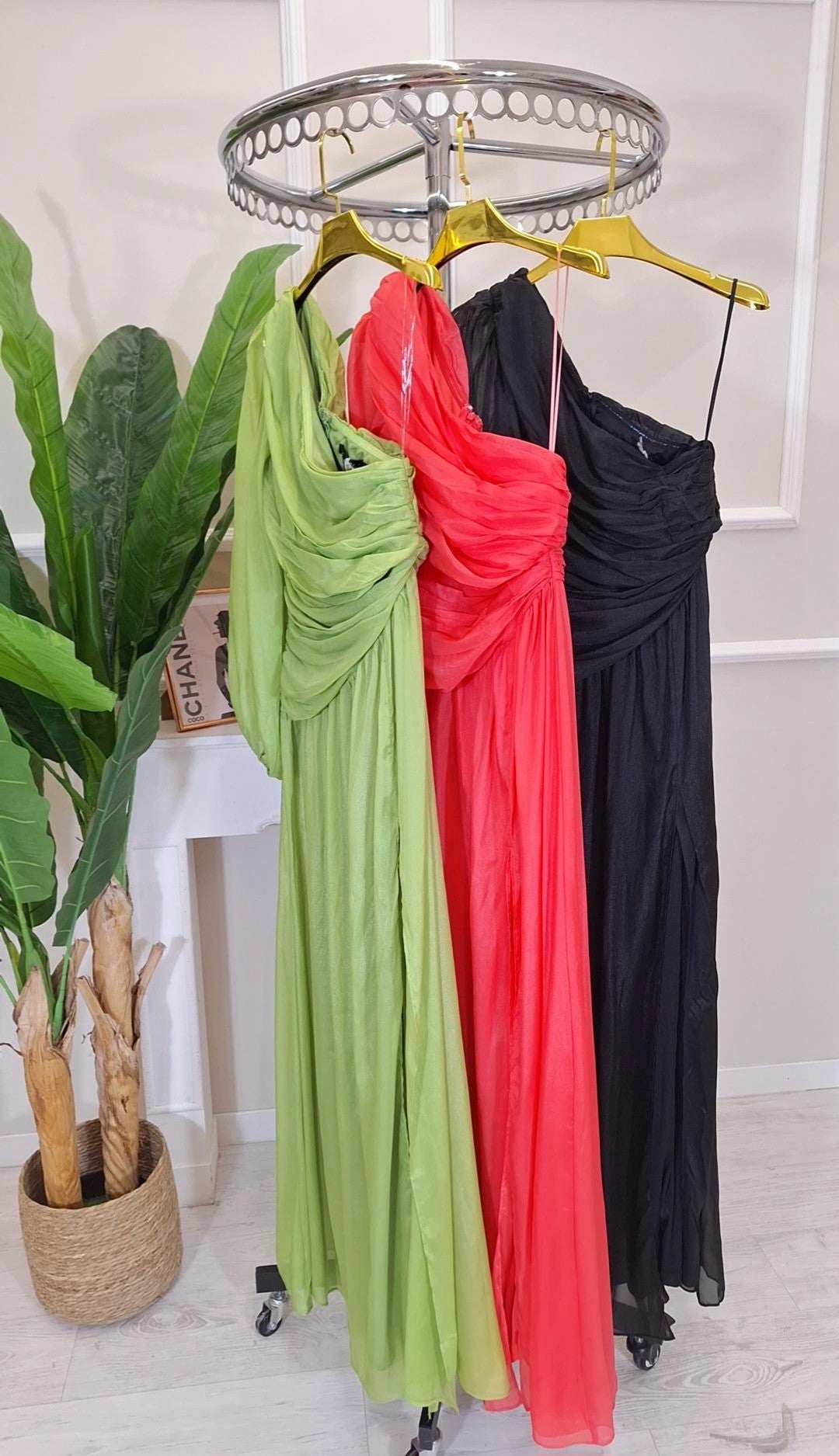 Abito Da Cerimonia Eleonor- Abito da cerimonia monospalla con parte superiore e gonna plisettata, piccolo spacco a livello della vita e spacco laterale.