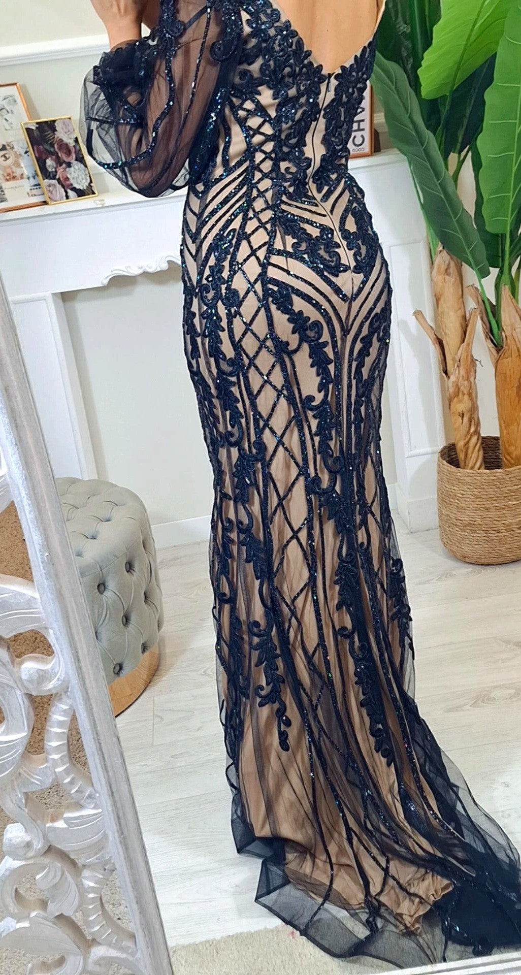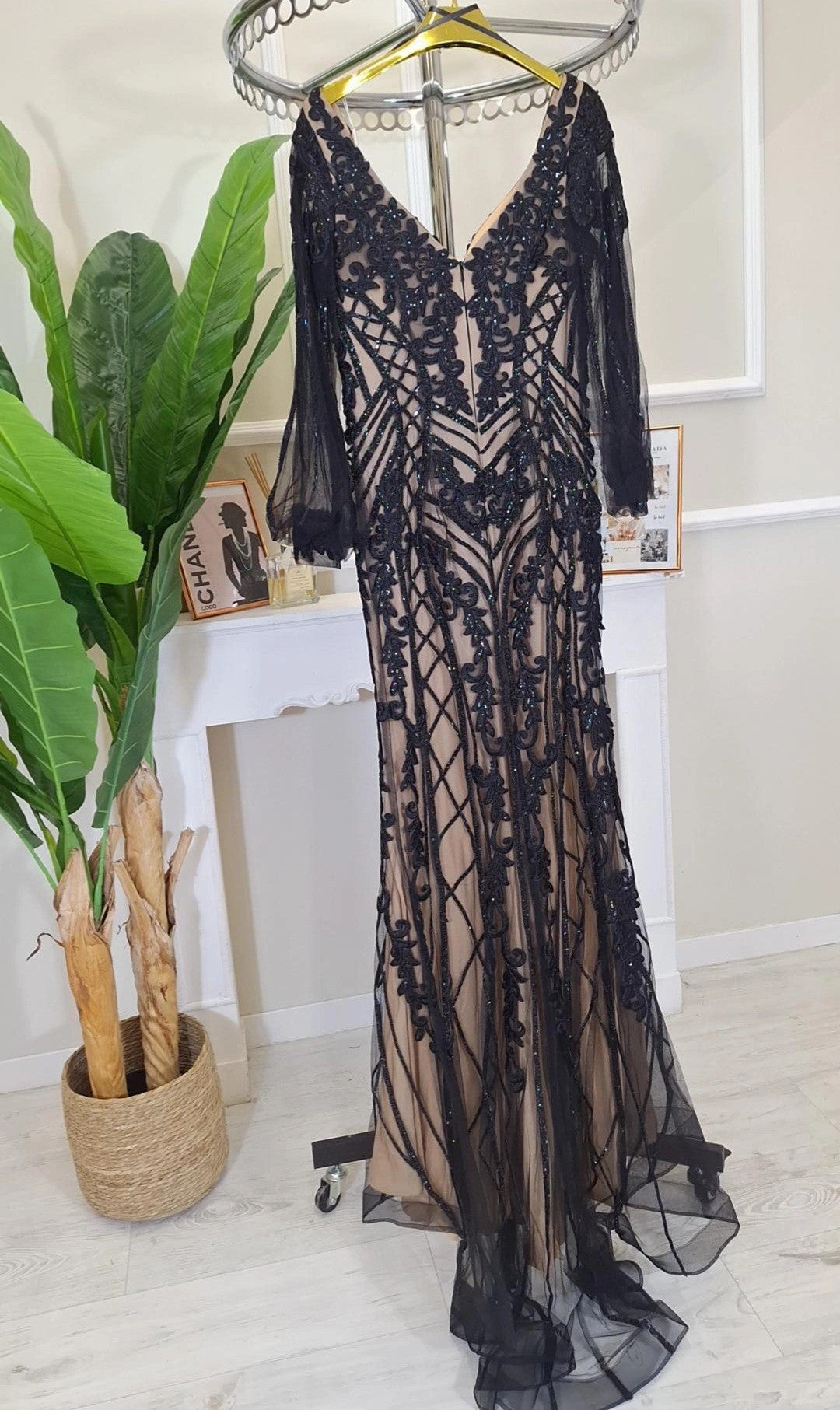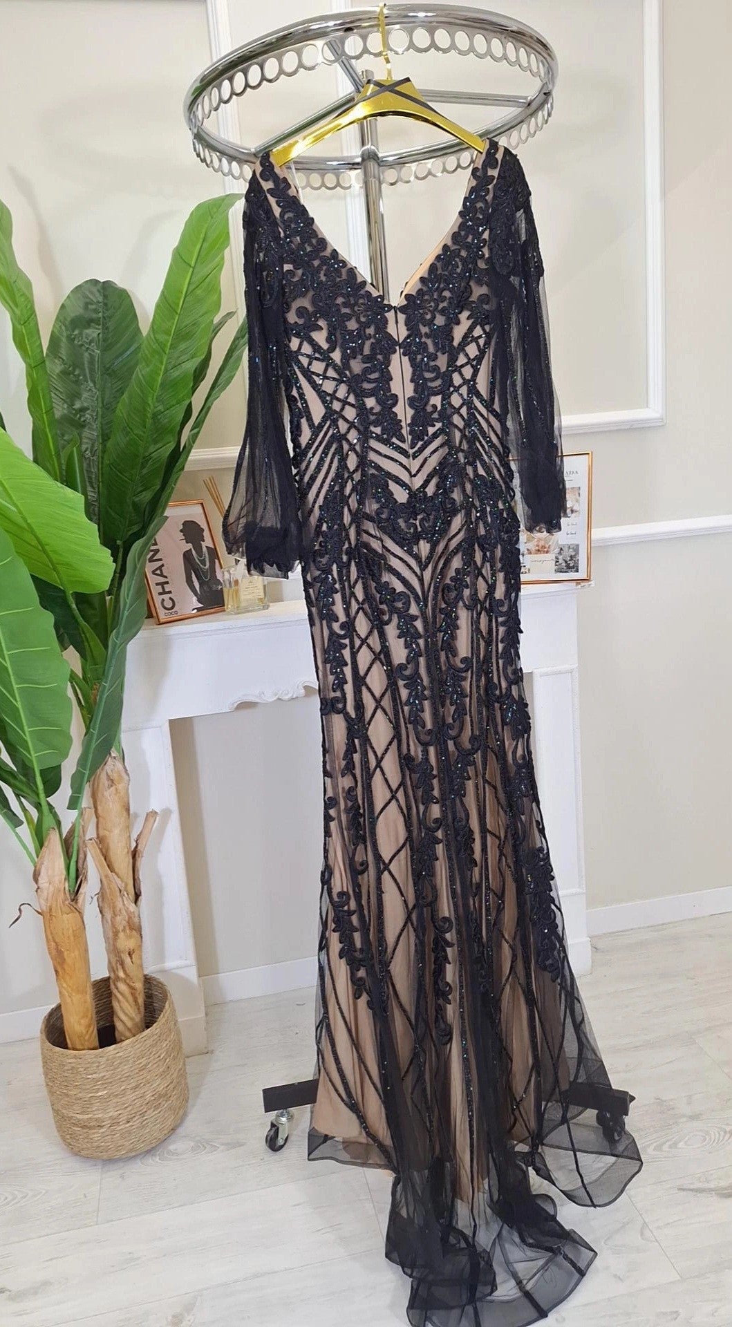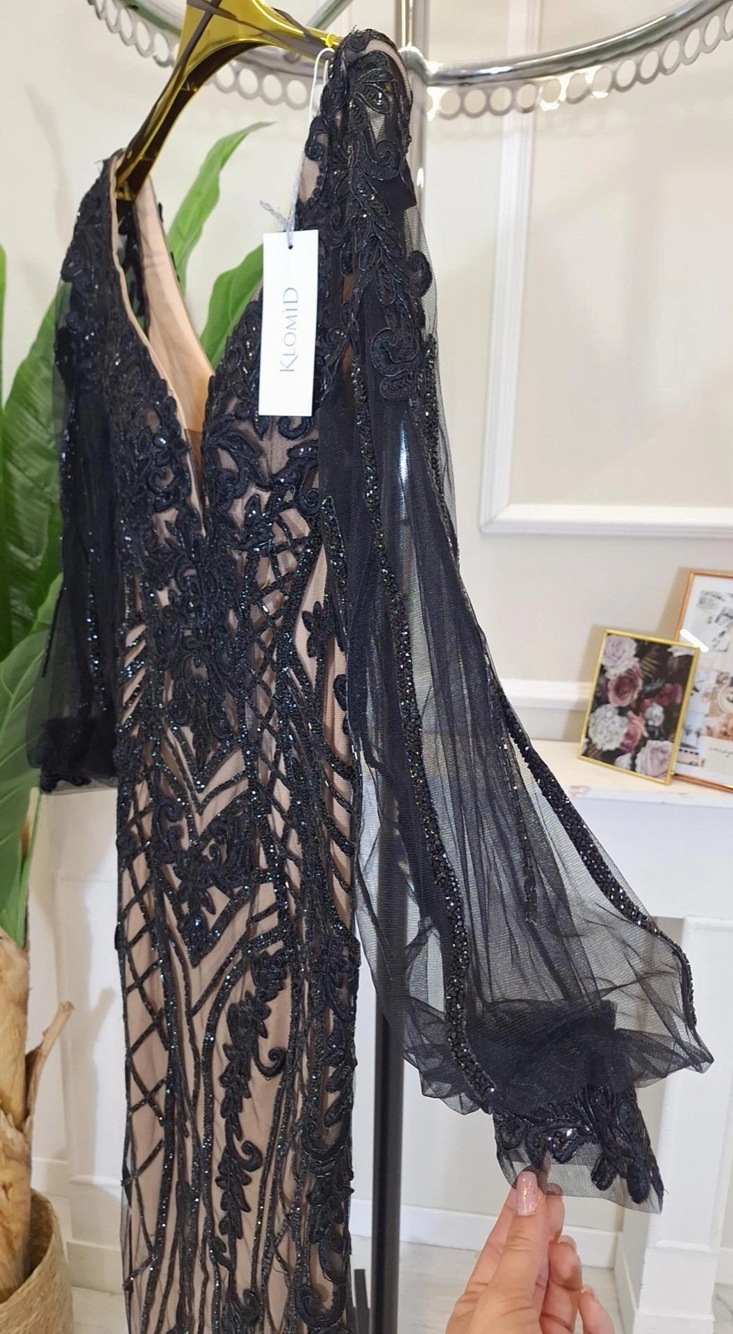 Abito Da Cerimonia Hisa- Abito da cerimonia a sirena ricamato con strass e maniche a sbuffo trasparenti