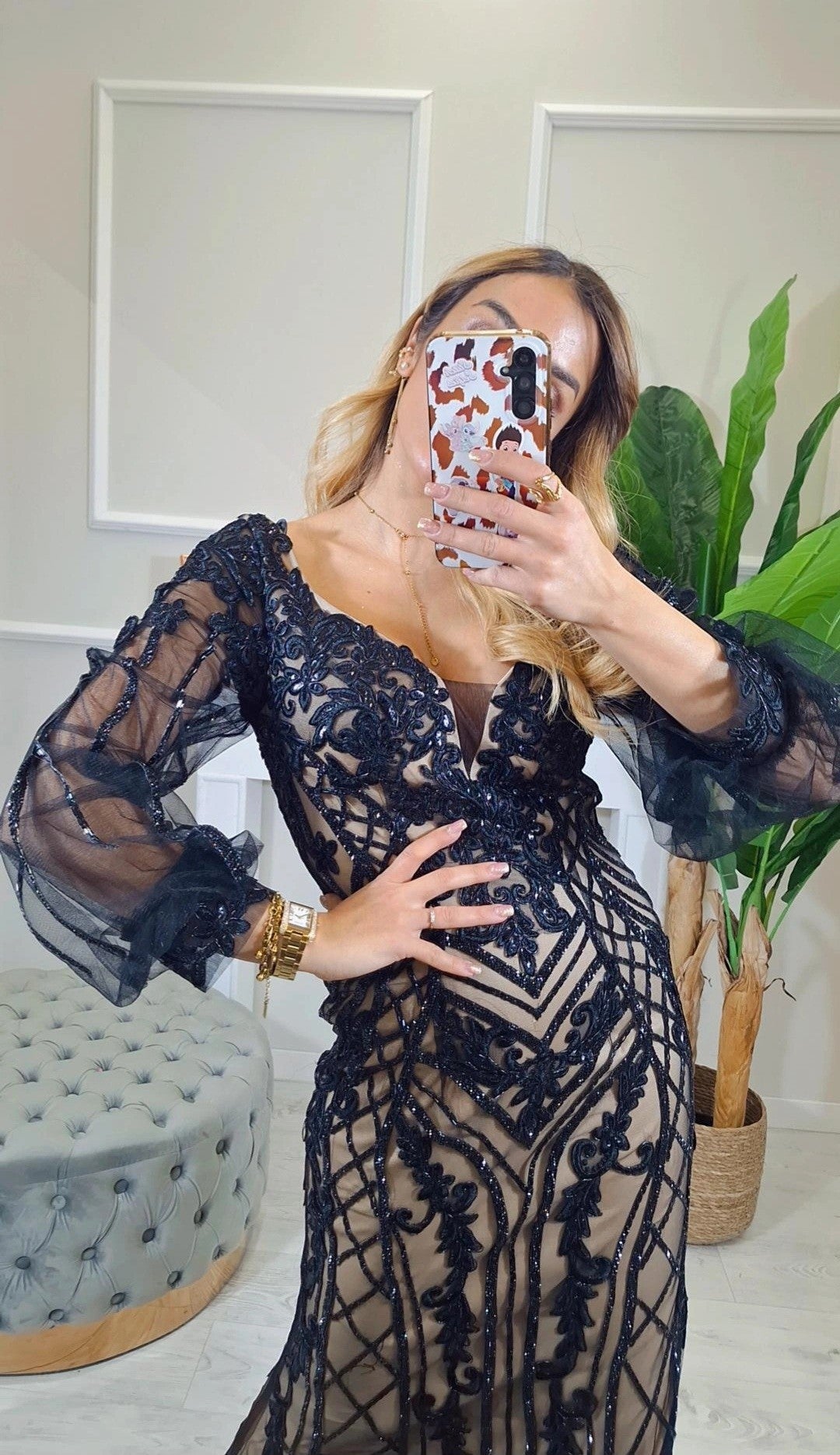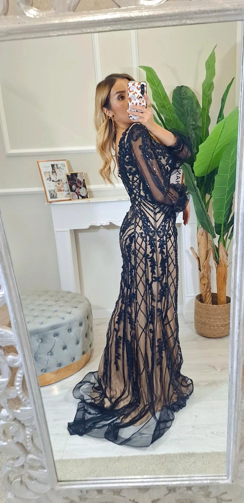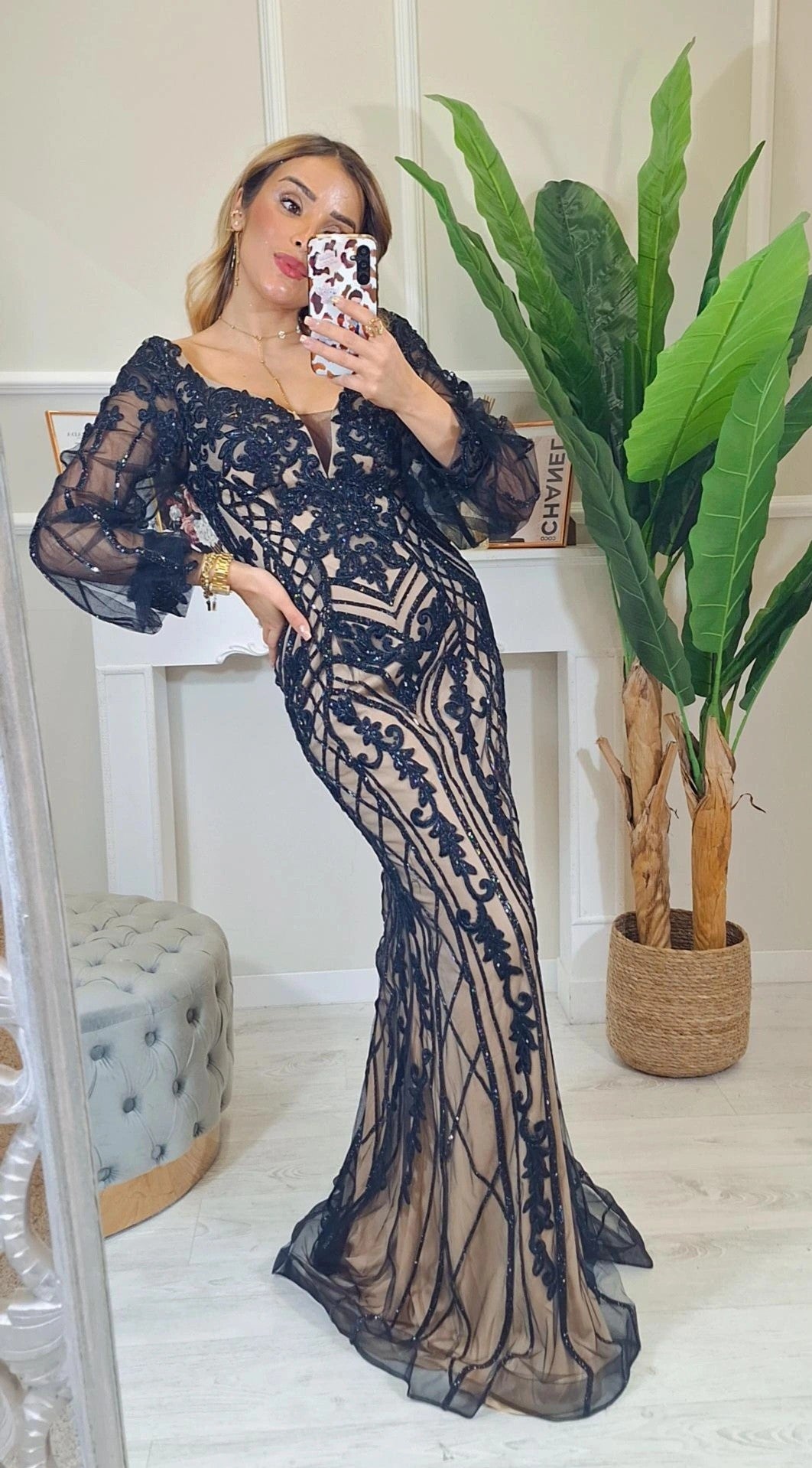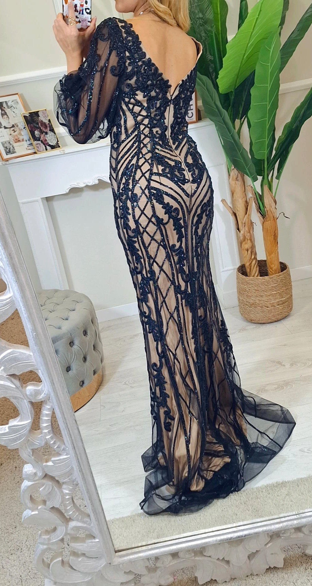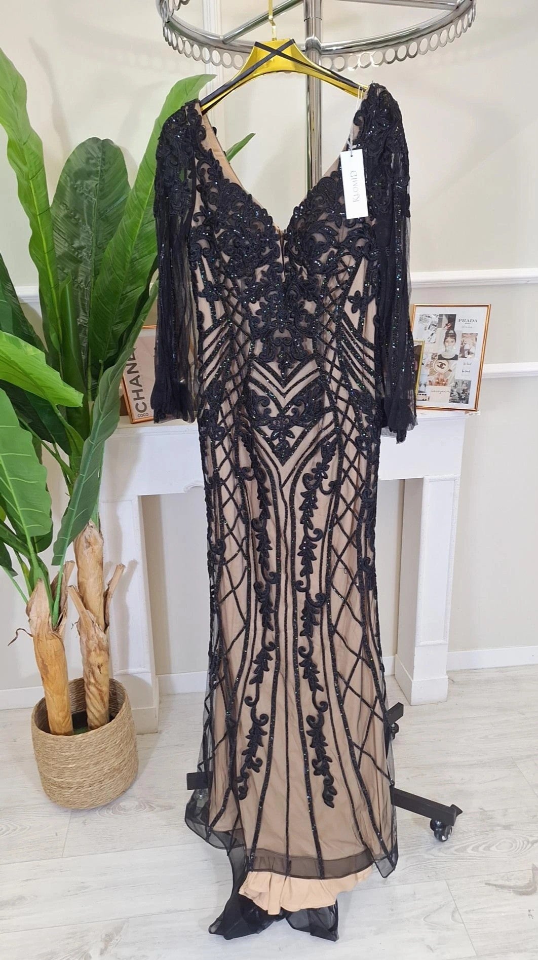 Abito Da Cerimonia Hisa- Abito da cerimonia a sirena ricamato con strass e maniche a sbuffo trasparenti
