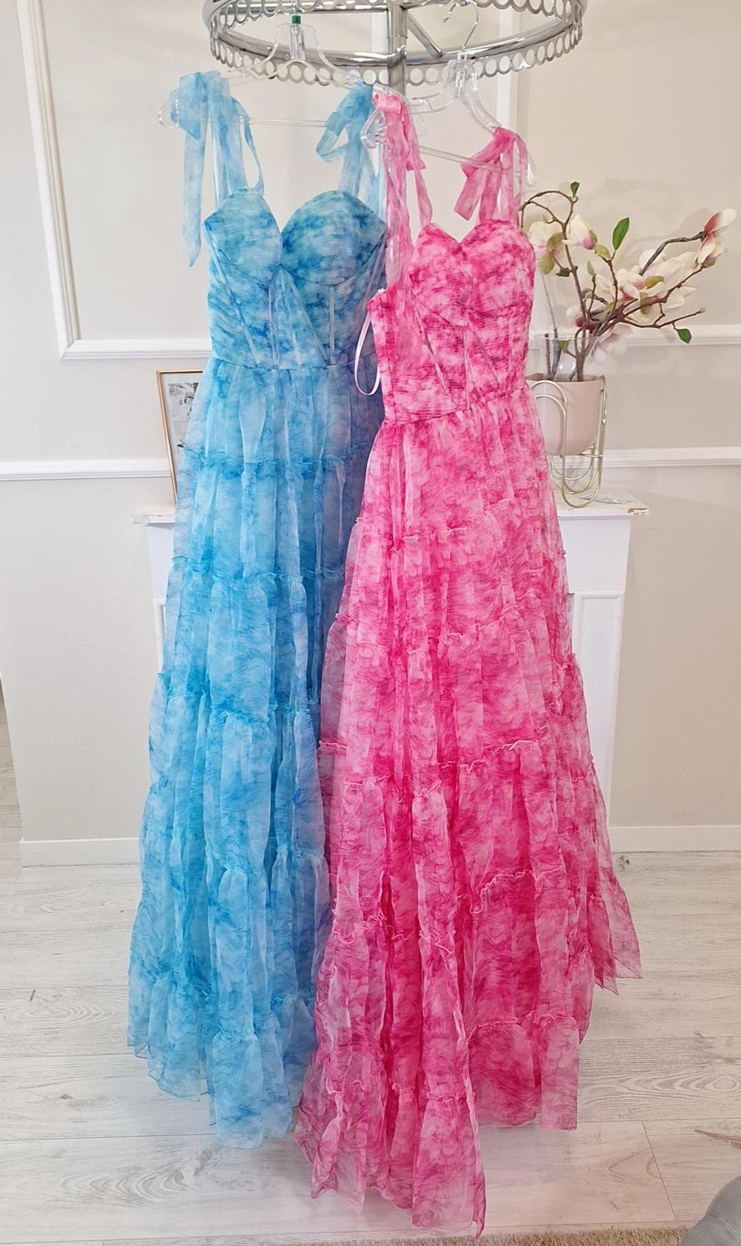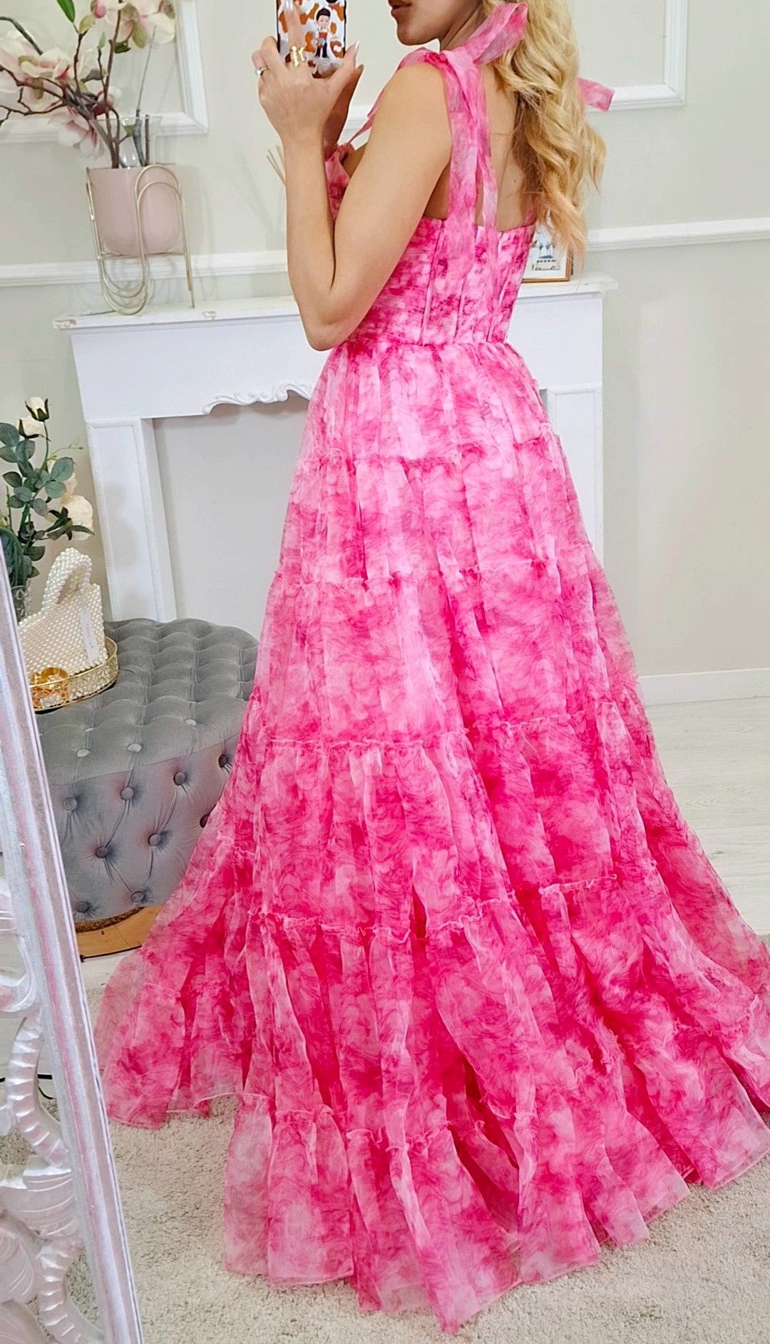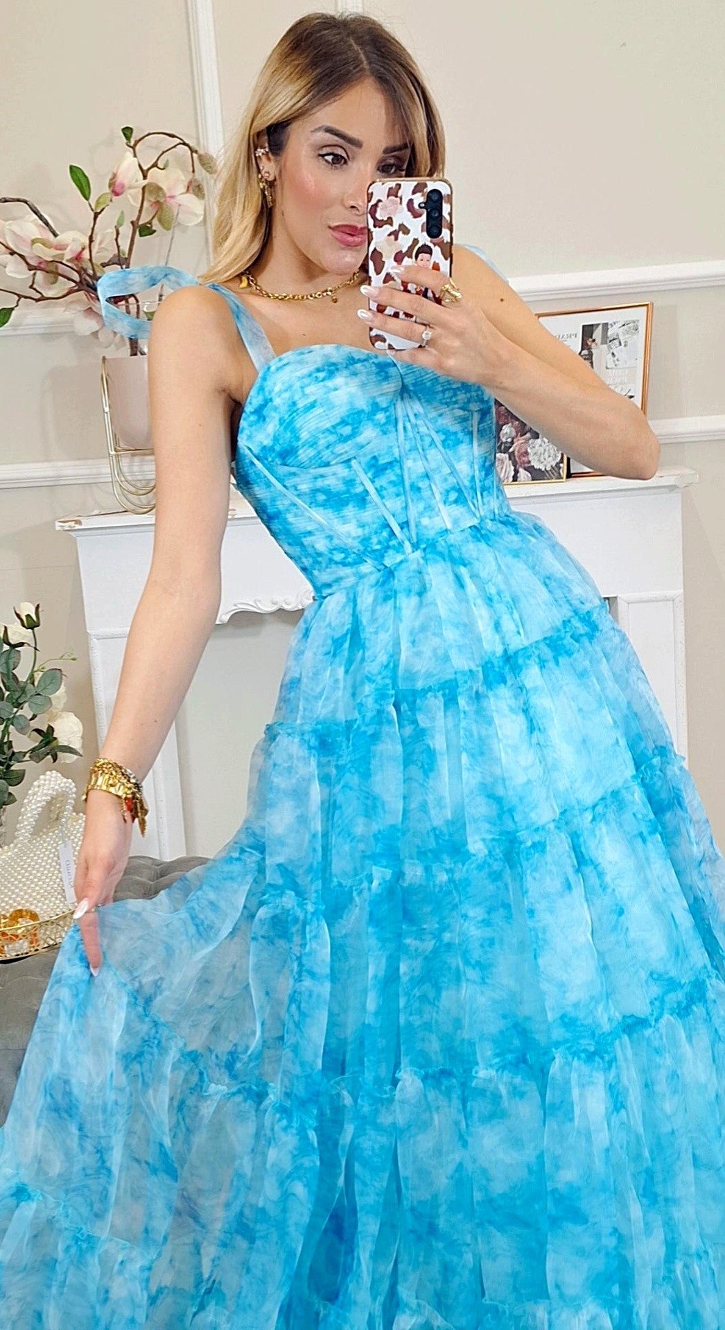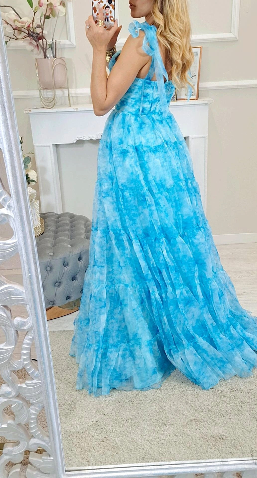 Abito da cerimonia Kassie - Abito lungo in fantasia con gonna ampia a balze e parte superiore a corsetto plissettato con spalline regolabili.
