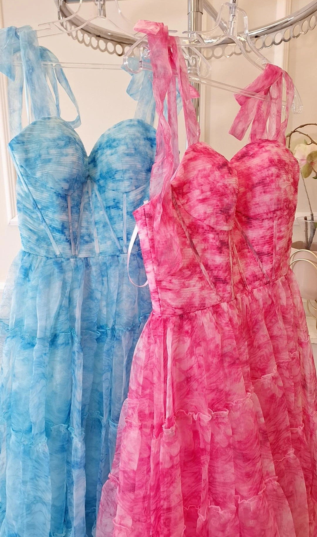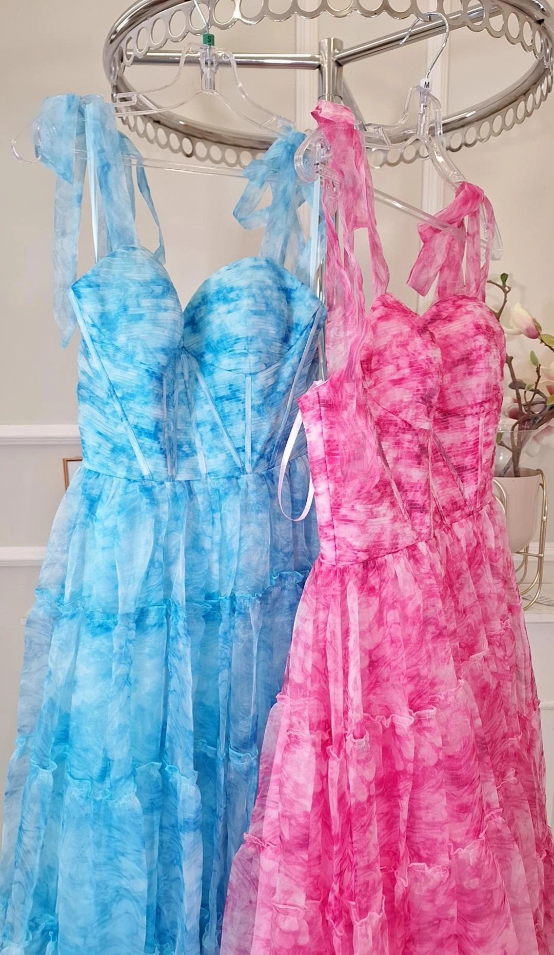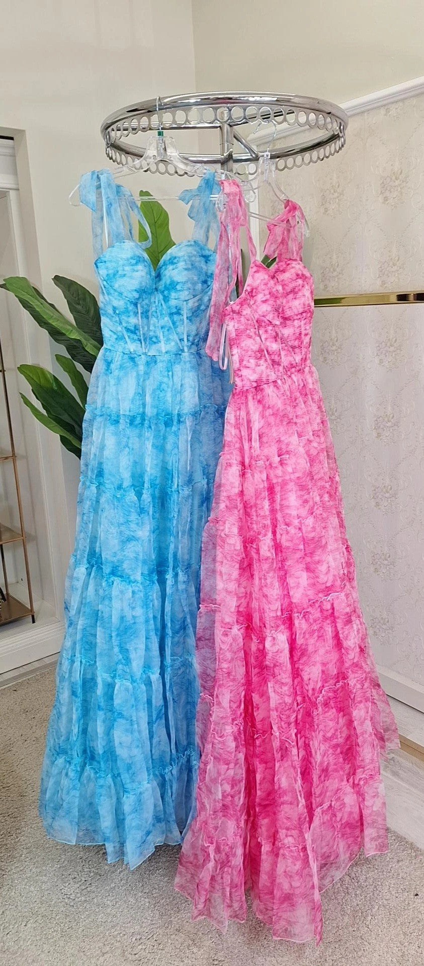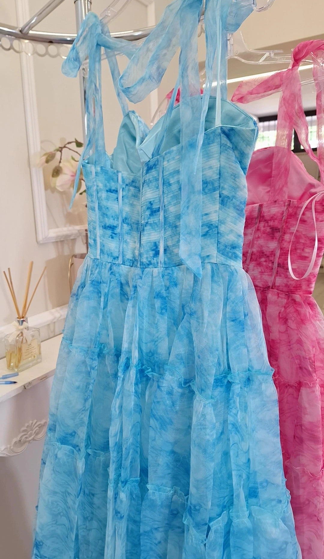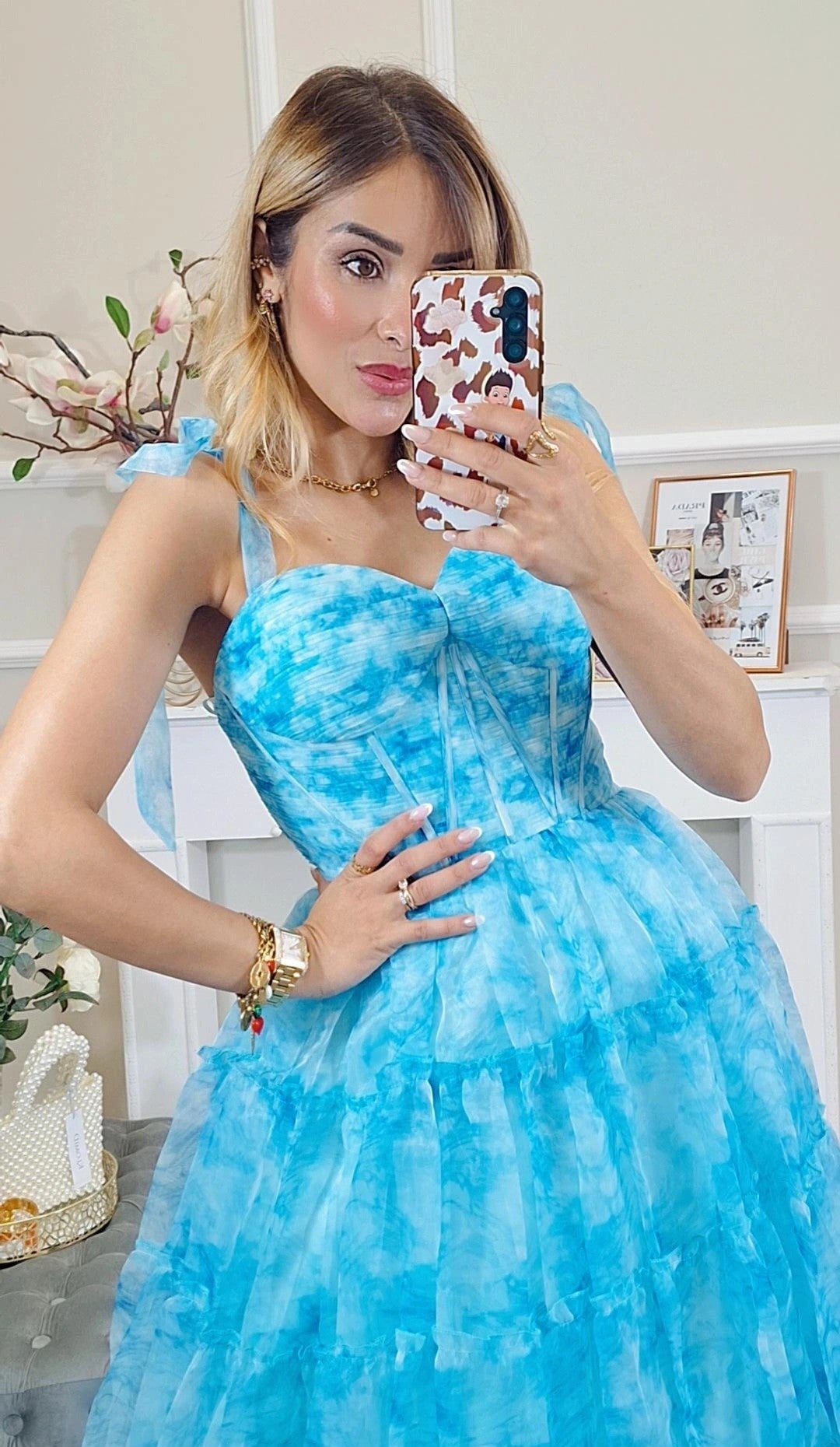 Abito da cerimonia Kassie - Abito lungo in fantasia con gonna ampia a balze e parte superiore a corsetto plissettato con spalline regolabili.