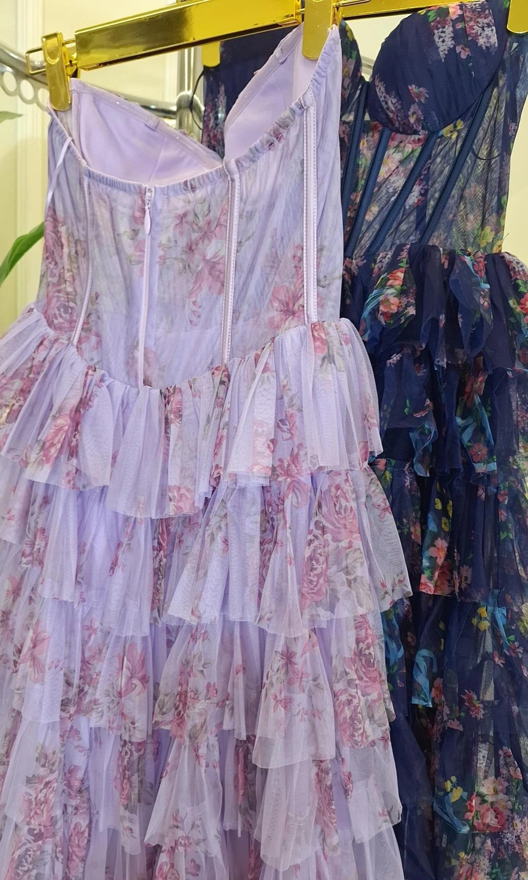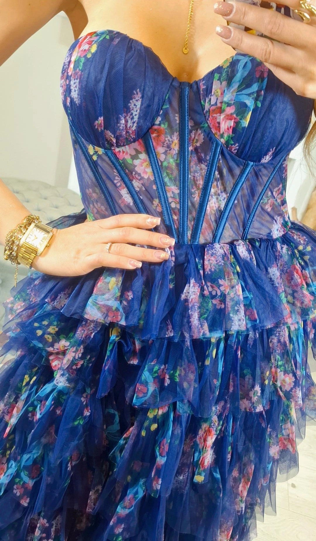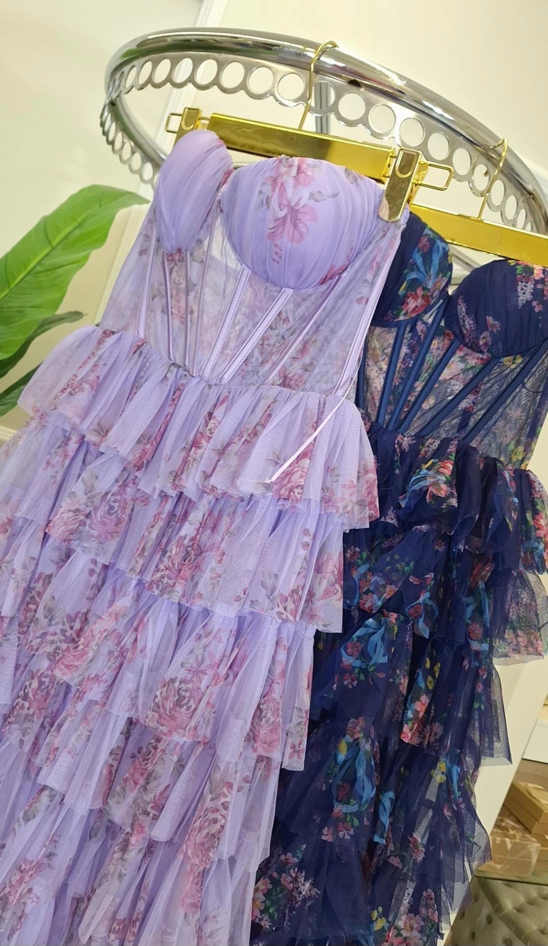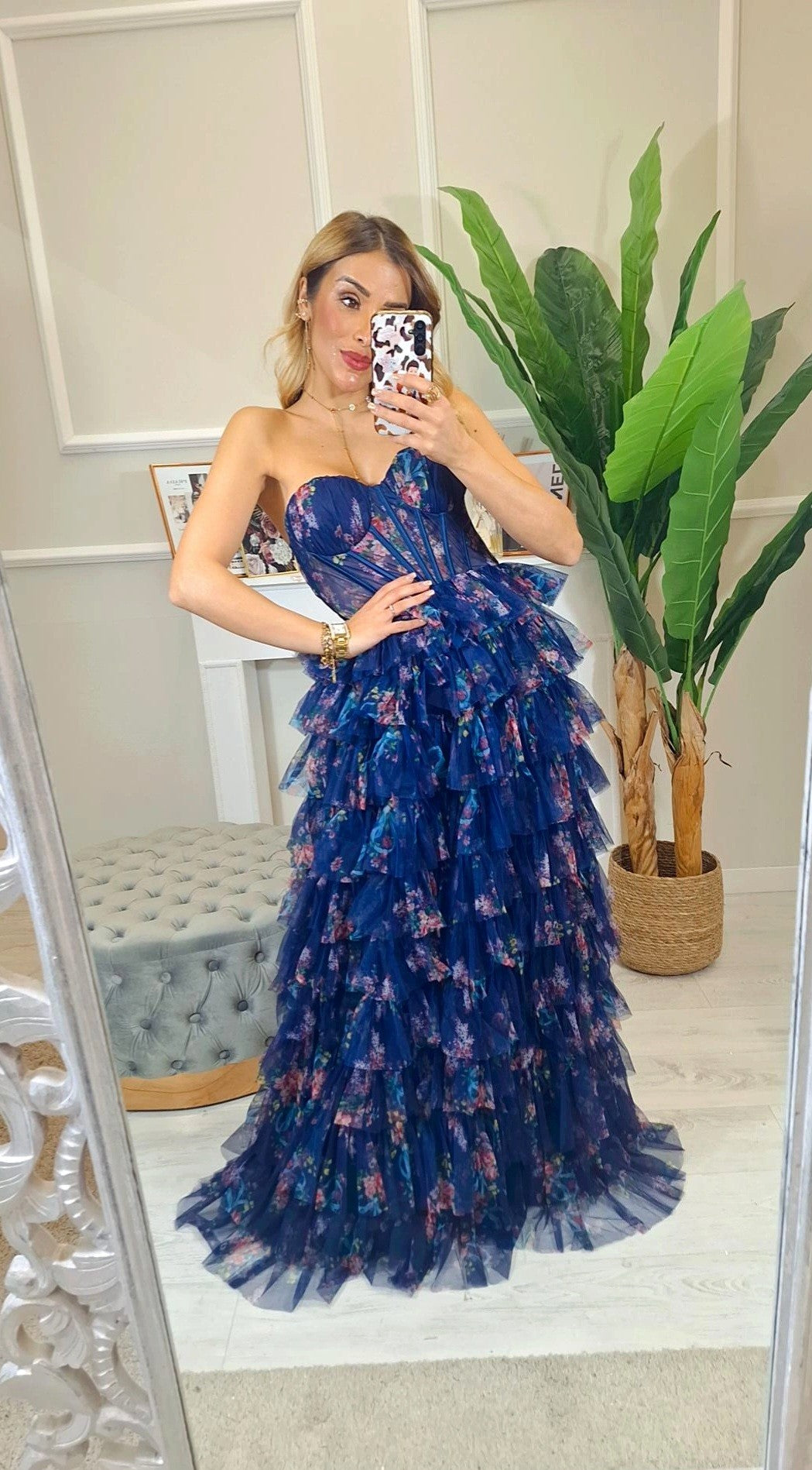 Abito Da Cerimonia Victoria- Abito da cerimonia in fantasia floreale, con parte superiore con scollo a cuore, effetto corsetto con stecche, parte inferiore a balze. Dotato di spalline