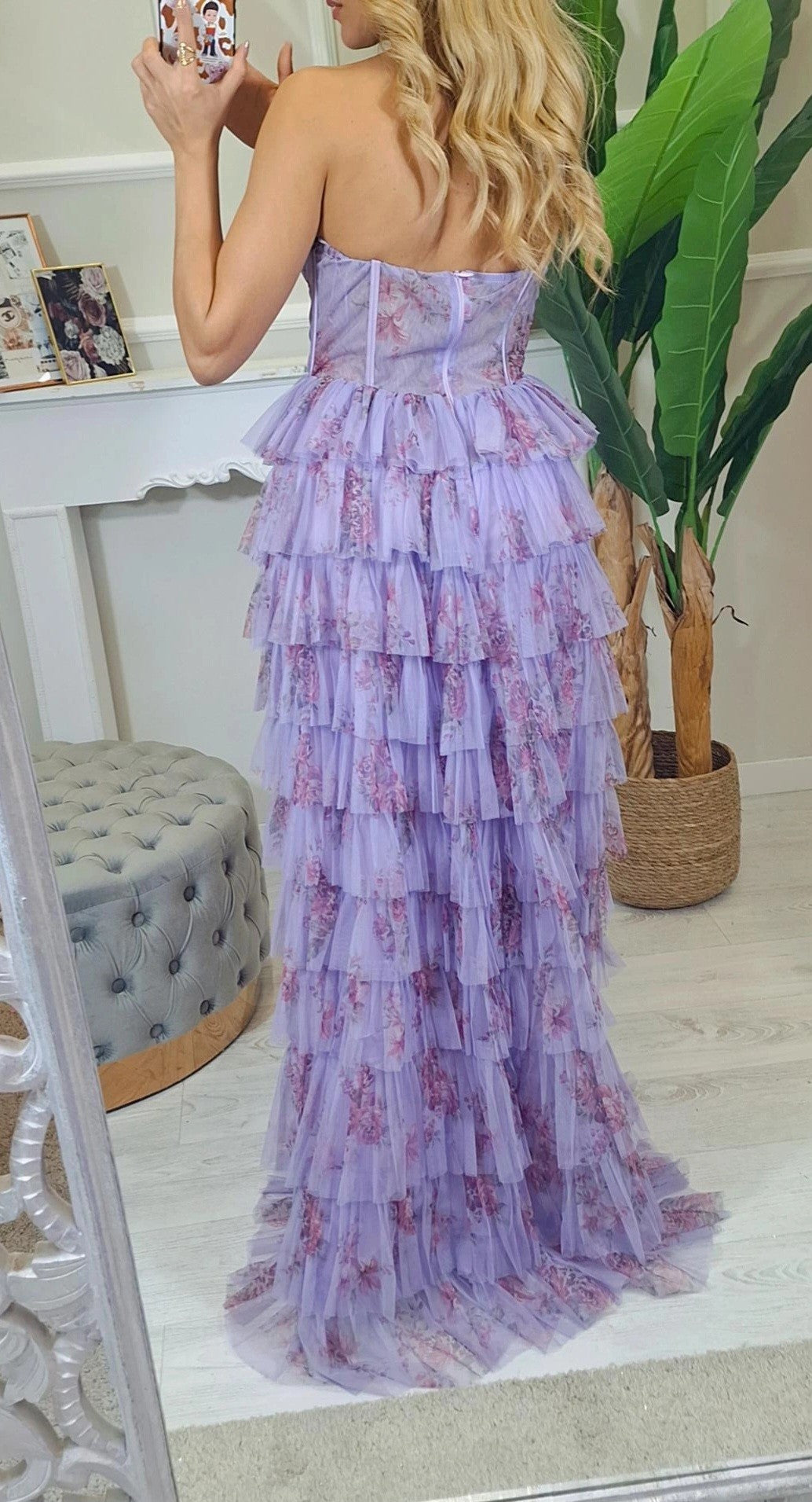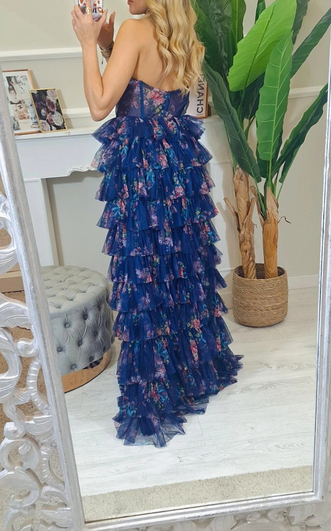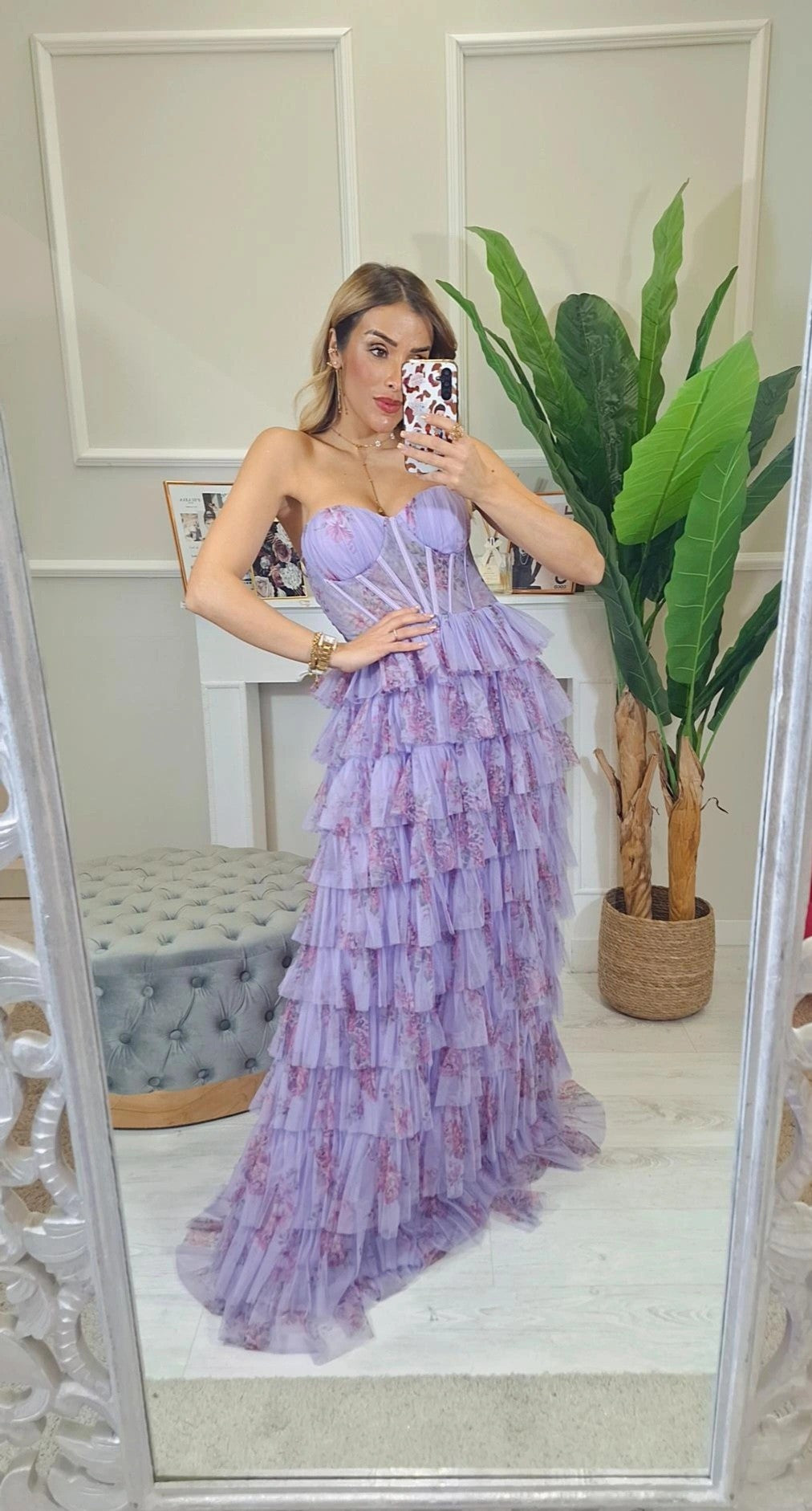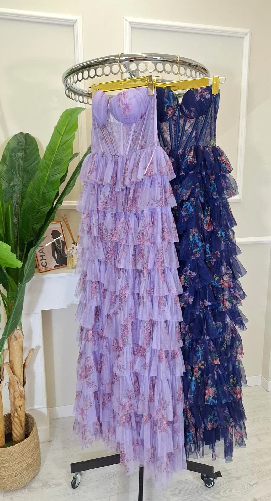 Abito Da Cerimonia Victoria- Abito da cerimonia in fantasia floreale, con parte superiore con scollo a cuore, effetto corsetto con stecche, parte inferiore a balze. Dotato di spalline