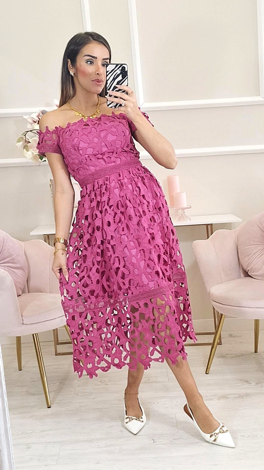 Abito Denali - Abito midi in macramè con gonna a campana e scollo a barchetta