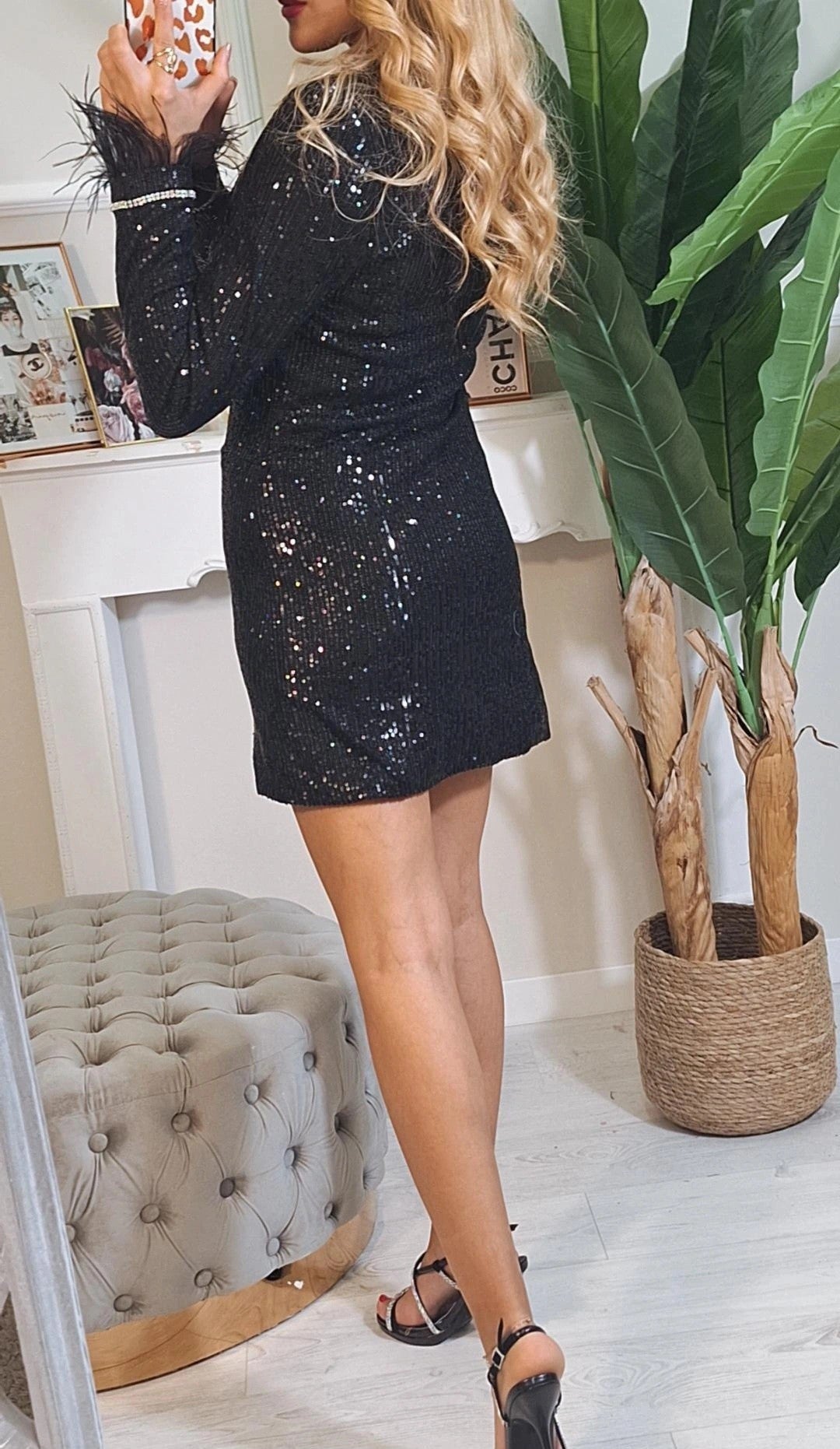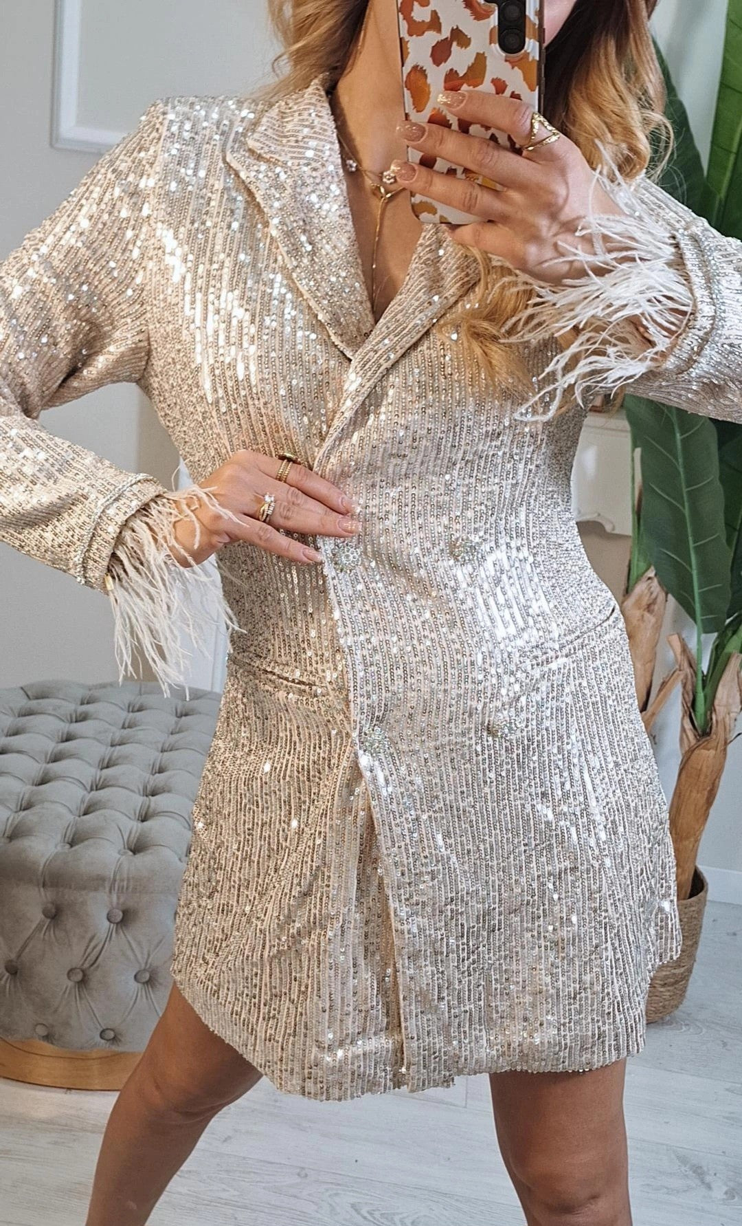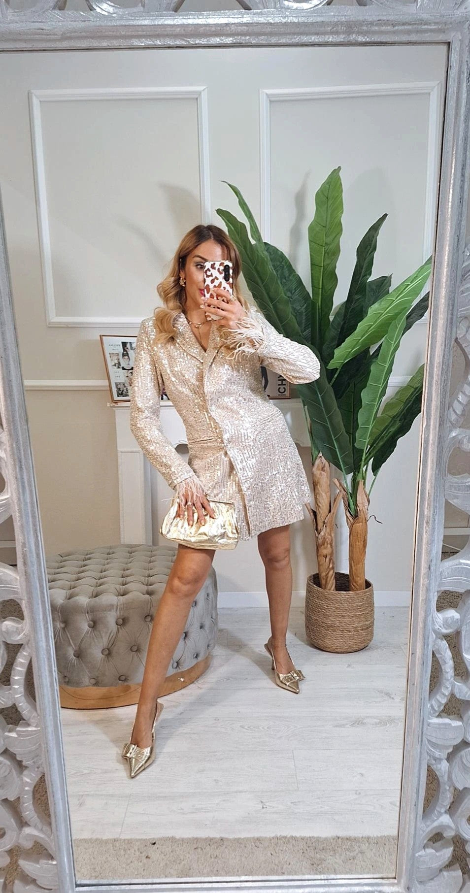 Abito Giacca Amina- Abito giacca foderata in paillettes con bottoni gioiello, strass e piume sui polsini