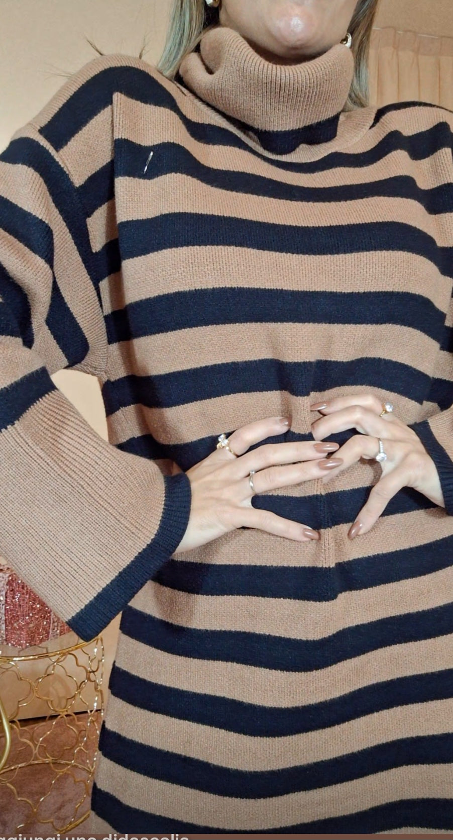 Abito Ketty in maglia a strisce orizzontali con silhouette oversize che garantisce comfort e libertà di movimento. Caratterizzato da un dolcevita morbido e avvolgente, perfetto per le stagioni fredde, e da eleganti spacchi laterali che aggiungono dinamismo al design. Un capo versatile che combina praticità e stile, ideale per chi ricerca un equilibrio tra comodità e ricercatezza estetica.