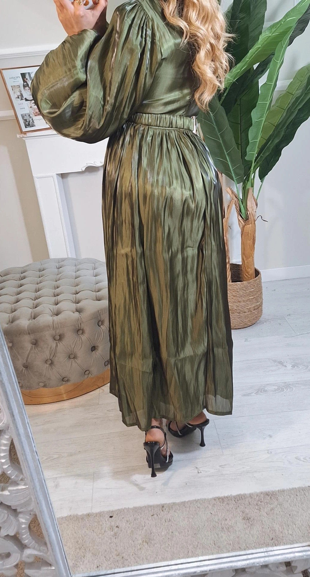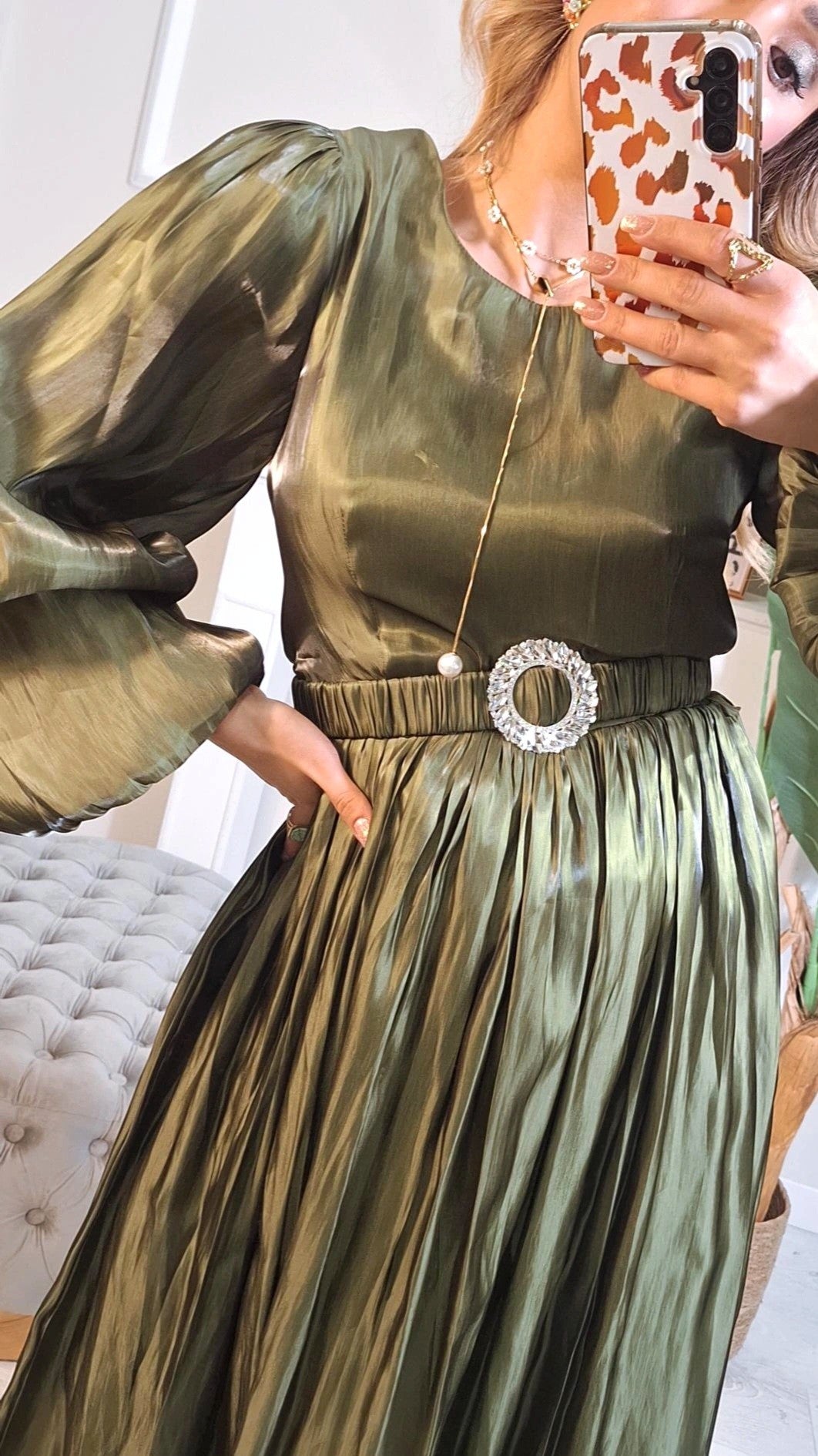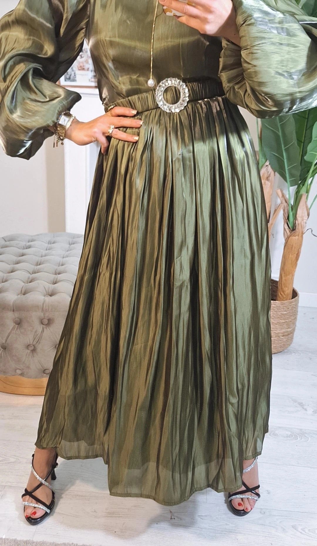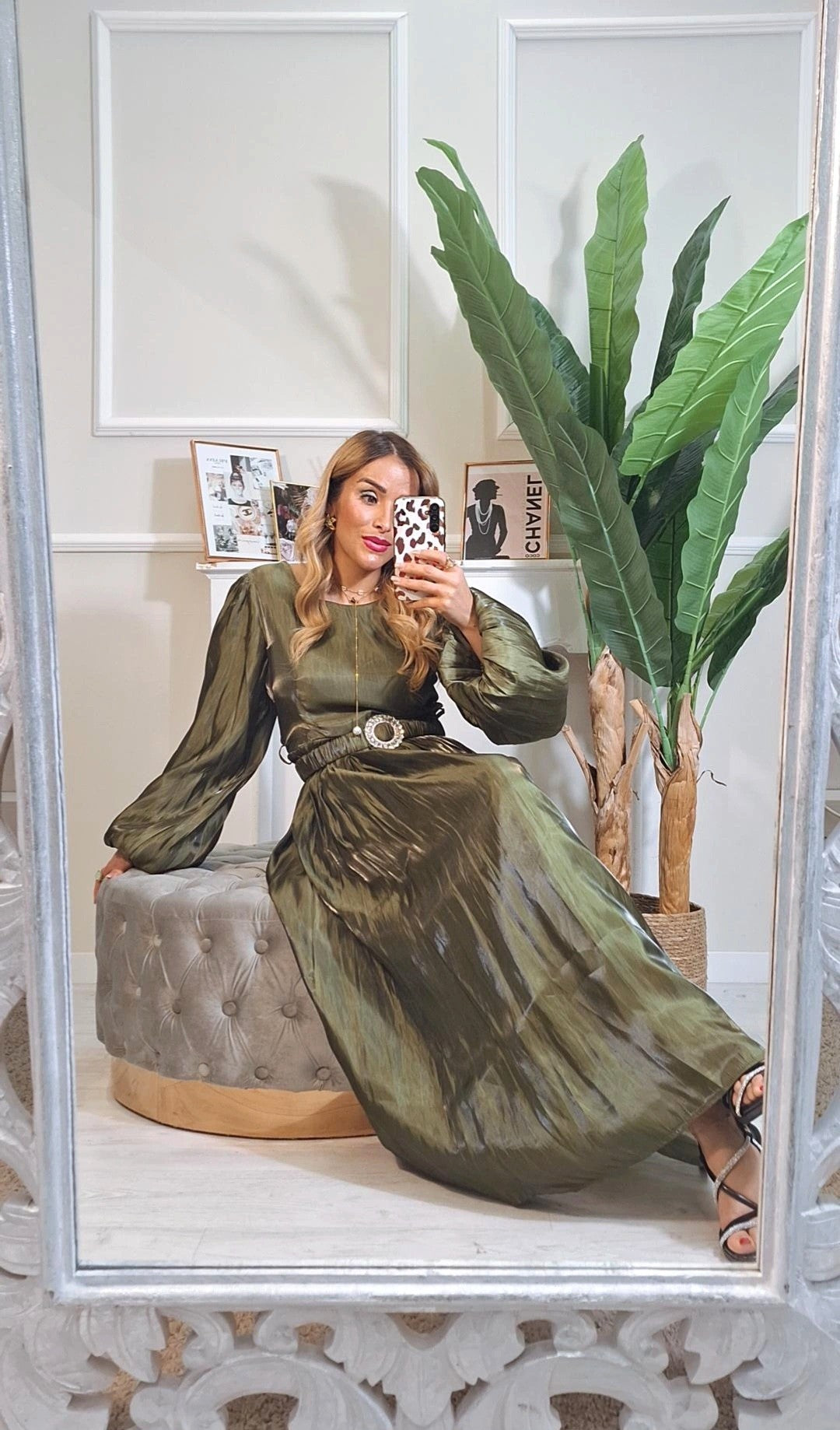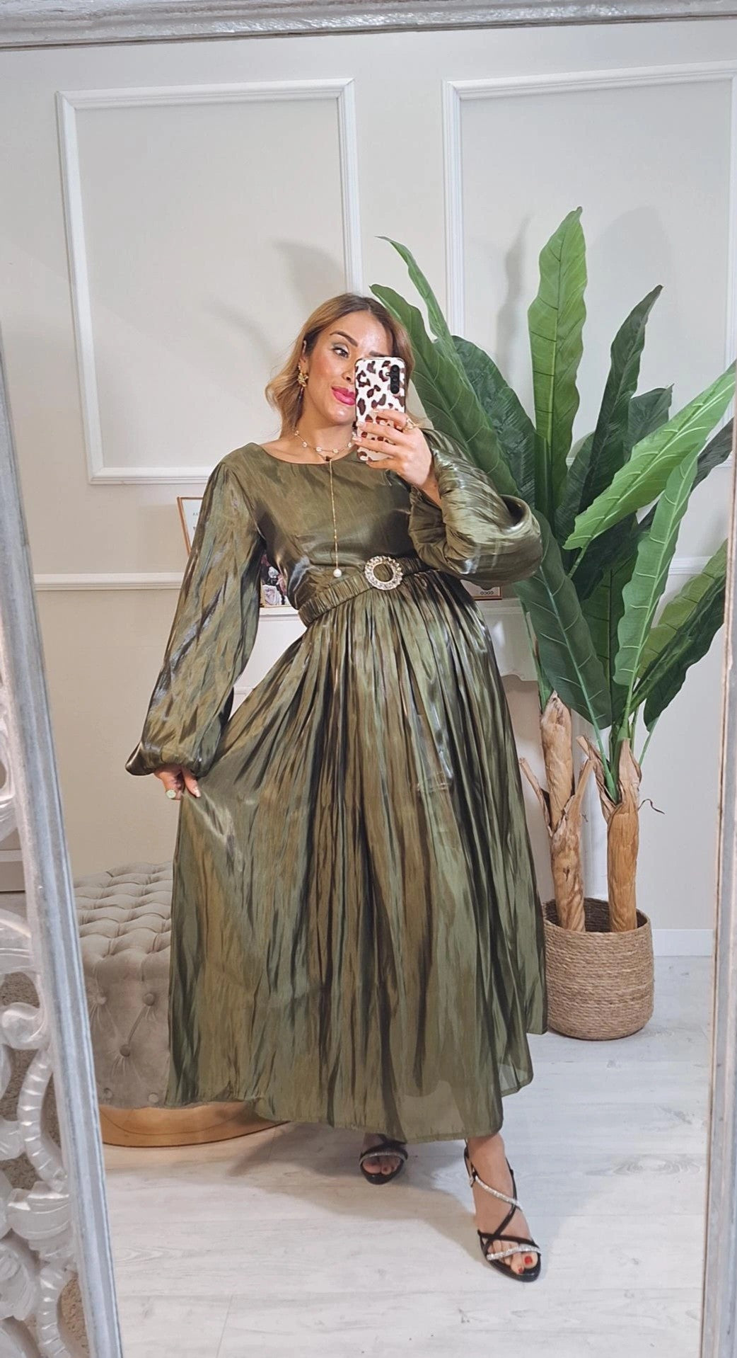 Abito Leslie-abito lungo semi-lucido con scollo girocollo, maniche lunghe e cintura elastica in vita con medaglione gioiello argentato.