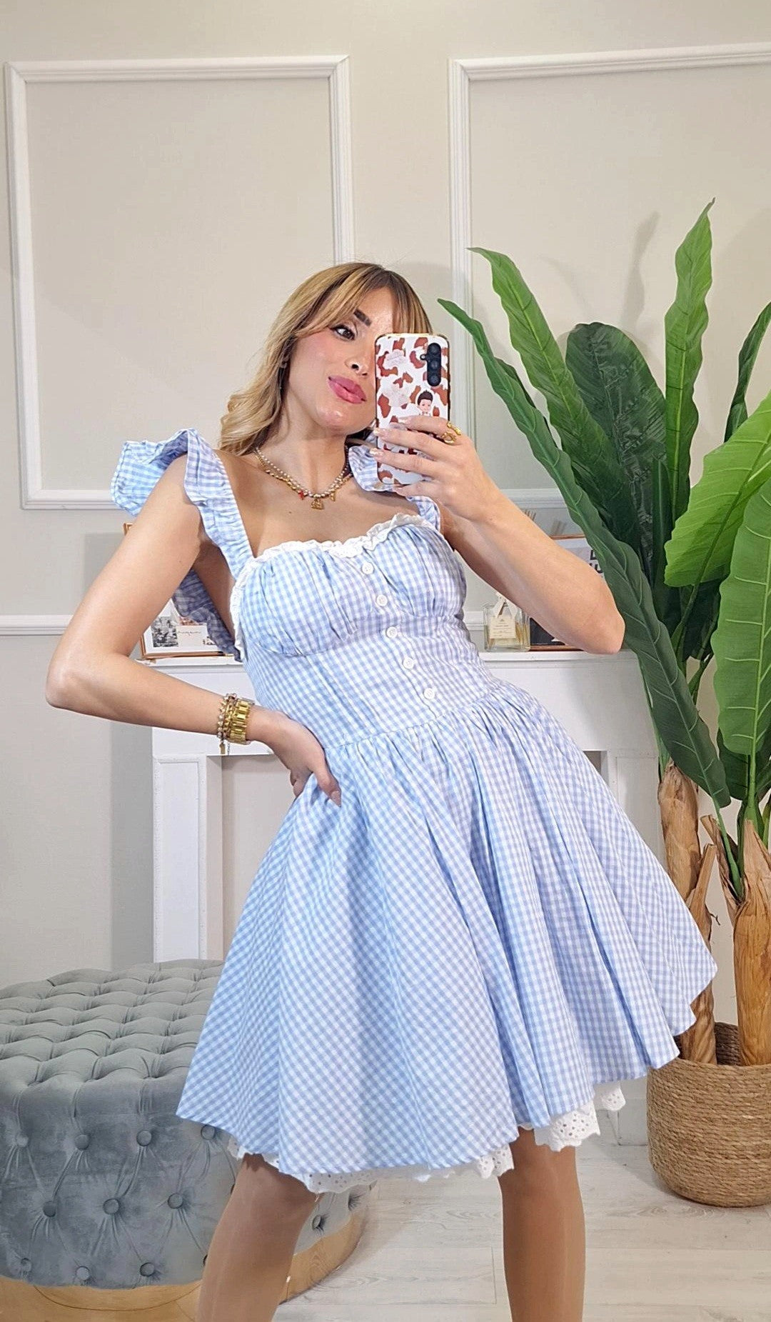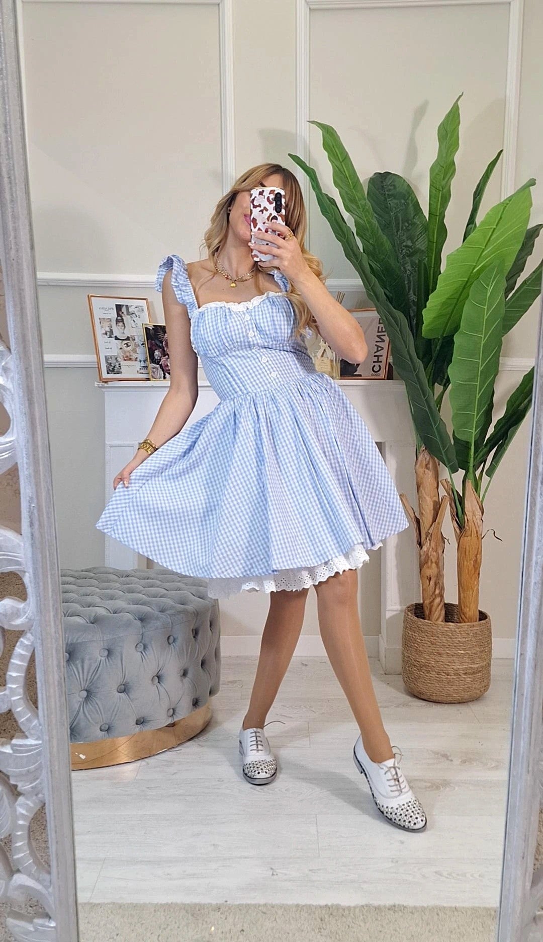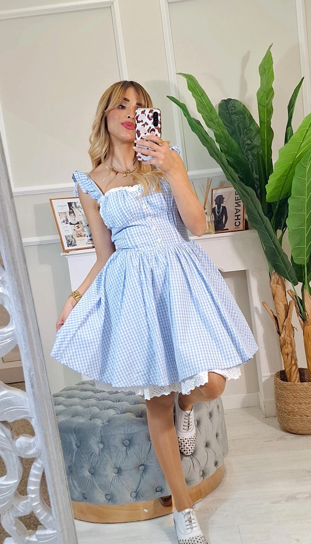 Abito Merida- Abito in fantasia unica con inserti in pizzo, spalline con la rouge, gonna a palloncino, bottoni centrali e cerniera posteriore.