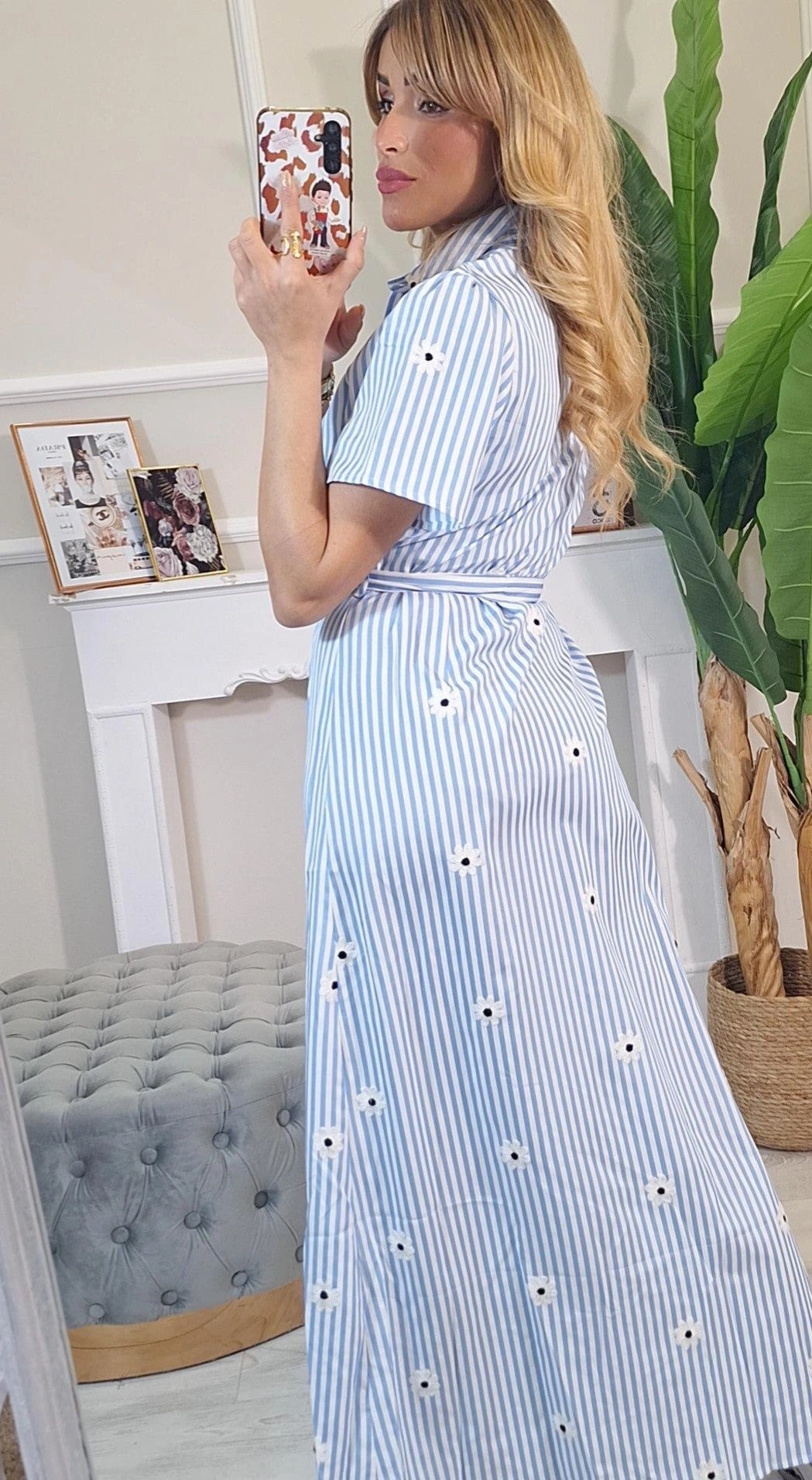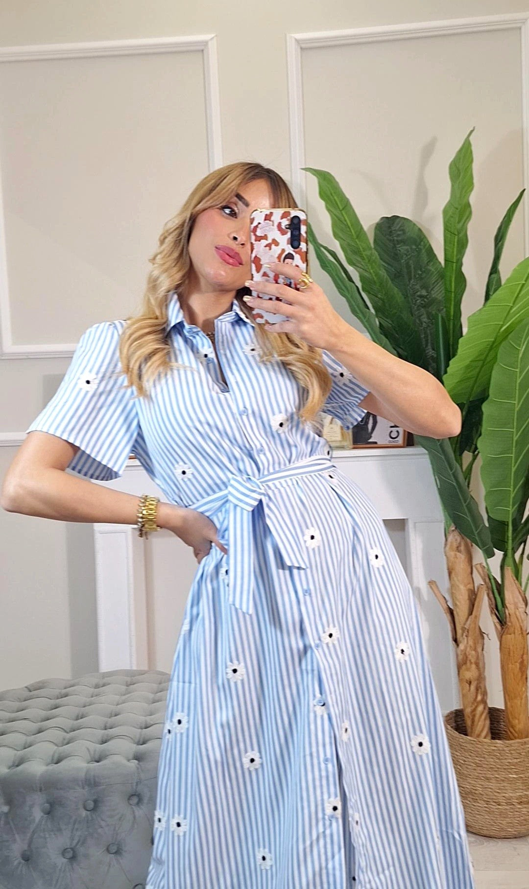 Abito Sun- Abito midi a righe e fantasia margherite, maniche corte e bottoni centrali. Dotato di cintura