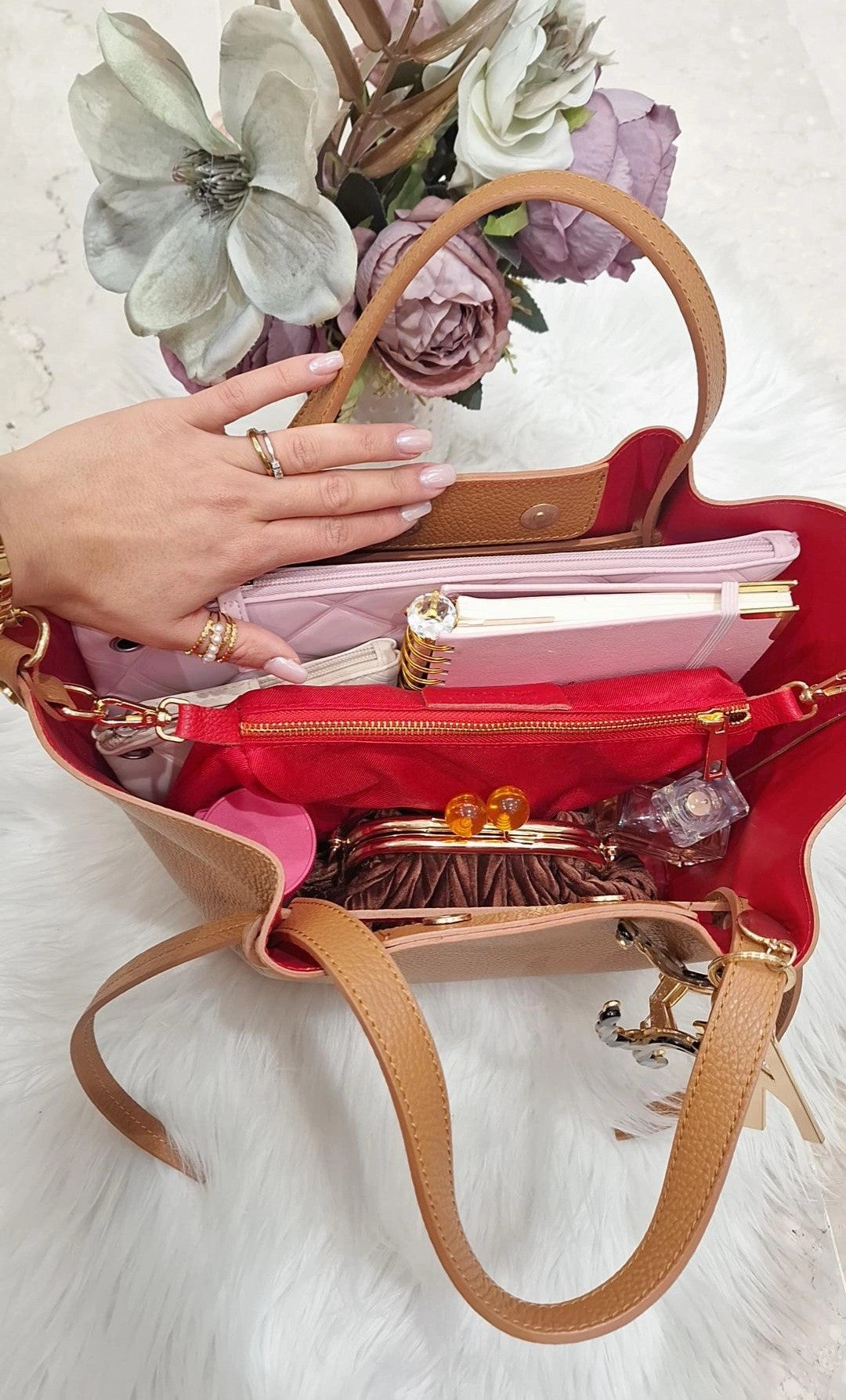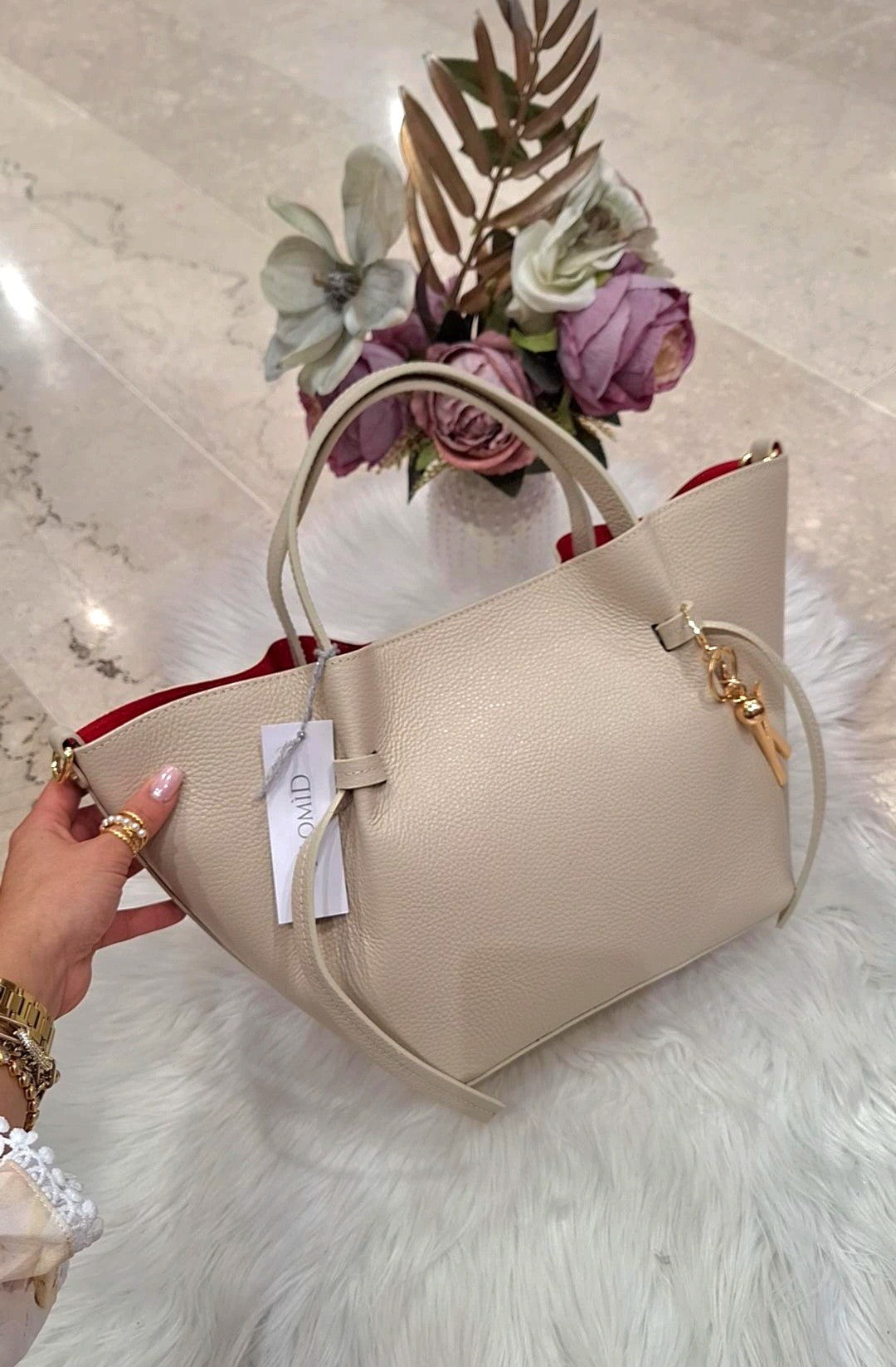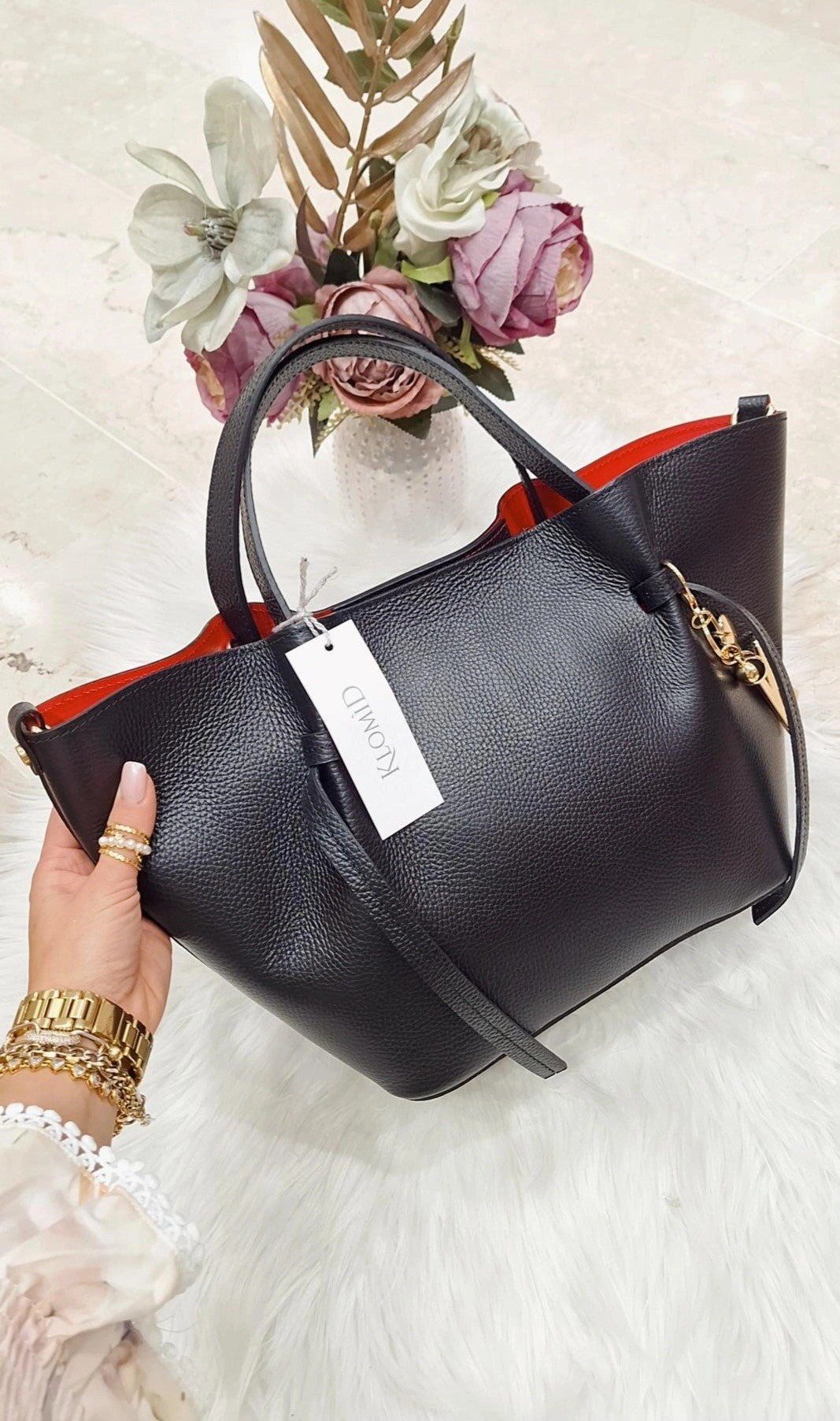 BagKelly Gisella - Borsa in vera pelle con chiusura a doppio bottone. Interno foderato di tessuto rosso. Compreso di beauty rosso agganciabile all'interno della borsa. La borsa viene venduta completa di portachiavi e tracolla applicabile.
