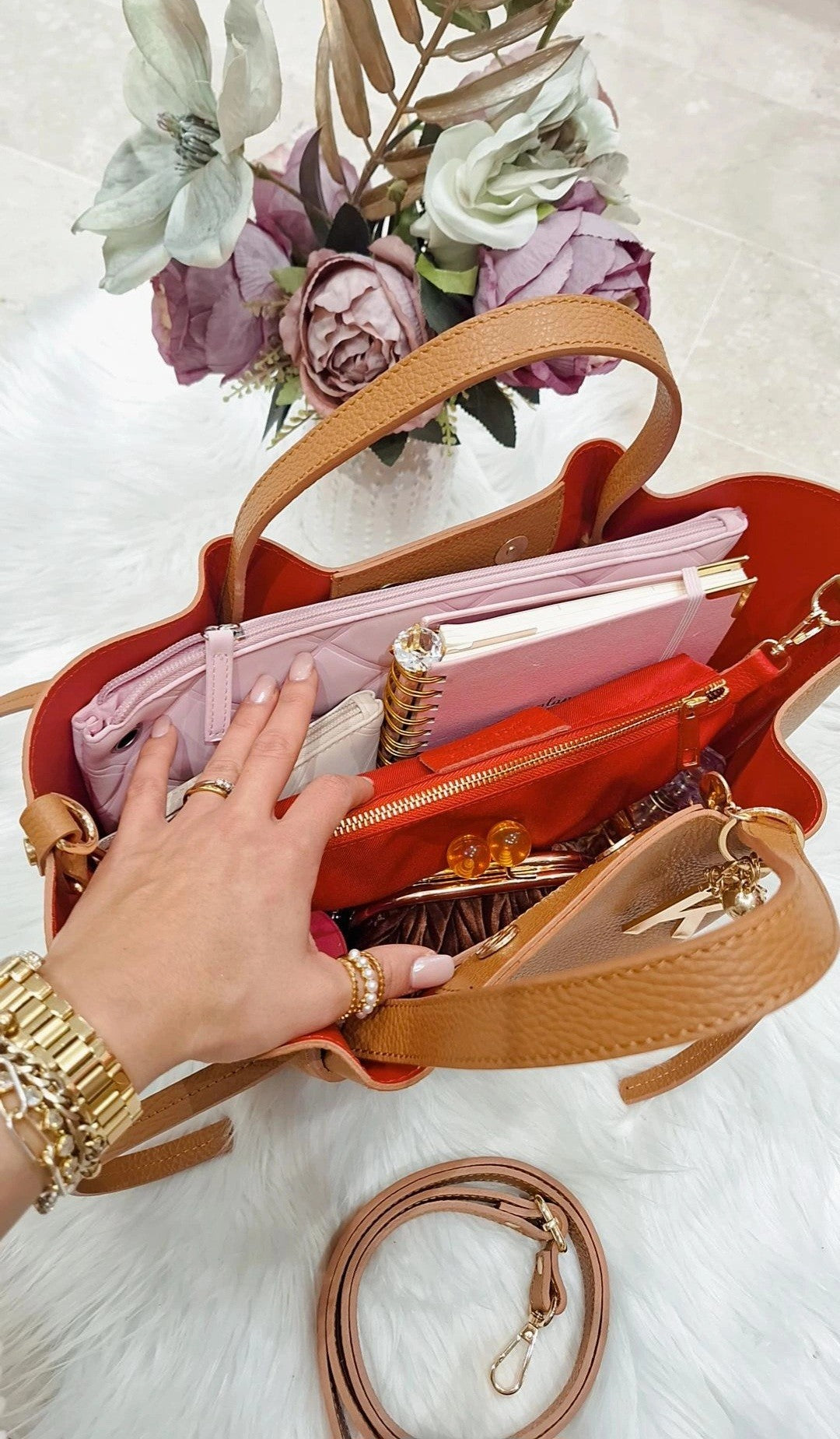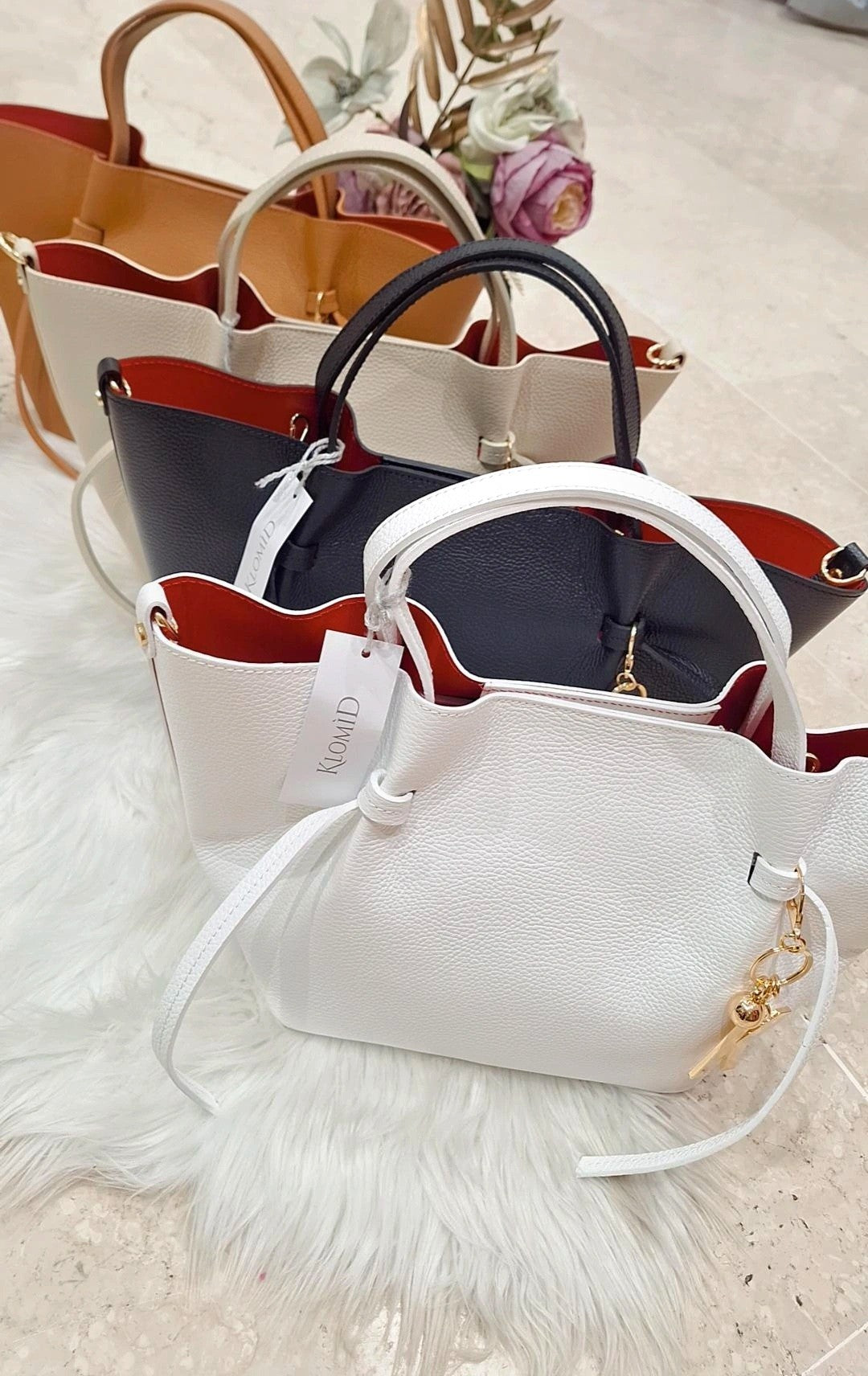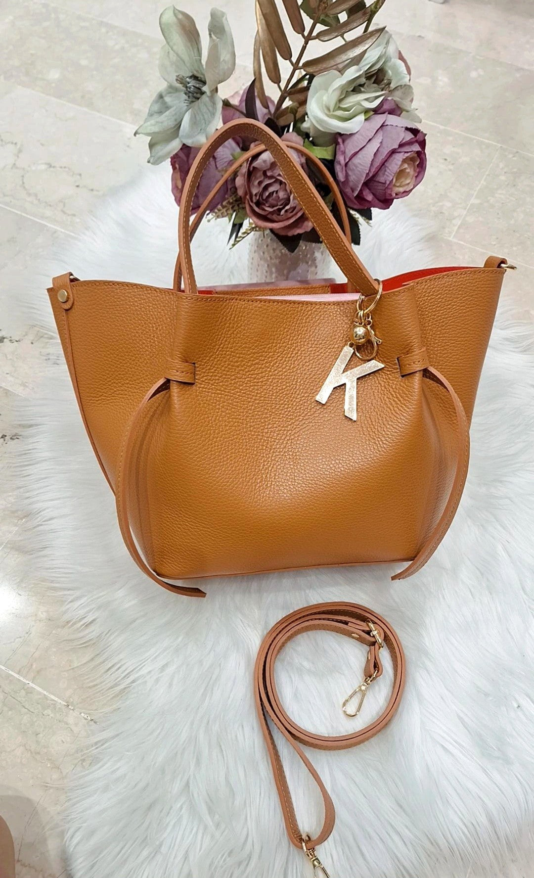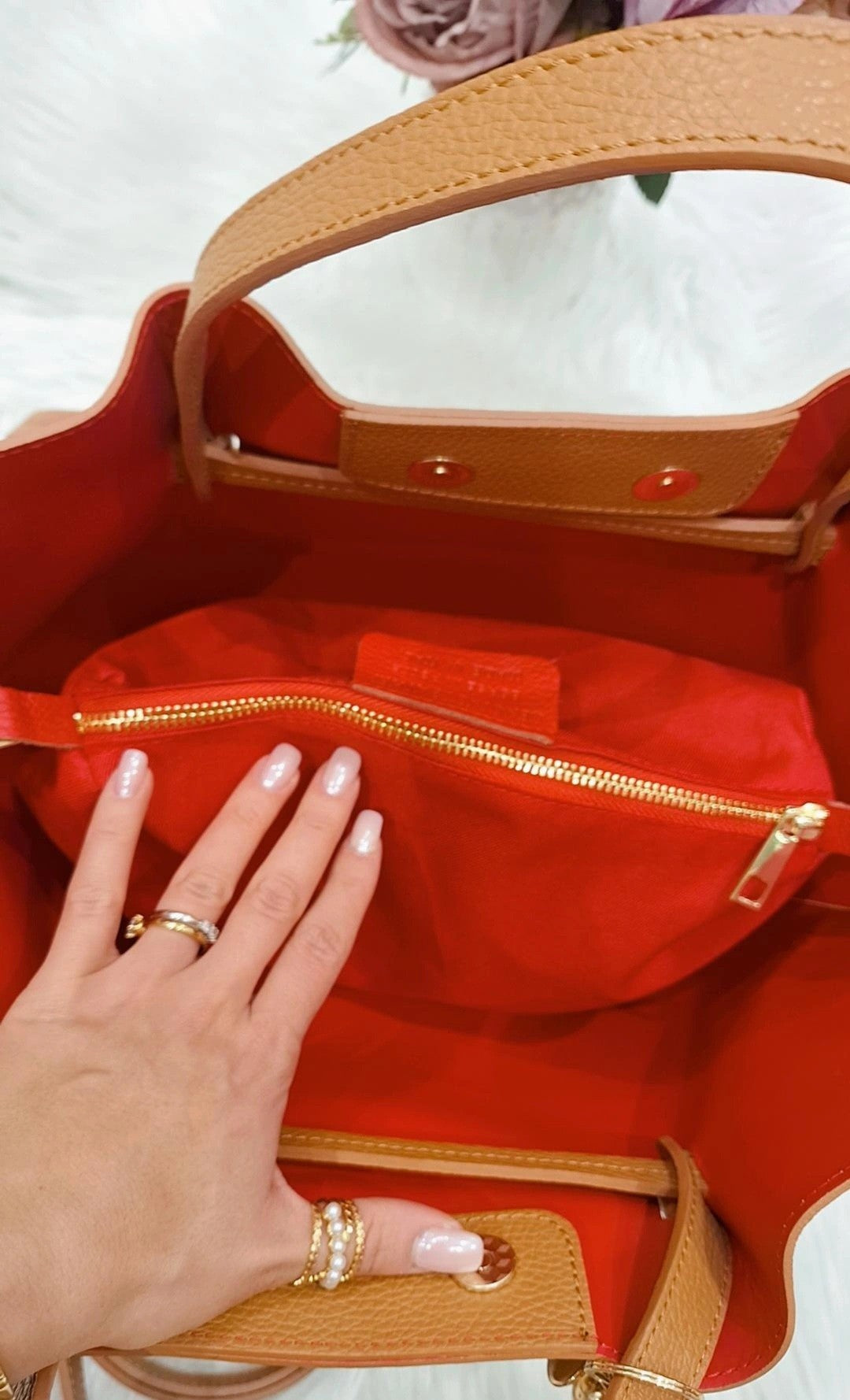 BagKelly Gisella - Borsa in vera pelle con chiusura a doppio bottone. Interno foderato di tessuto rosso. Compreso di beauty rosso agganciabile all'interno della borsa. La borsa viene venduta completa di portachiavi e tracolla applicabile.