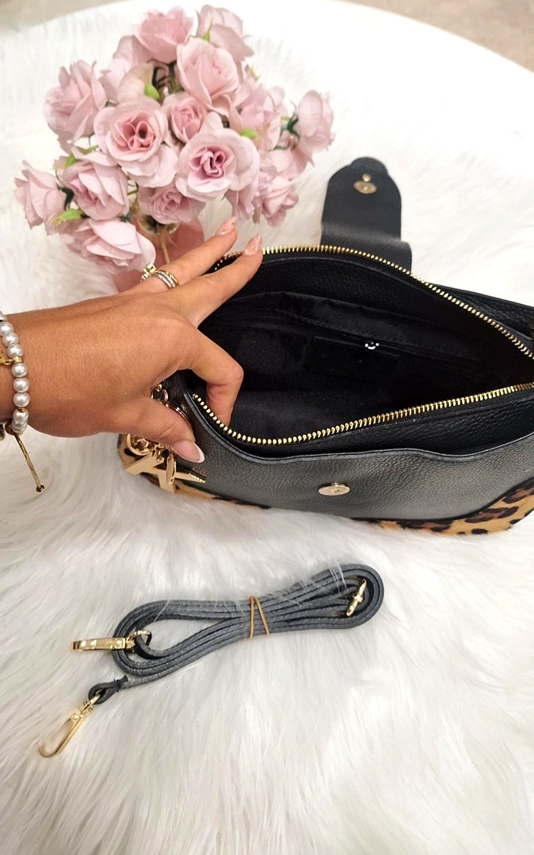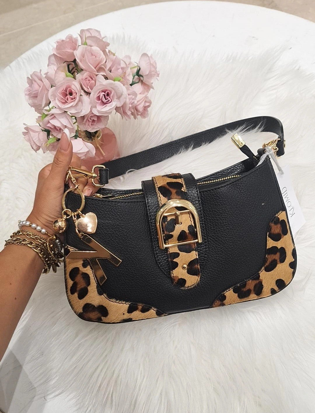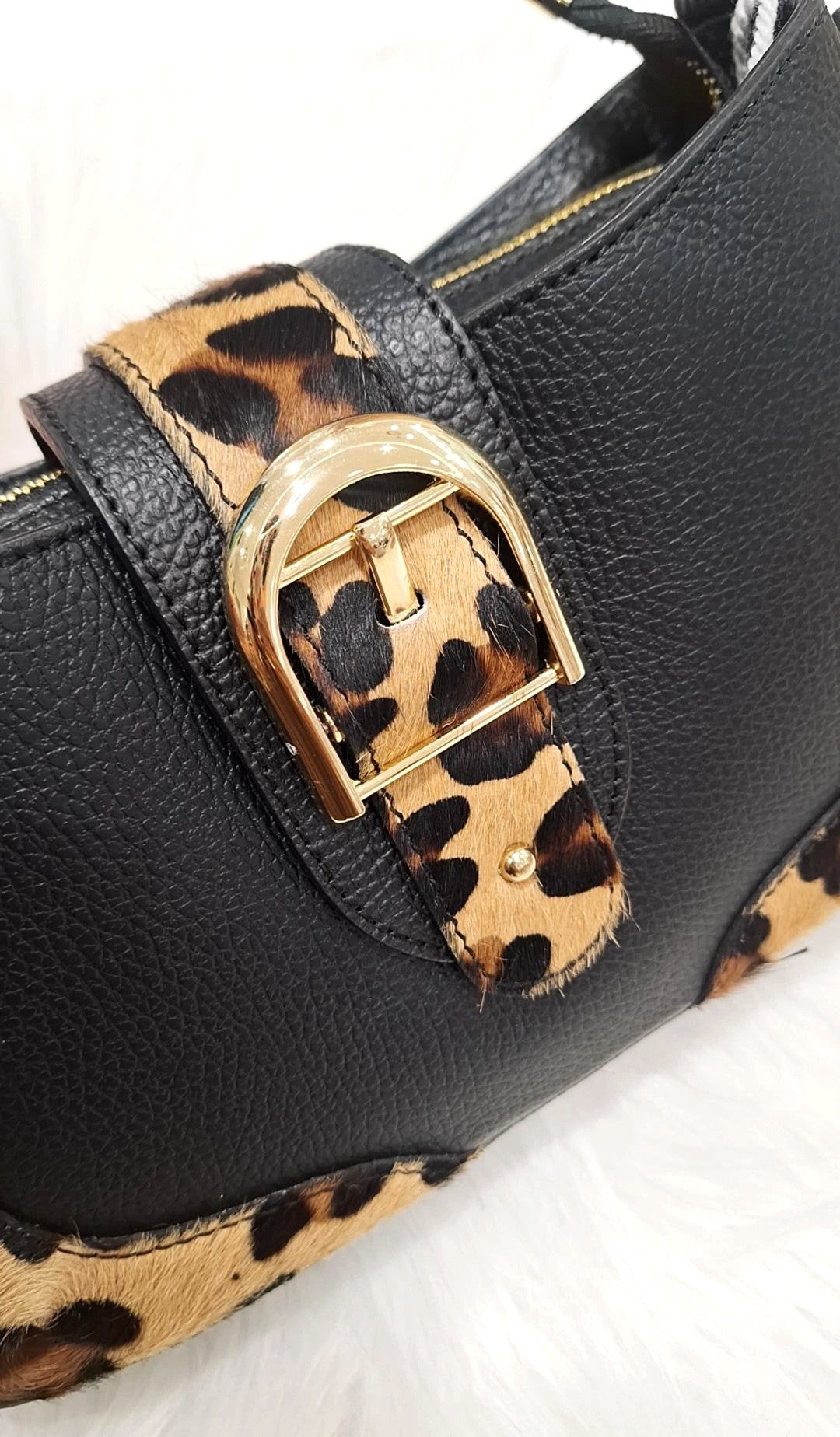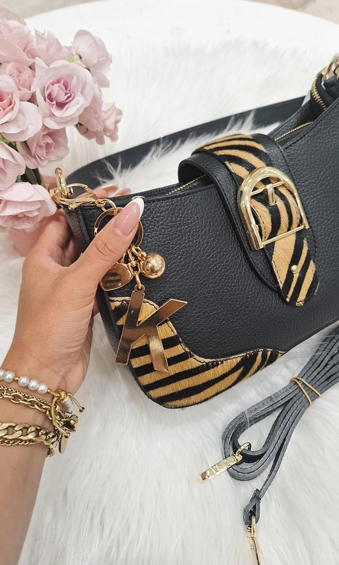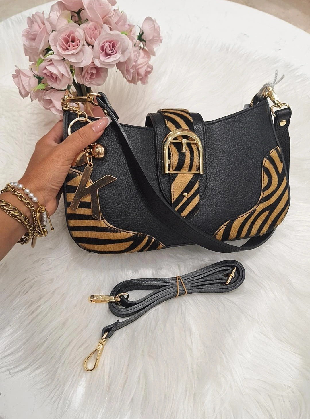 BagKelly Kloe - Borsa a mezzaluna con inserti in cavallino e chiusura con cerniera e fibbia dorata. Inclusa tracolla applicabile.