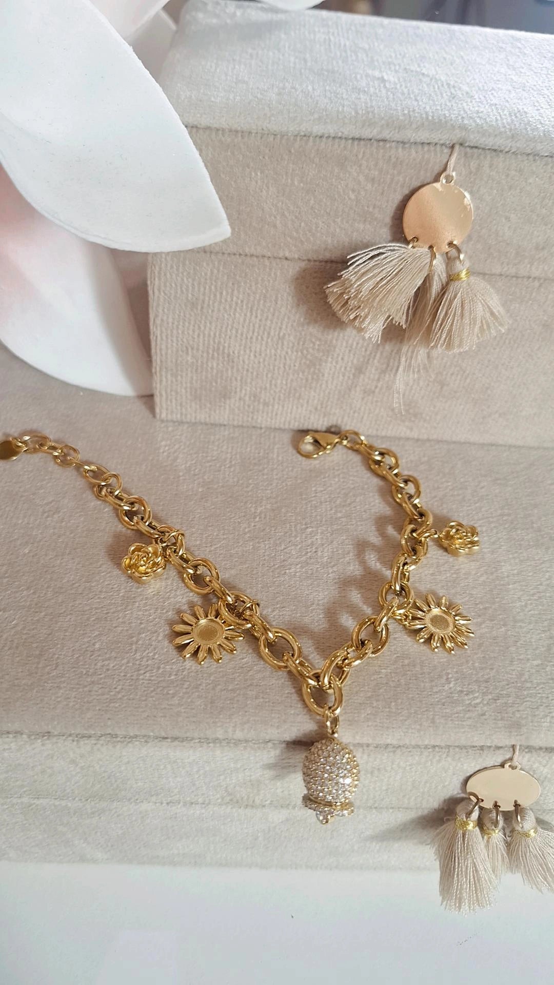 Il bracciale Holly unisce eleganza e femminilità con la sua raffinata catena impreziosita da charms floreali delicati. Il charm centrale, arricchito da una brillante copertura di strass, cattura la luce donando un tocco di luminosità sofisticata. Un accessorio versatile e distintivo, ideale per completare con stile ogni look.