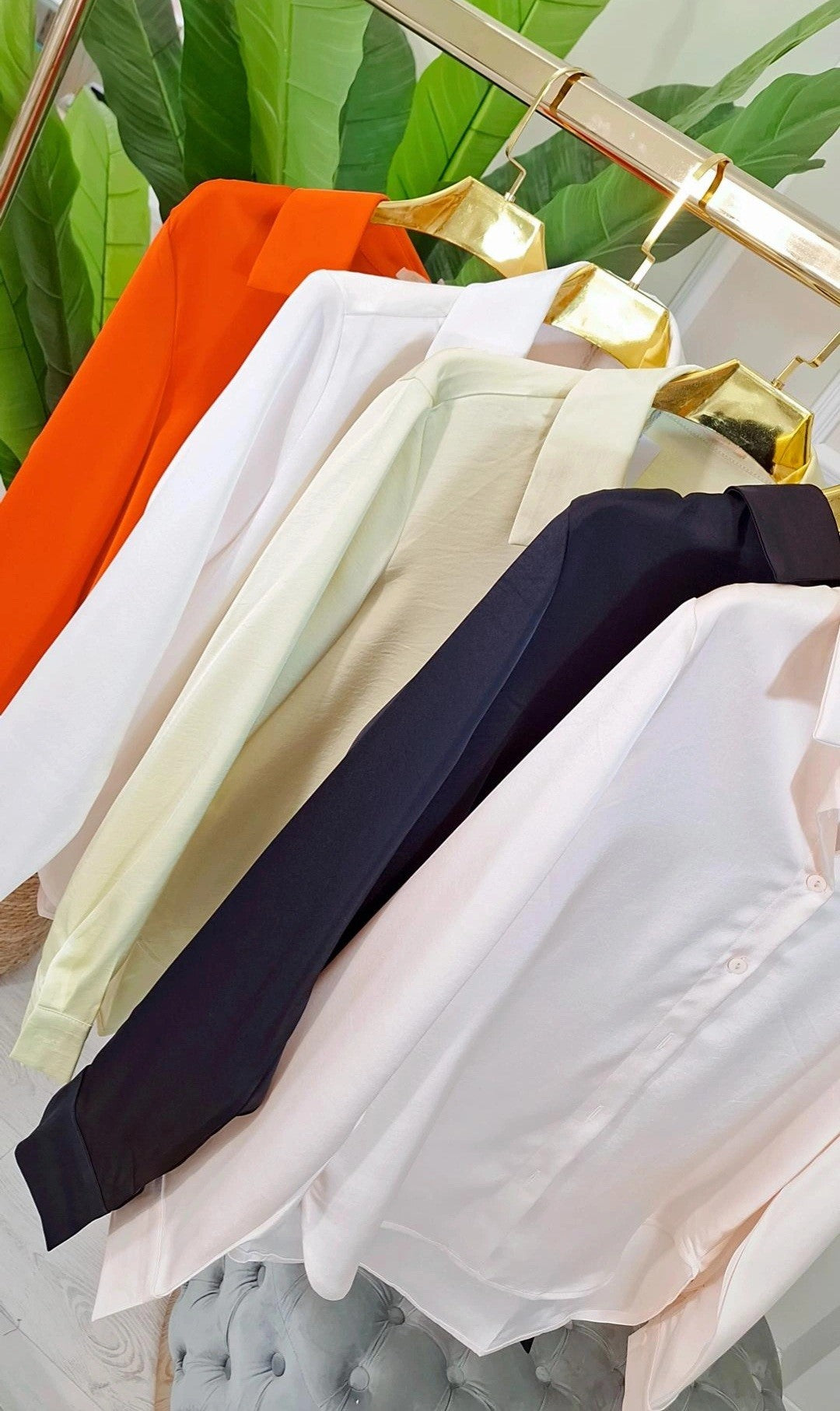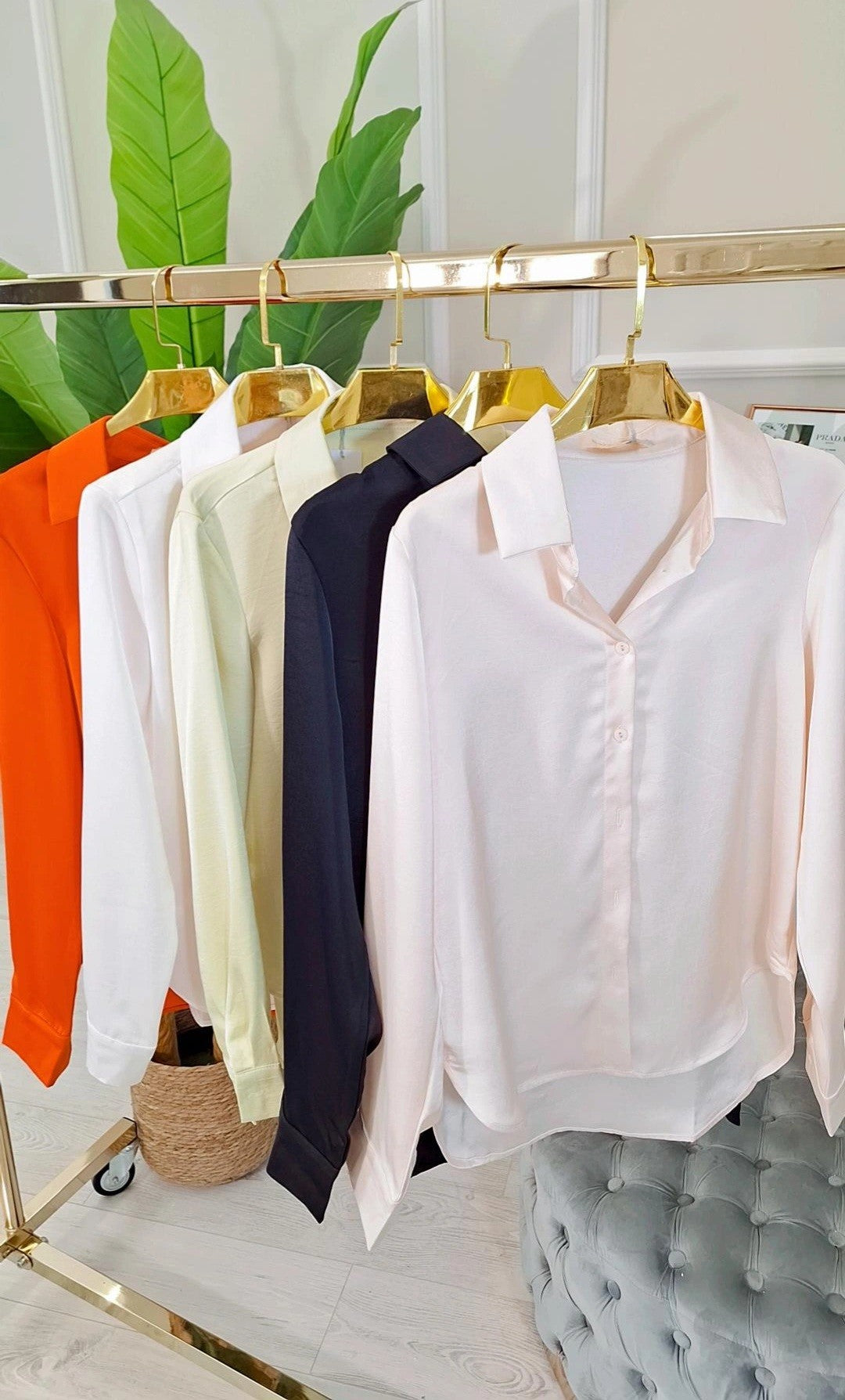 Camicia Aura-camicia in raso a maniche lunghe, leggermente più lunga dietro.
