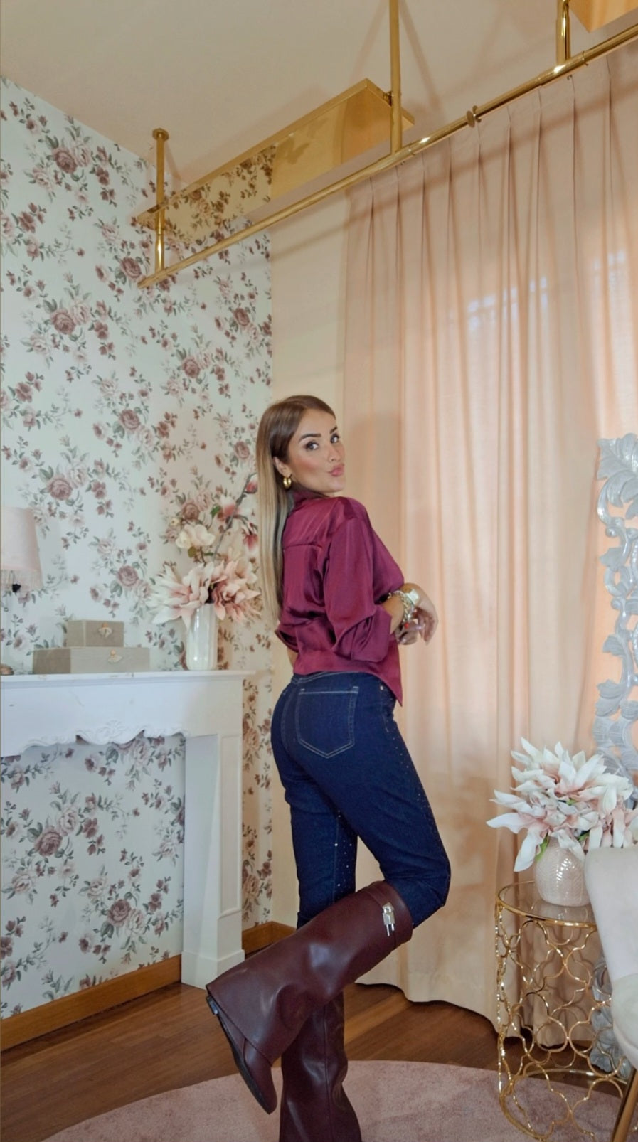 La Camicia Bettie, realizzata in tessuto effetto raso, si distingue per la raffinata chiusura con bottoni gioiello sulla fascia finale. Le maniche leggermente ampie donano un equilibrio perfetto tra eleganza e comfort, rendendola una scelta ideale per un look sofisticato e contemporaneo.