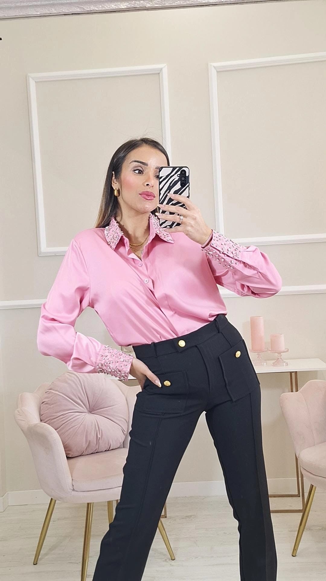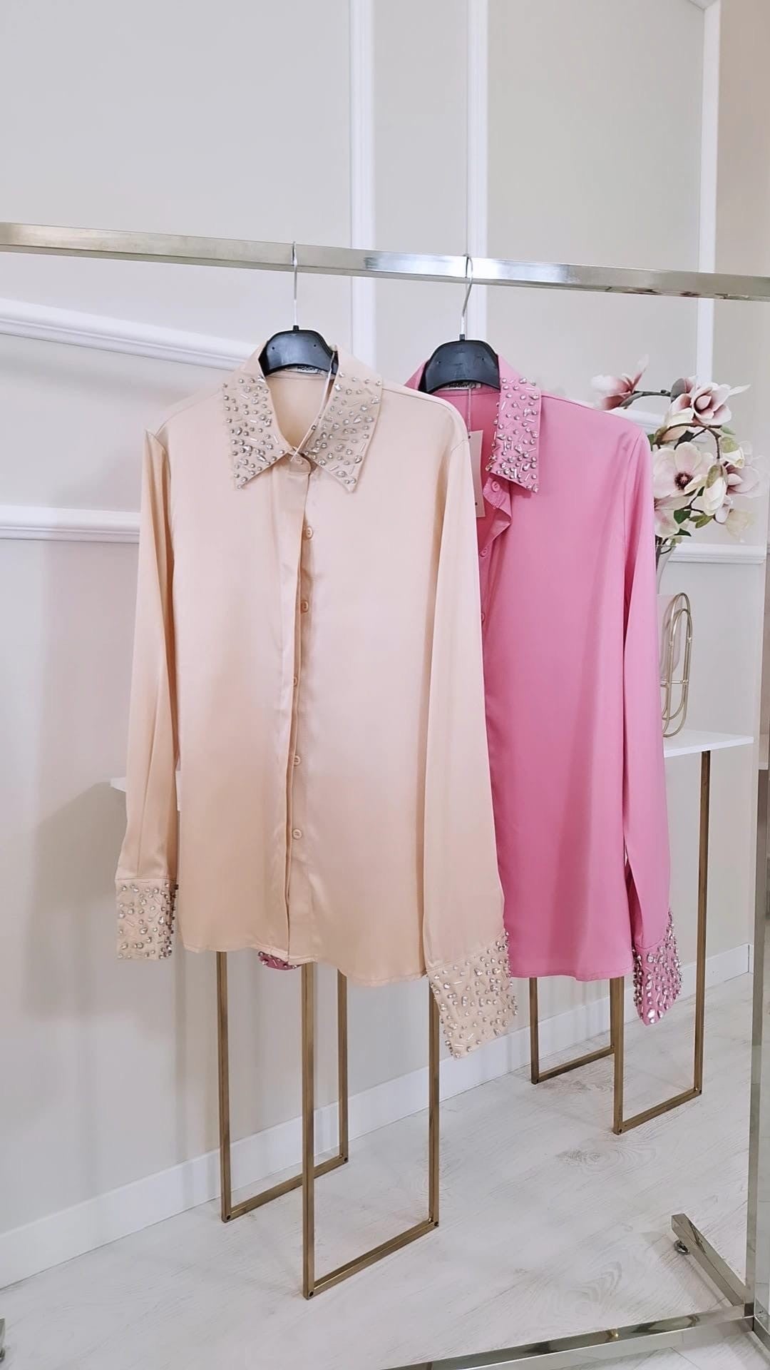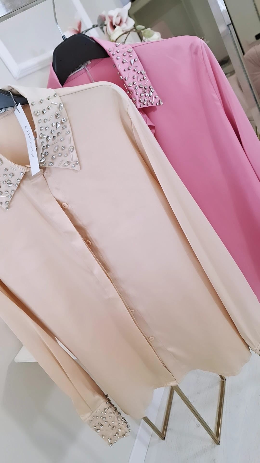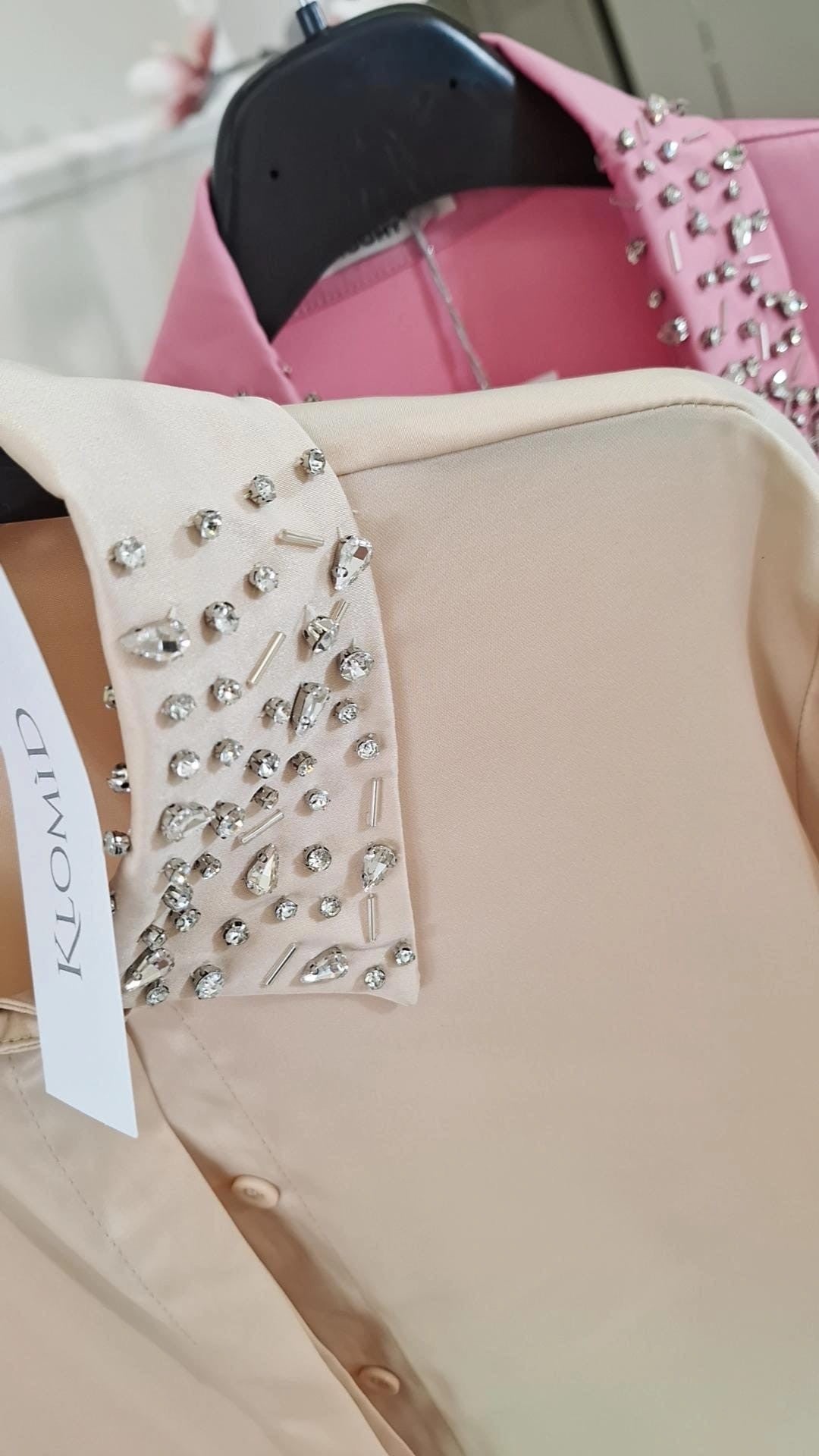 Camicia Kathleen - Camicia tinta unita effetto lucido con strass su colletto e polsi