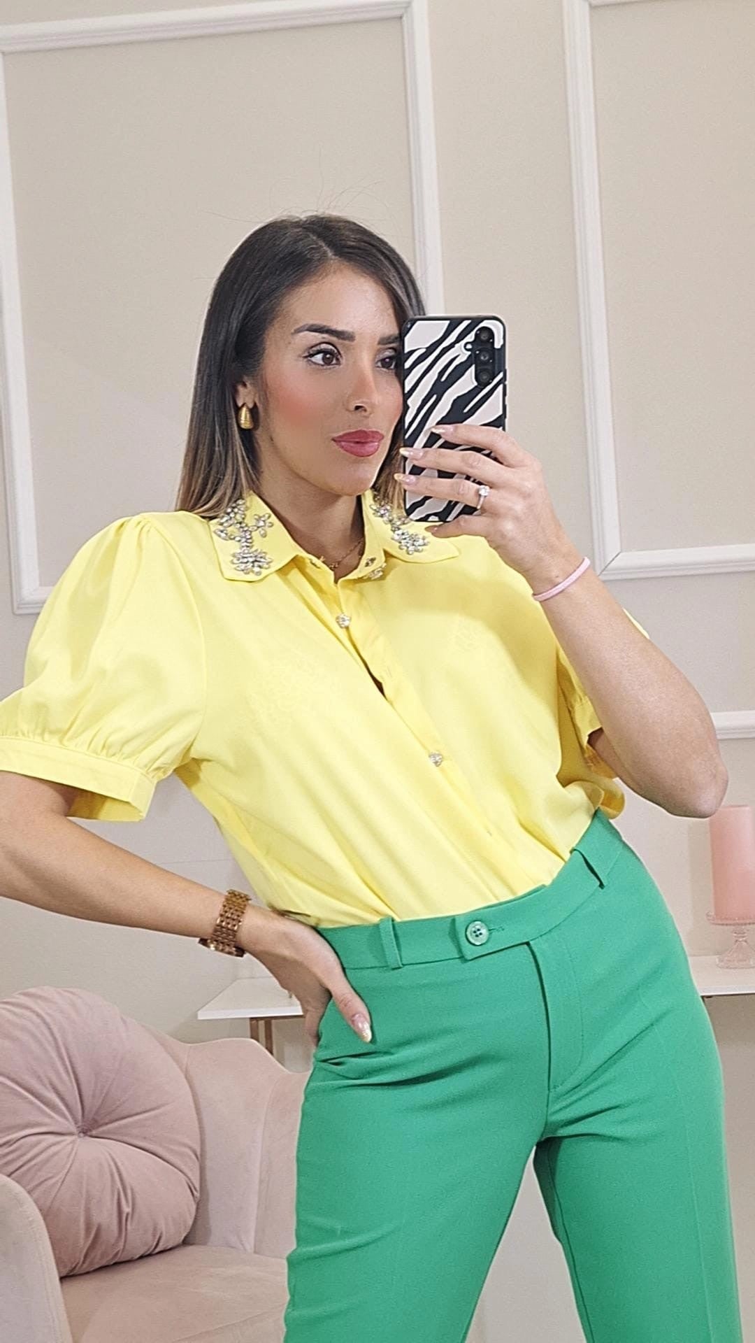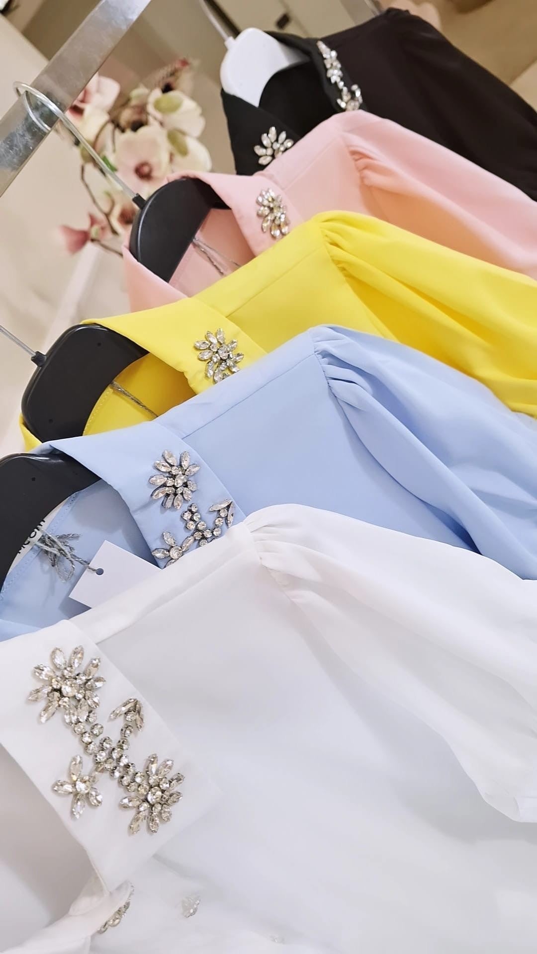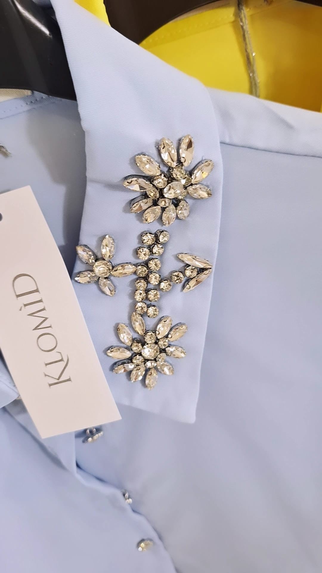 Camicia Raquelle - Camicia a maniche corte effetto lucido con pietre sul colletto e bottoni gioiello