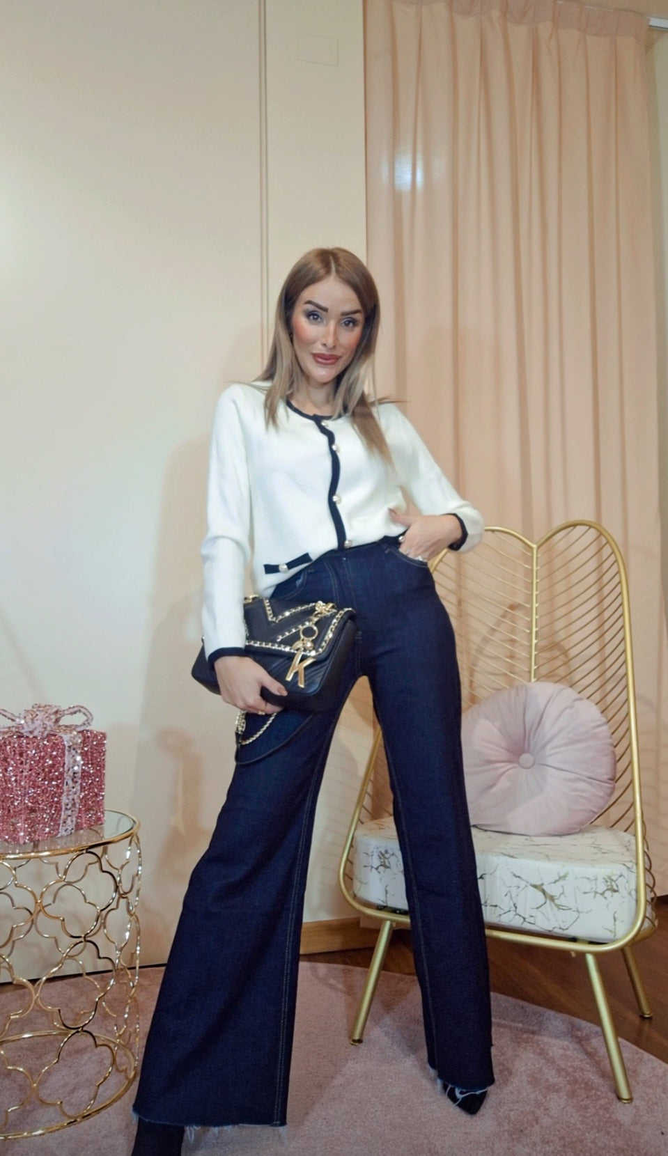 Cardigan Luna è un capo sofisticato che unisce eleganza classica e dettagli contemporanei. Realizzato con cura, presenta rifiniture nere che incorniciano il design con un tocco di contrasto raffinato, mentre i bottoni gioiello aggiungono un elemento di lusso e personalità. Perfetto per elevare qualsiasi outfit, questo cardigan si adatta sia a occasioni formali che a look casual chic.