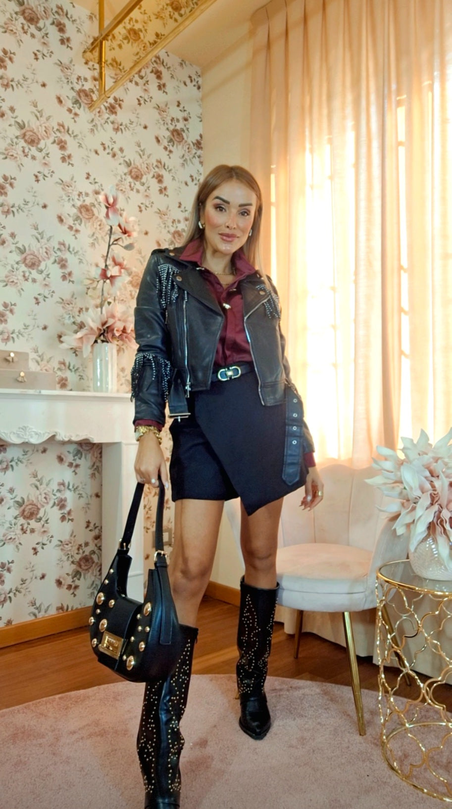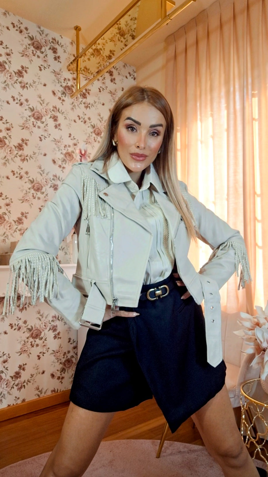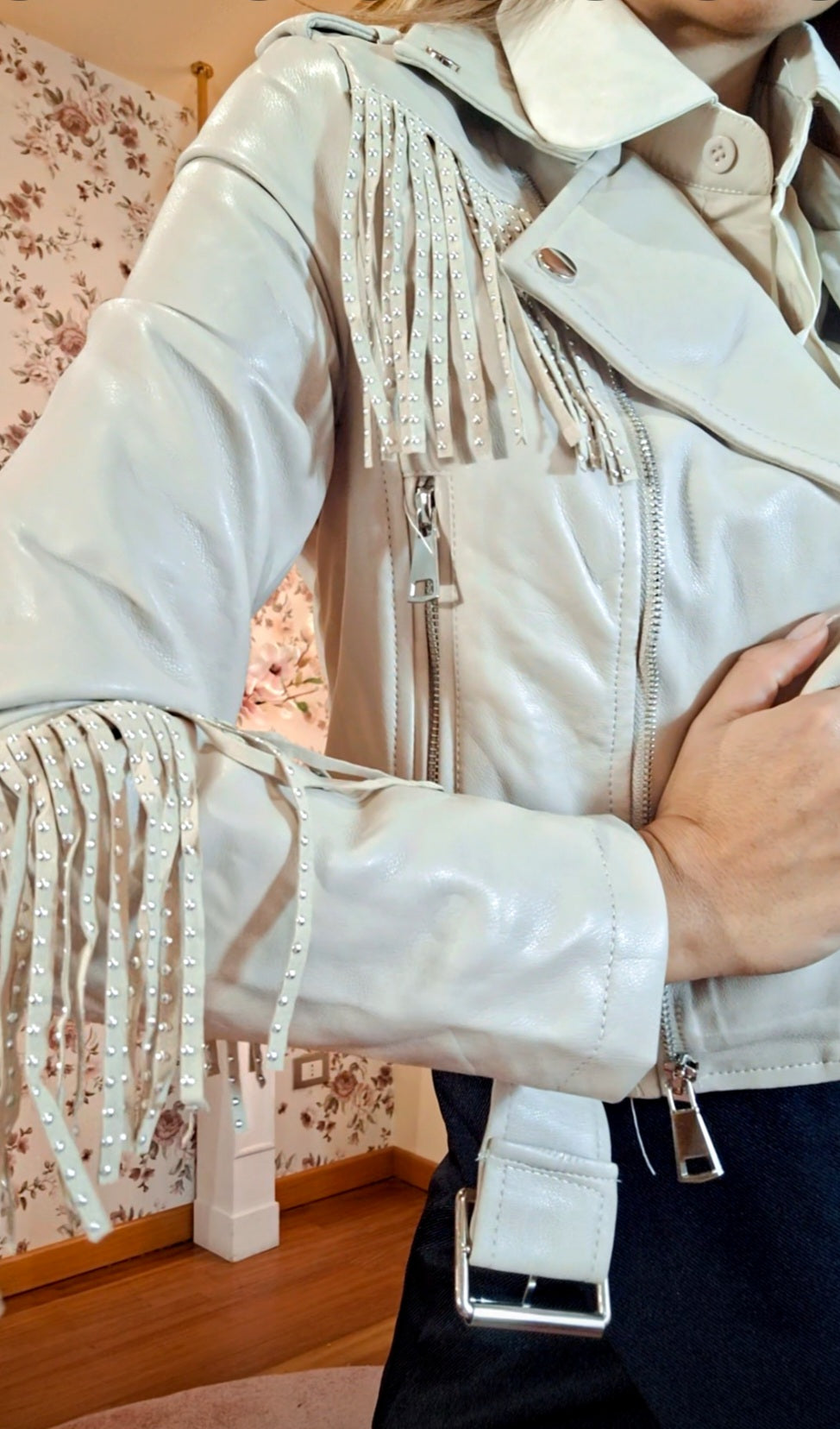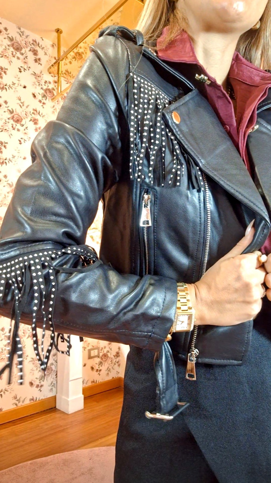 Il chiodo Kimmi si distingue per la sua praticità e l’originalità delle fragette presenti sulle maniche, che aggiungono un dettaglio unico e funzionale. Questo capo combina stile e comodità, ideale per chi cerca un look sofisticato senza rinunciare al comfort. Perfetto per completare ogni outfit con un tocco distintivo.