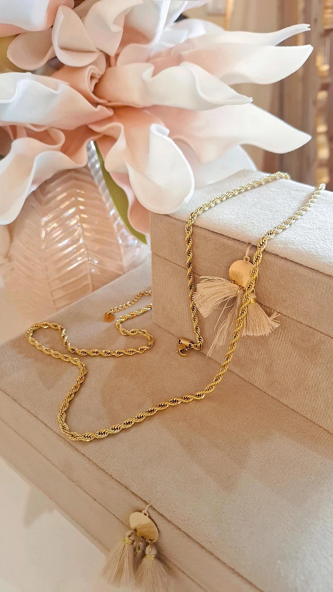 La Collana Blaire è un elegante gioiello lungo con trama intrecciata, progettata per essere indossata sia come collana singola lunga sia avvolta con un doppio giro: la sua versatilità consente di adattarsi perfettamente a vari look.