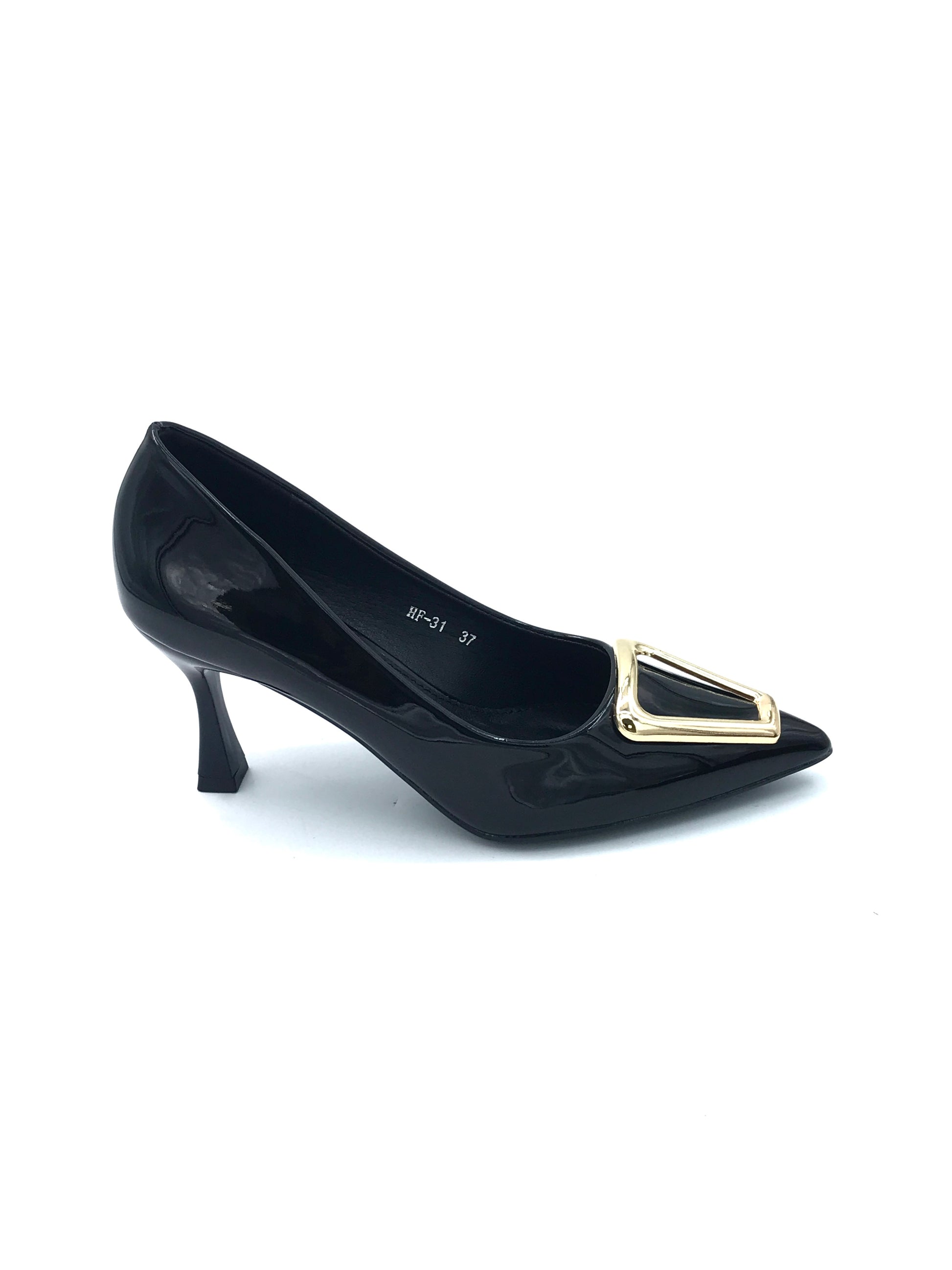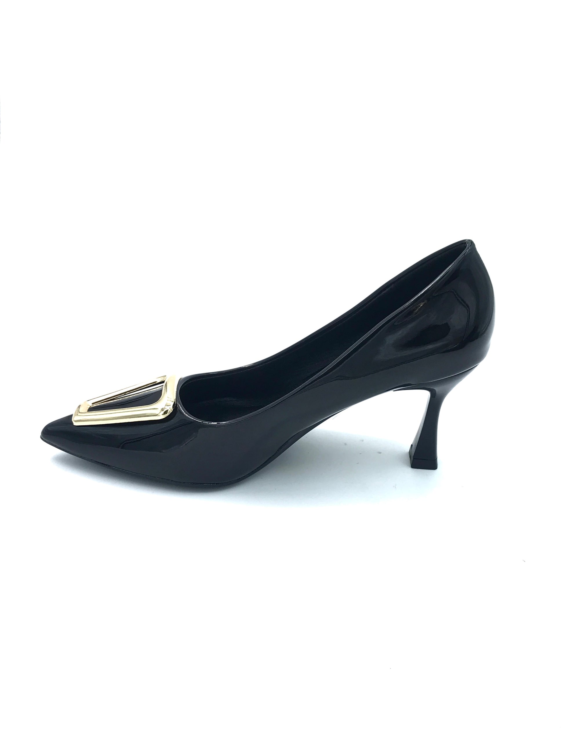 Le dècolletè Sharlene offrono un raffinato effetto vernice che dona una lucentezza elegante e moderna. Caratterizzate da una fibbia dorata sulla punta, aggiungono un tocco di prestigio discreto. Il tacco basso a rocchetto garantisce comfort e stabilità per un uso prolungato senza rinunciare allo stile. Ideali per completare look formali o da ufficio con un dettaglio sofisticato e funzionale.