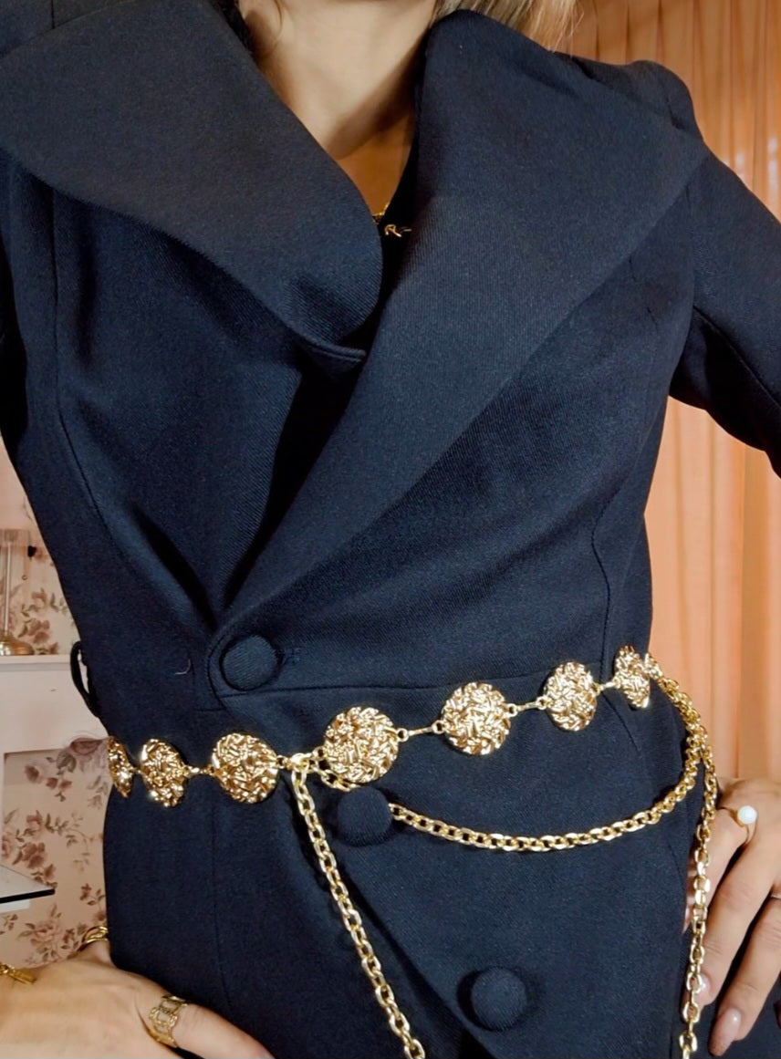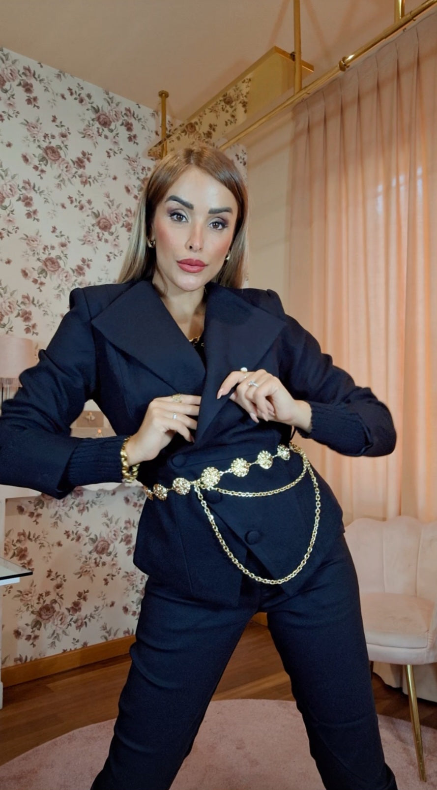 La Giacca Elys è una proposta raffinata caratterizzata da un taglio corto e foderato, ideale per garantire comfort e stile. Il design obliquo è valorizzato dai bottoni che seguono la linea inclinata, creando un effetto elegante e dinamico. Completa il capo una cinturina dorata che dona un tocco di lusso discreto e permette di valorizzare la silhouette con un effetto sagomato. Perfetta per chi cerca un capo versatile e di classe, adatto sia a look formali che casual.