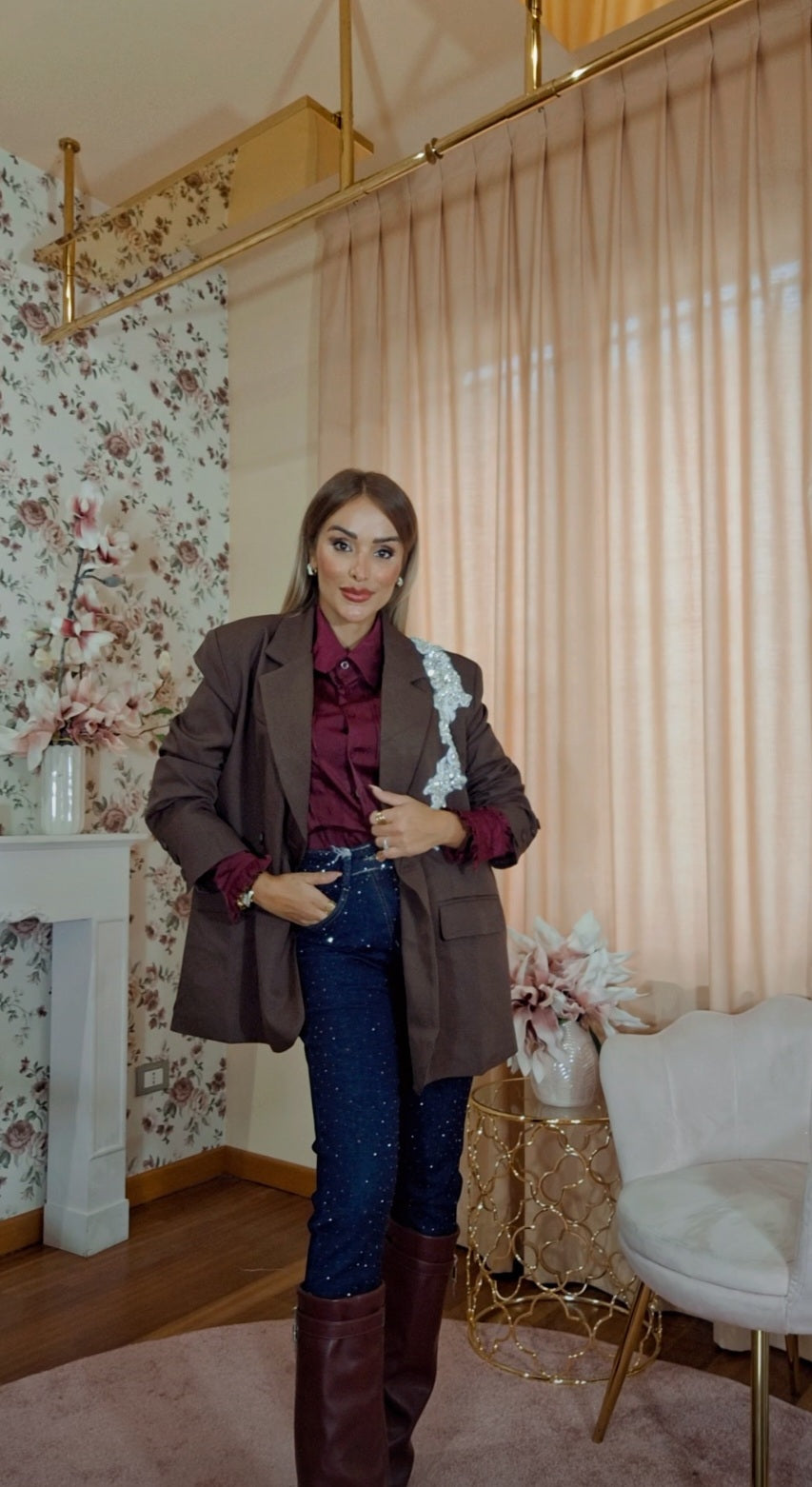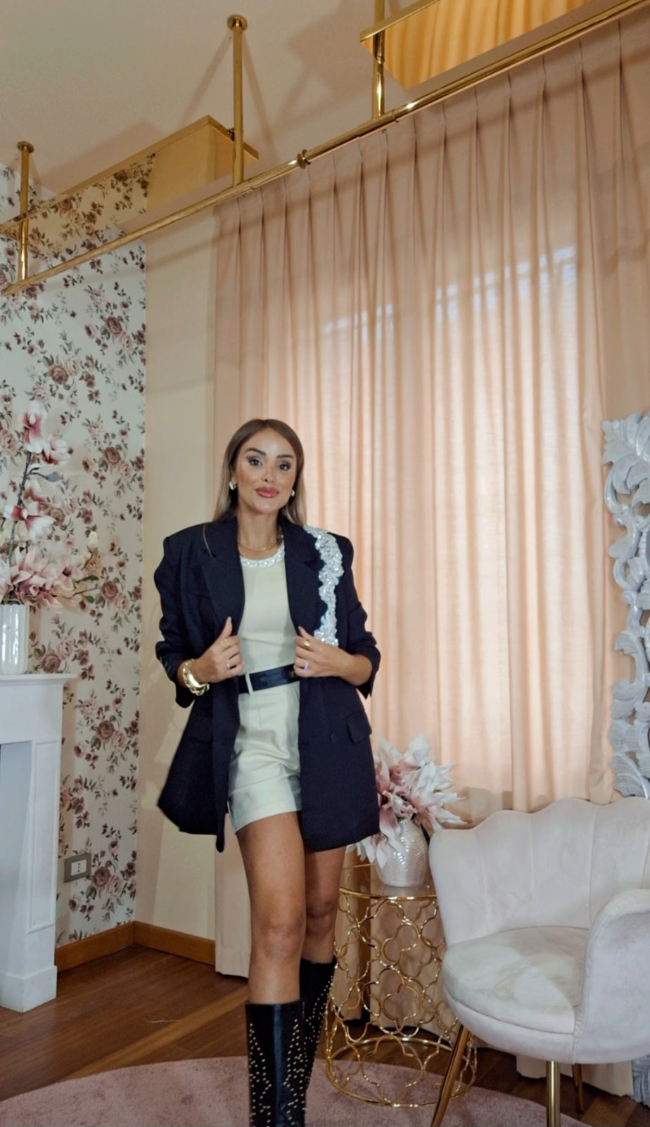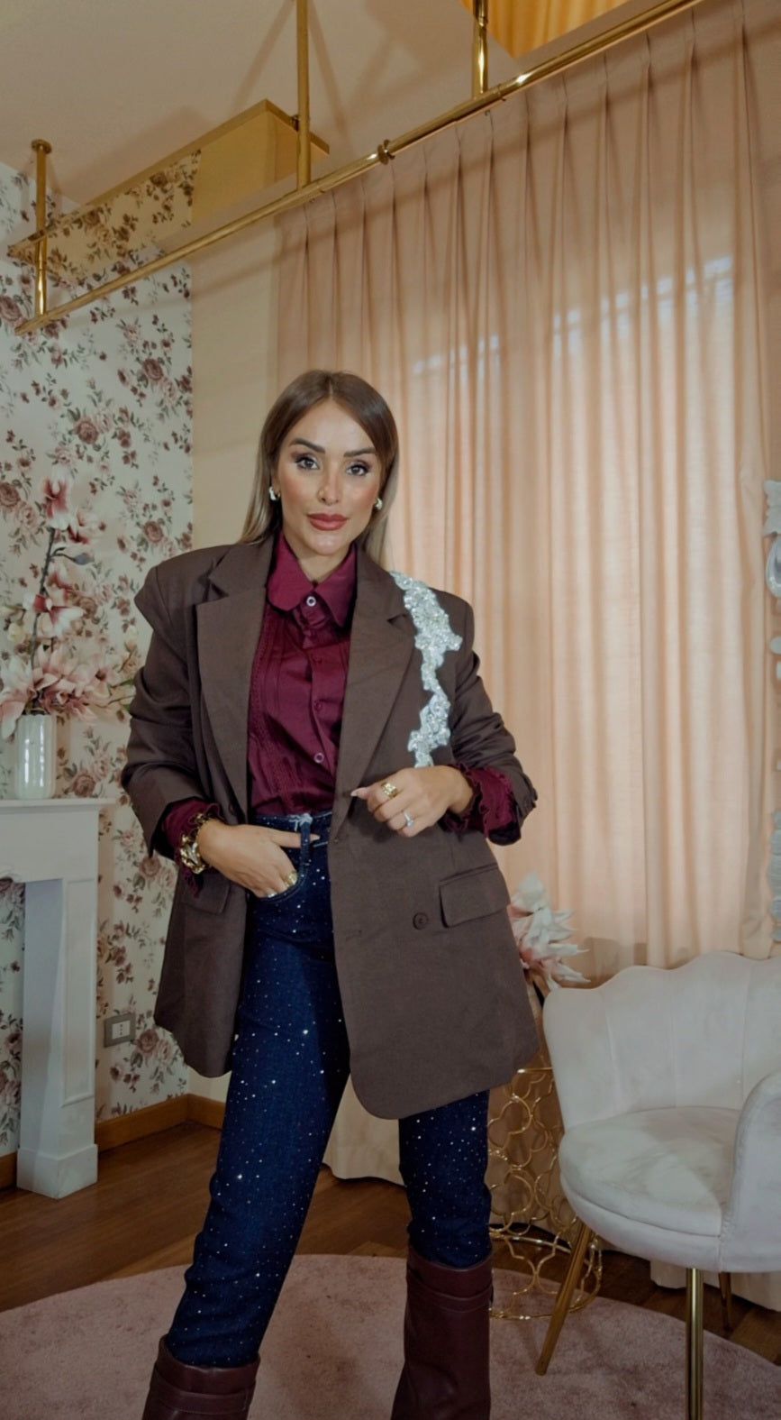 La Giacca Evie è un capo sofisticato dal taglio over con doppio petto e colletto strutturato, ideale per chi cerca un equilibrio tra eleganza e modernità. Le tasche anteriori aggiungono praticità, mentre i bottoni sui polsini rifiniscono il design con cura artigianale. La decorazione in strass, gemme e perline posizionata sulla spalla e il torace dona un tocco distintivo di luce e raffinatezza, rendendo questa giacca perfetta per occasioni formali e serate esclusive.
