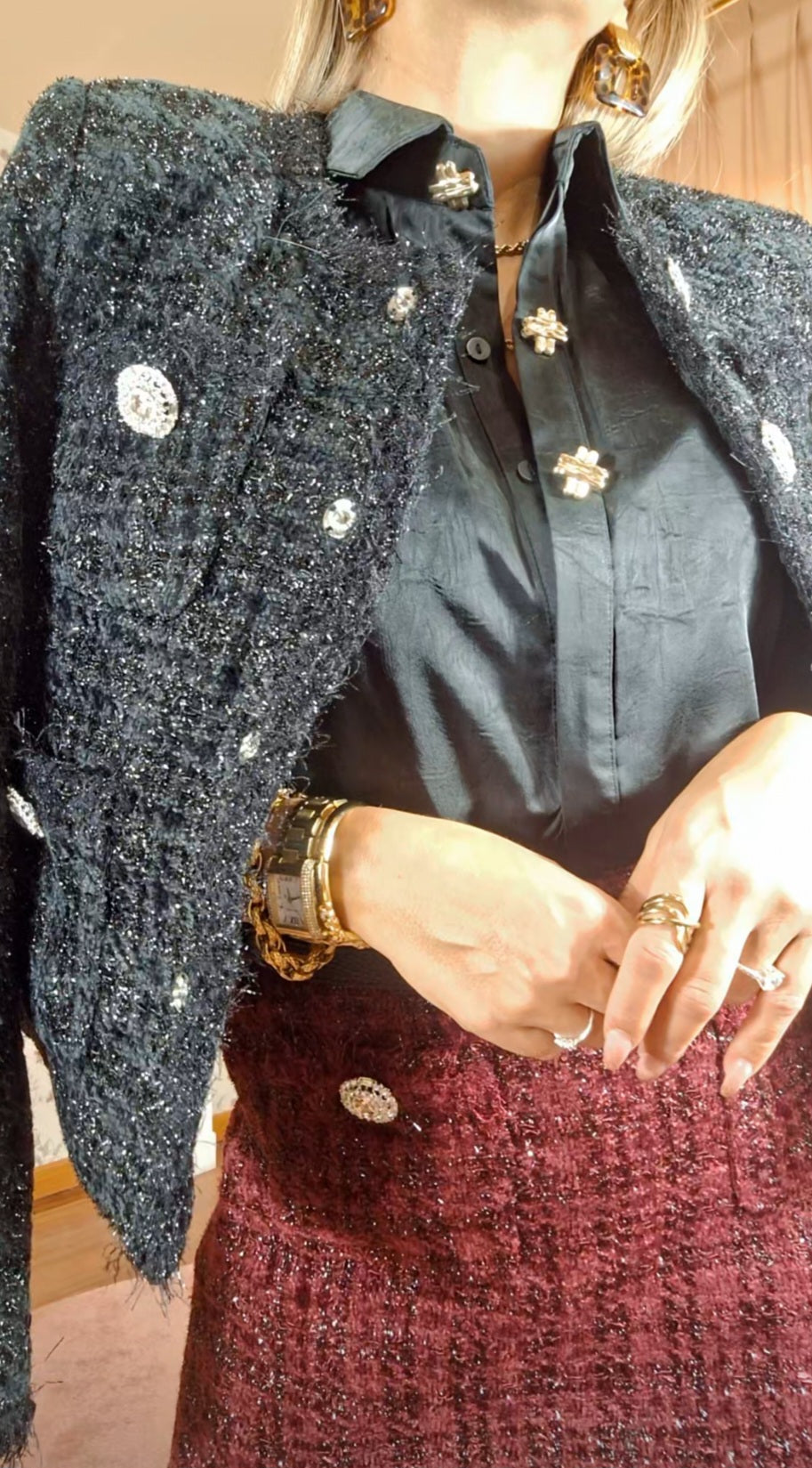 Questa Giacca Olimpia fonde eleganza classica e dettagli sofisticati, ispirata allo stile Chanel. Il modello foderato presenta bottoni centrali a gioiello che aggiungono un tocco di raffinatezza. Le tasche anteriori, sia superiori che inferiori, uniscono praticità e design. Il bordo del colletto e delle maniche con effetto sfilacciato dona carattere e modernità, rendendo questa giacca una scelta ideale per chi cerca un capo versatile e di classe.