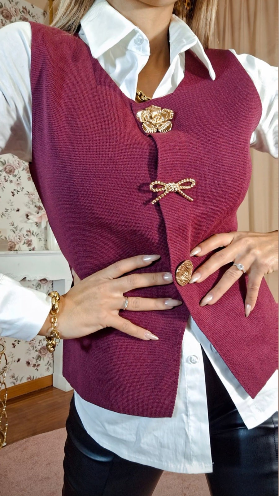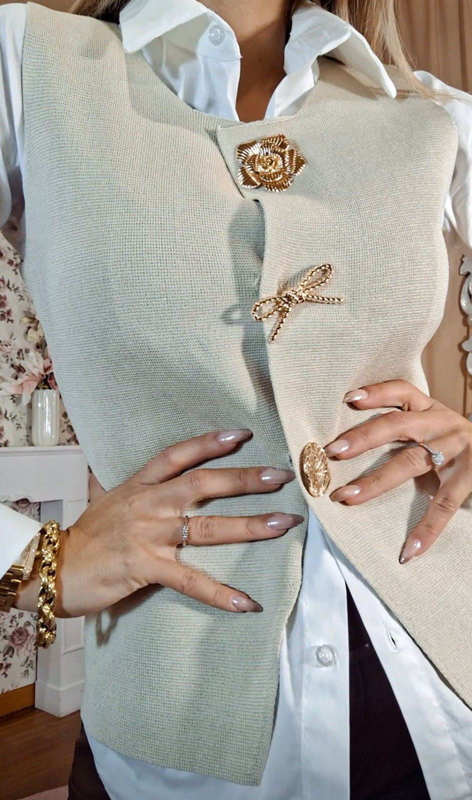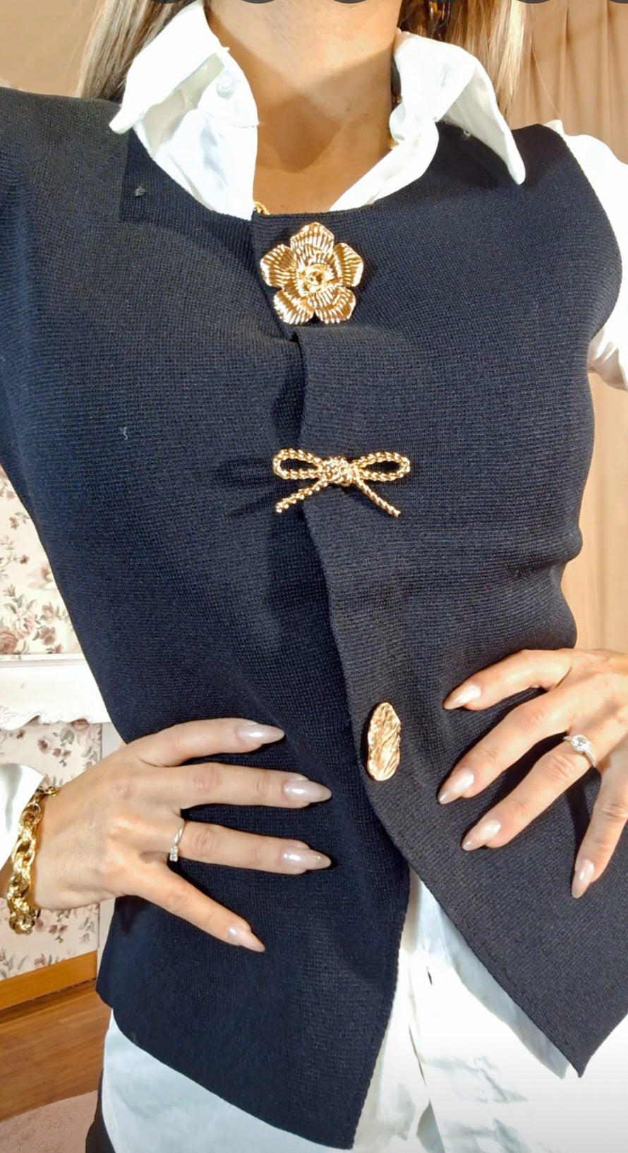Il Gilet Francis si distingue per l’eleganza dei bottoni dorati a forma di fiore, impreziositi da un fiocco e da dettagli con rifiniture laser che esaltano la raffinatezza del capo. La vestibilità leggermente sciancrata garantisce una silhouette armoniosa e contemporanea, perfetta per completare con stile outfit sia formali che casual chic.