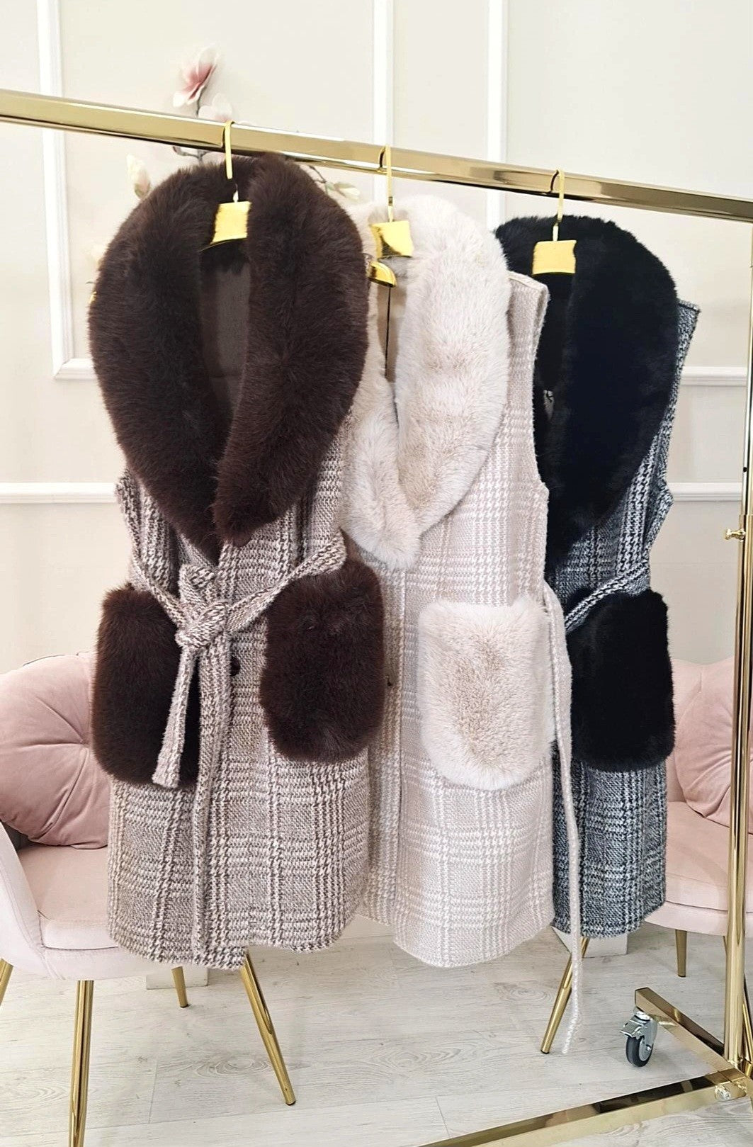 Gilet Zaya-Gilet lungo smanicato con tasche e colletto in peliccia, dotato della cintura e bottoni centrali
