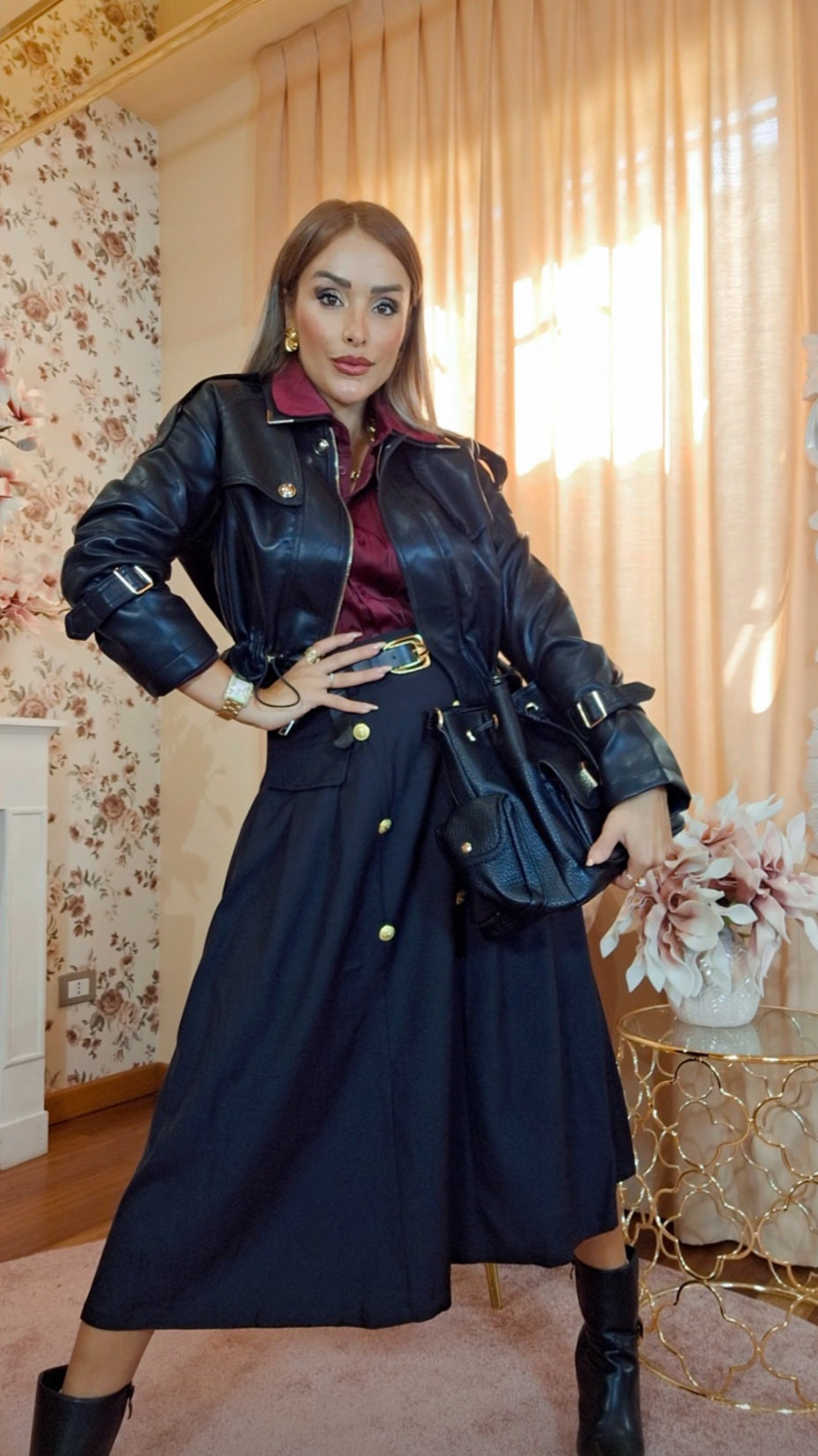 Il chiodo Lavinia in ecopelle foderato combina stile e praticità grazie ai dettagli dorati che ne esaltano l’eleganza. La cerniera centrale assicura una chiusura sicura e comoda, mentre il bottone superiore e inferiore aggiunge un tocco di rifinitura raffinata. Perfetto per completare outfit sofisticati con un tocco contemporaneo e responsabile.