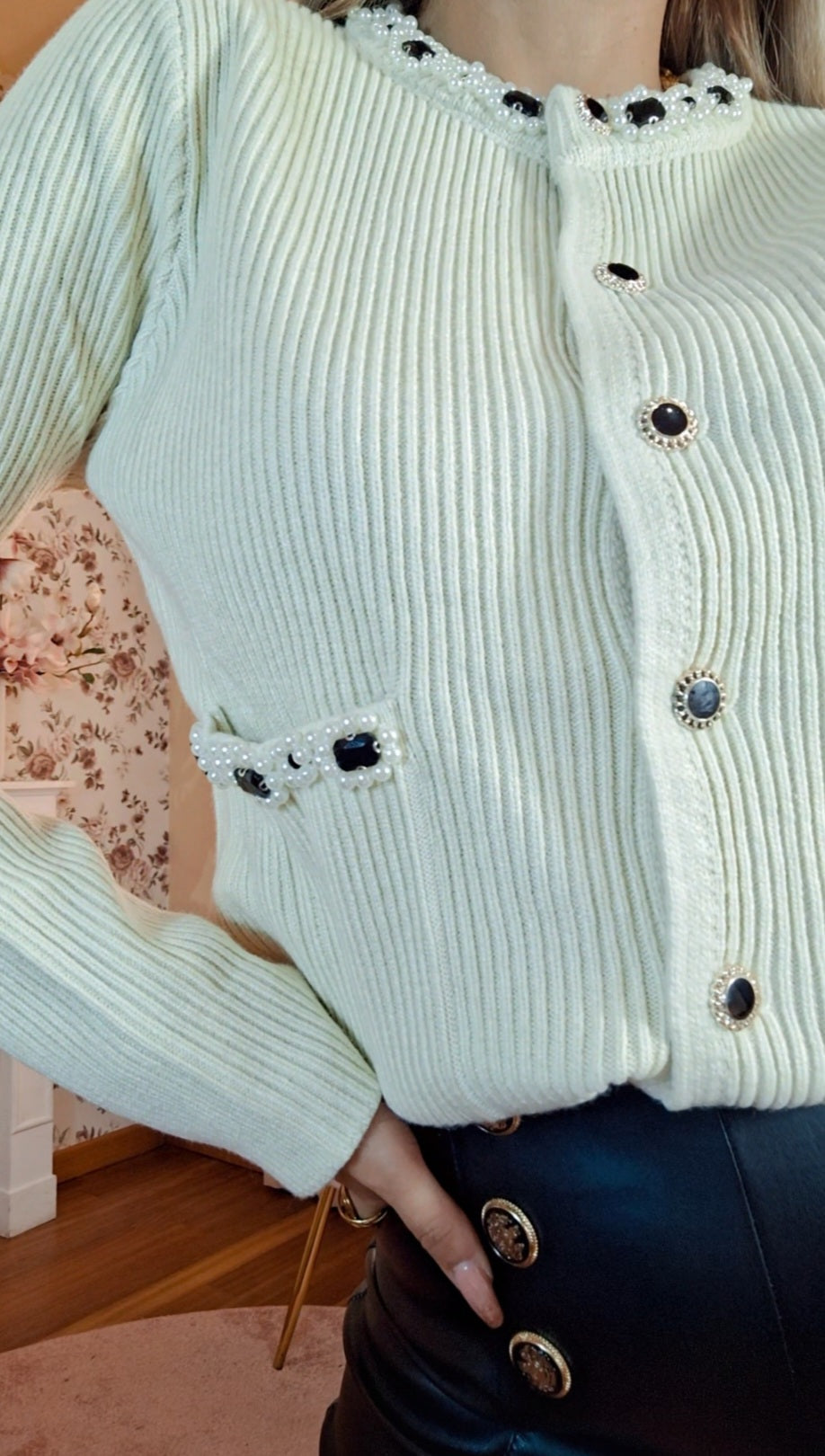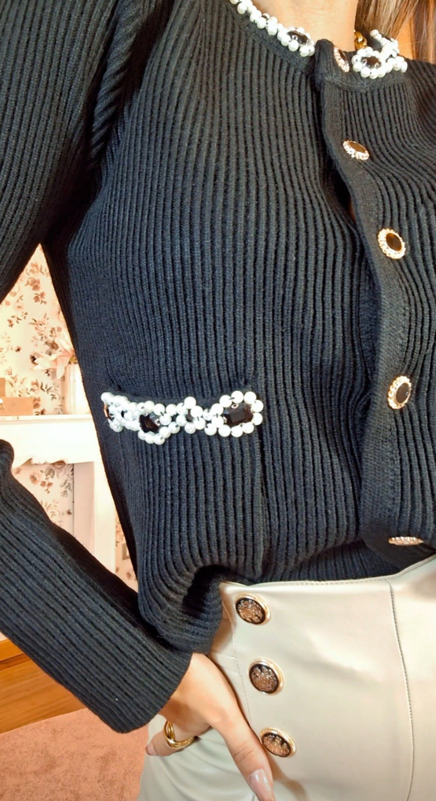 Il Maglioncino Janessa unisce eleganza e raffinatezza grazie al suo design a costine e al colletto impreziosito da perle e pietre. I bottoni centrali gioiello aggiungono un tocco sofisticato, mentre le tasche anteriori, decorate con perle e pietre lungo il bordo, completano il capo conferendogli un'estetica esclusiva e curata, perfetta per chi cerca un capo versatile e di classe.