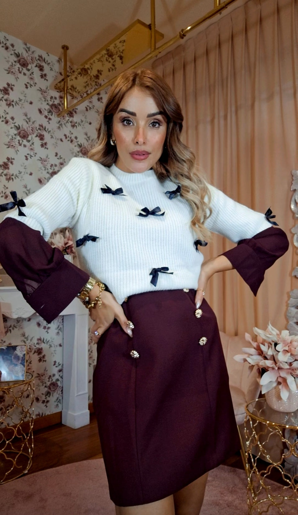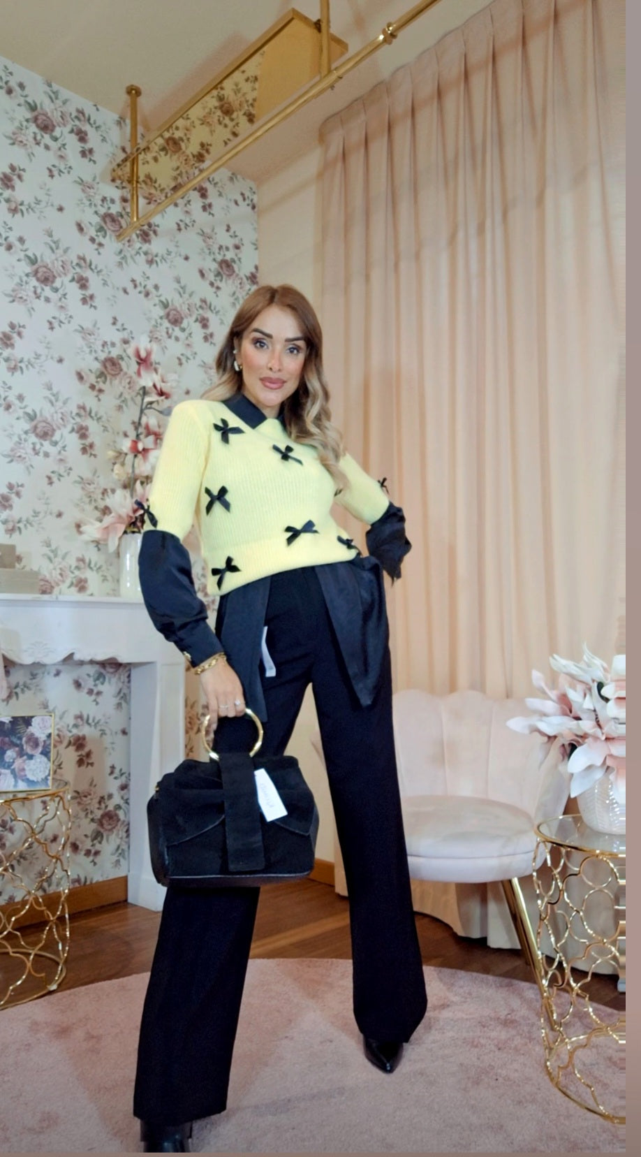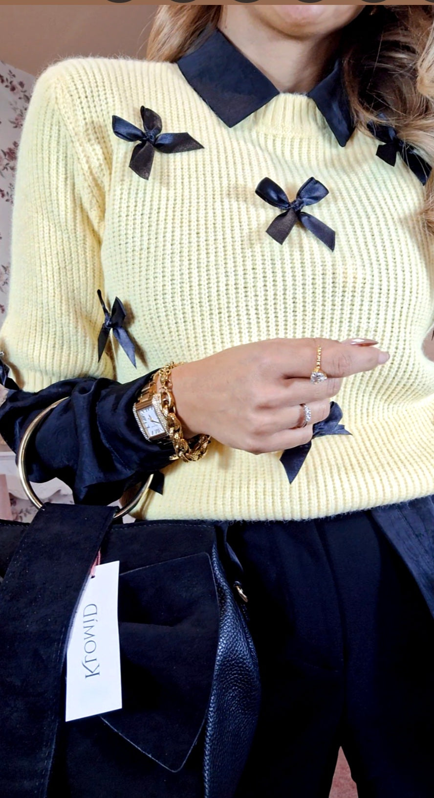 Maglioncino Trilly è un maglioncino girocollo a maniche corte, arricchito da spille a forma di fiocchetto che donano un tocco elegante e femminile al capo. Realizzato con materiali di qualità, offre comfort e stile perfetti per stagioni intermedie o per un look sofisticato ma informale. Ideale da abbinare sia a outfit casual sia a combinazioni più raffinate.
