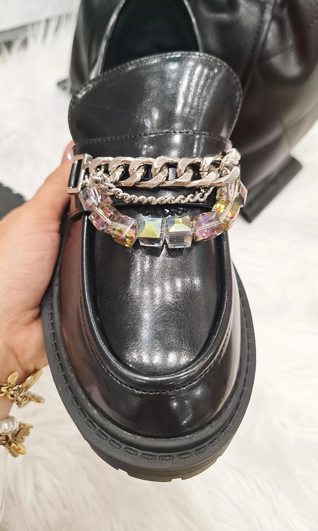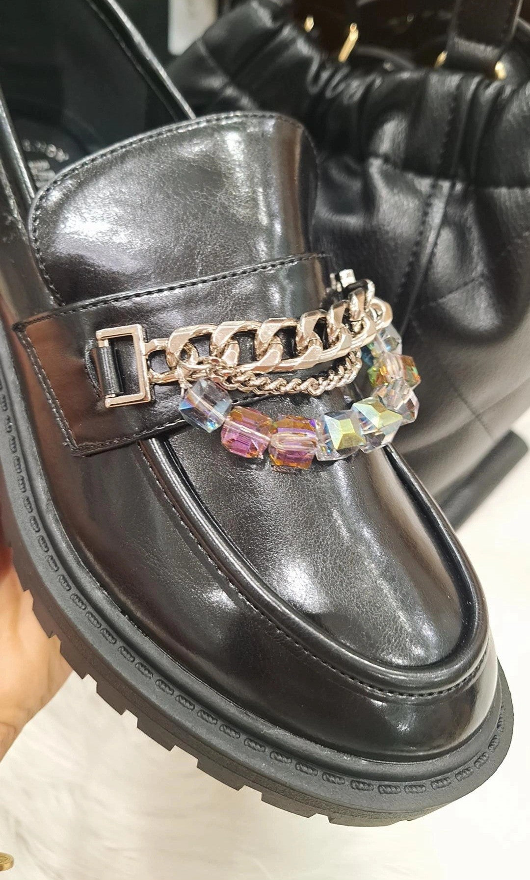 Mocassini Daniela - mocassini in ecopelle con catene metalliche argentate e perline colorate