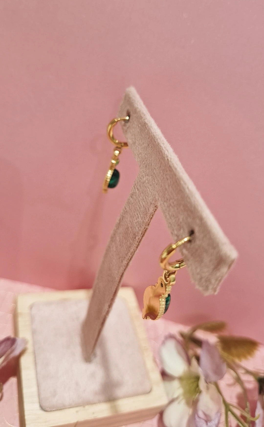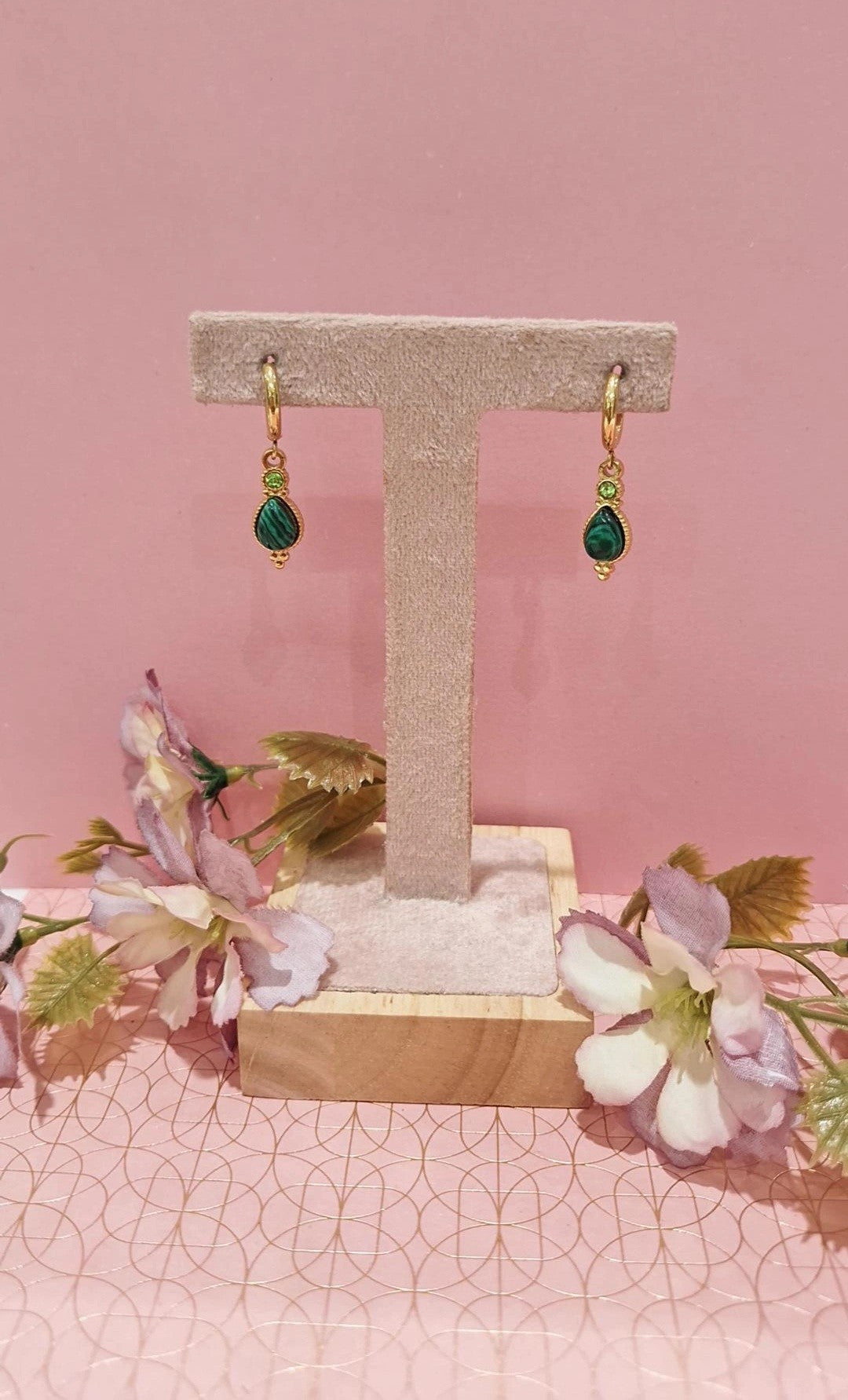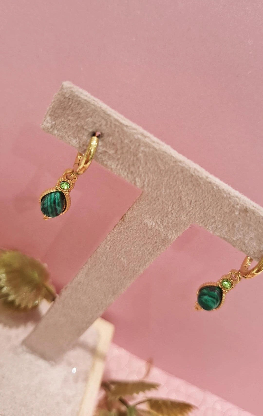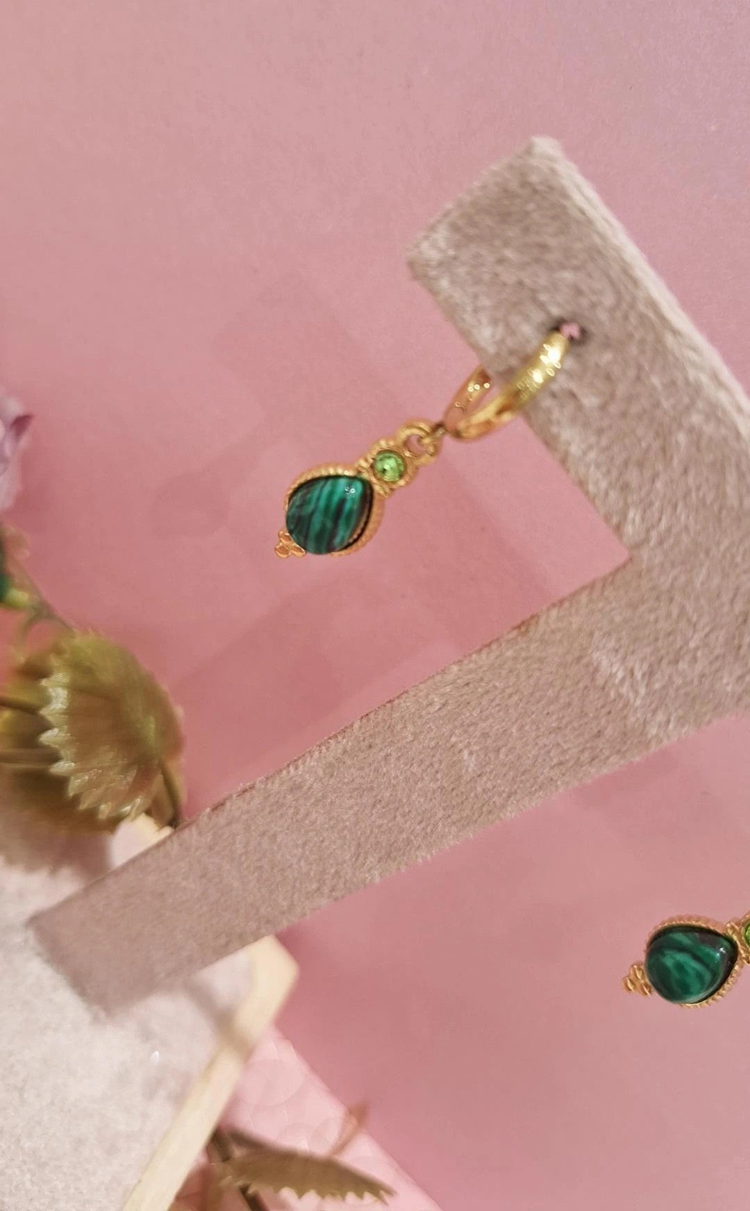 Orecchini fortuny- Orecchini a cerchio con pendente motivo pietra verde e punto luce sempre in gradazione del verde