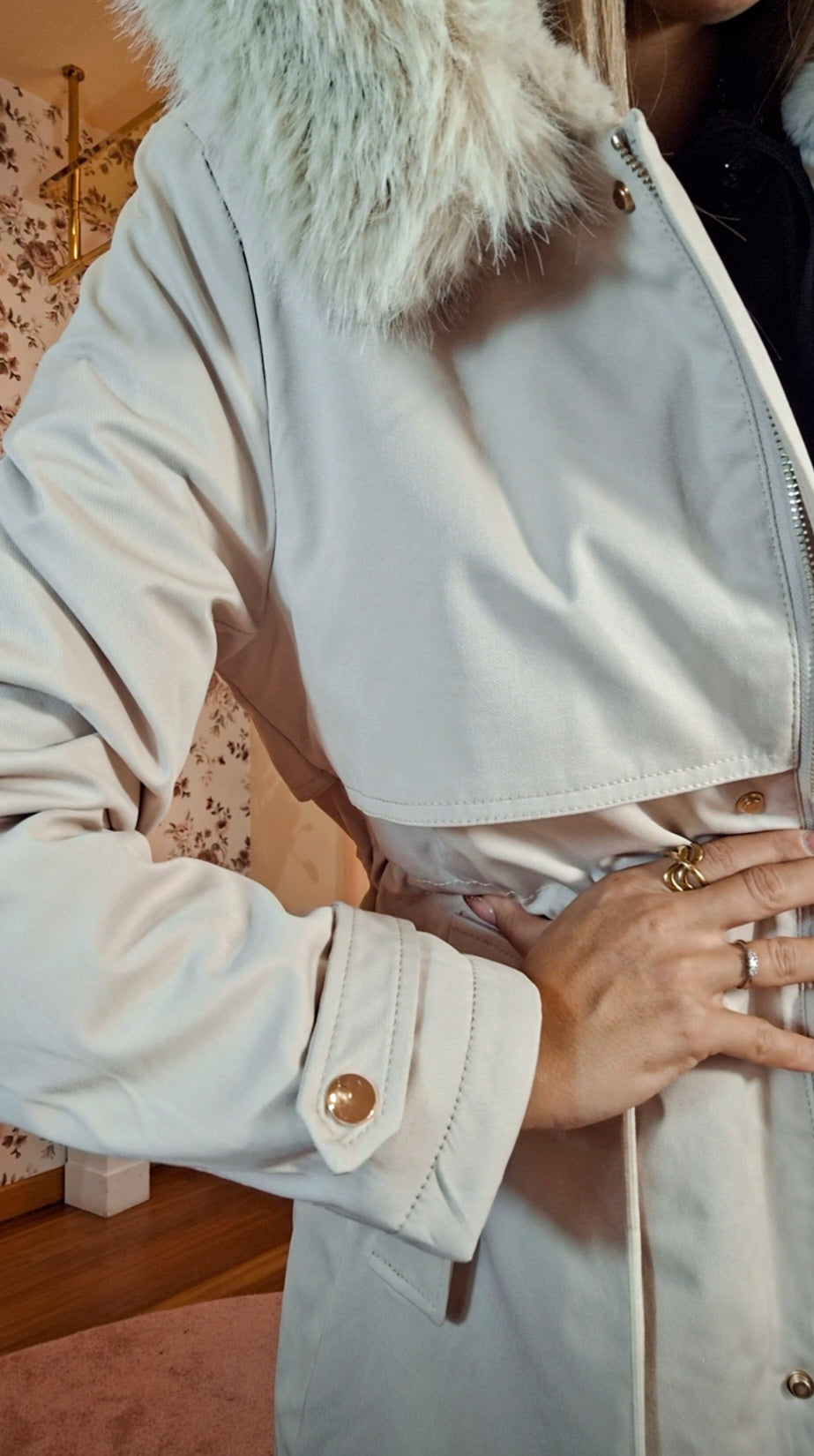 La Parka Isley unisce funzionalità e stile ricercato. Dotata di un cappuccio con pelo rimovibile e pelliccia interna per garantire calore e comfort, presenta una chiusura centrale con cerniera e bottoni superiori e inferiori che assicurano protezione dagli agenti atmosferici. Le tasche laterali pratiche e i dettagli dorati conferiscono un tocco elegante, mentre l’elastico in vita valorizza la silhouette per una vestibilità perfetta ogni giorno.