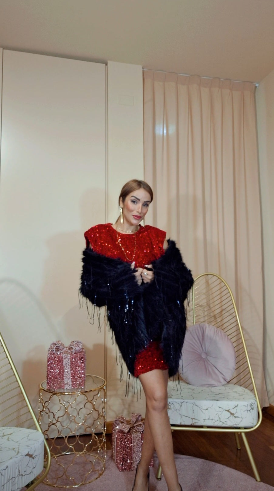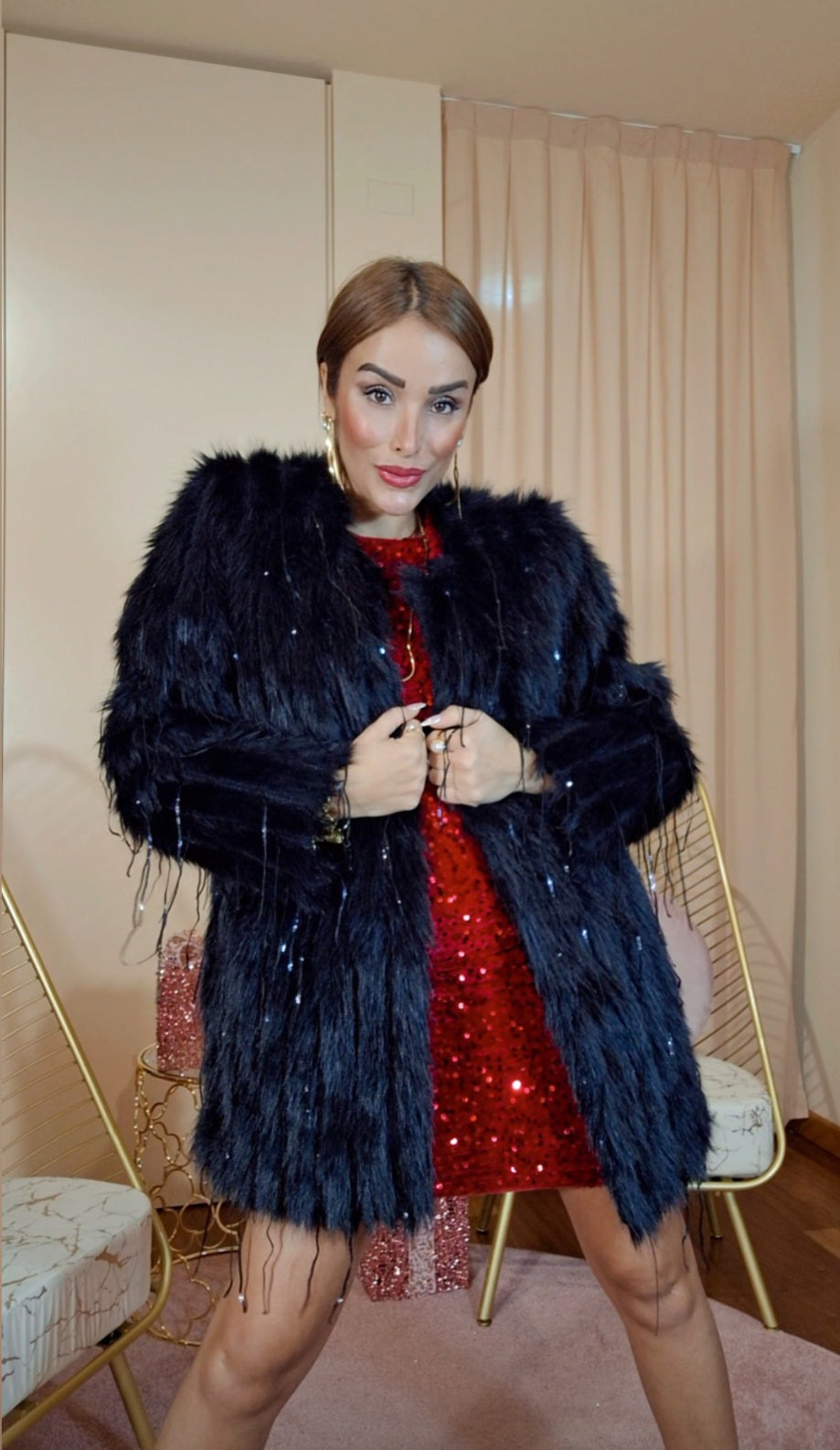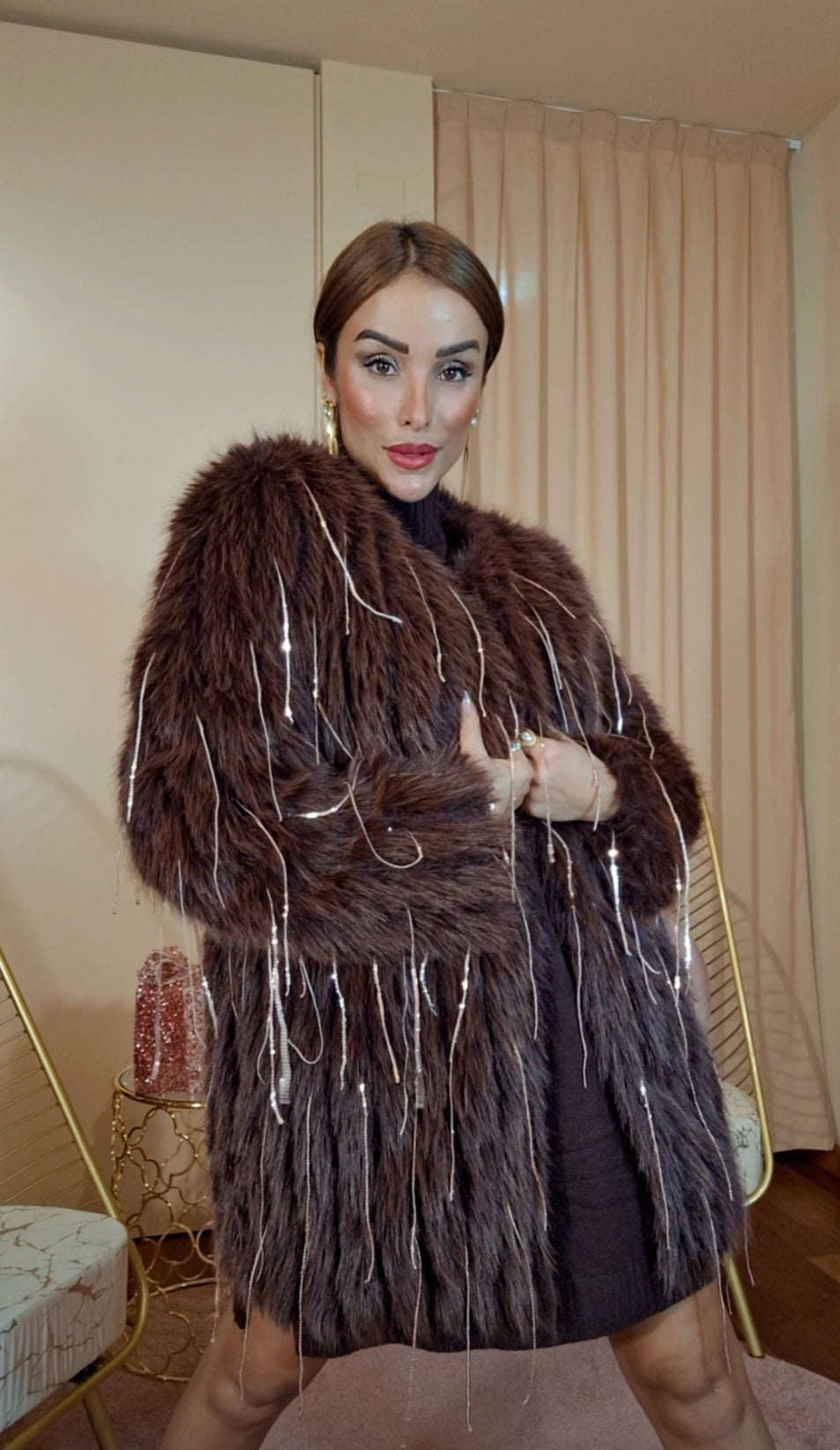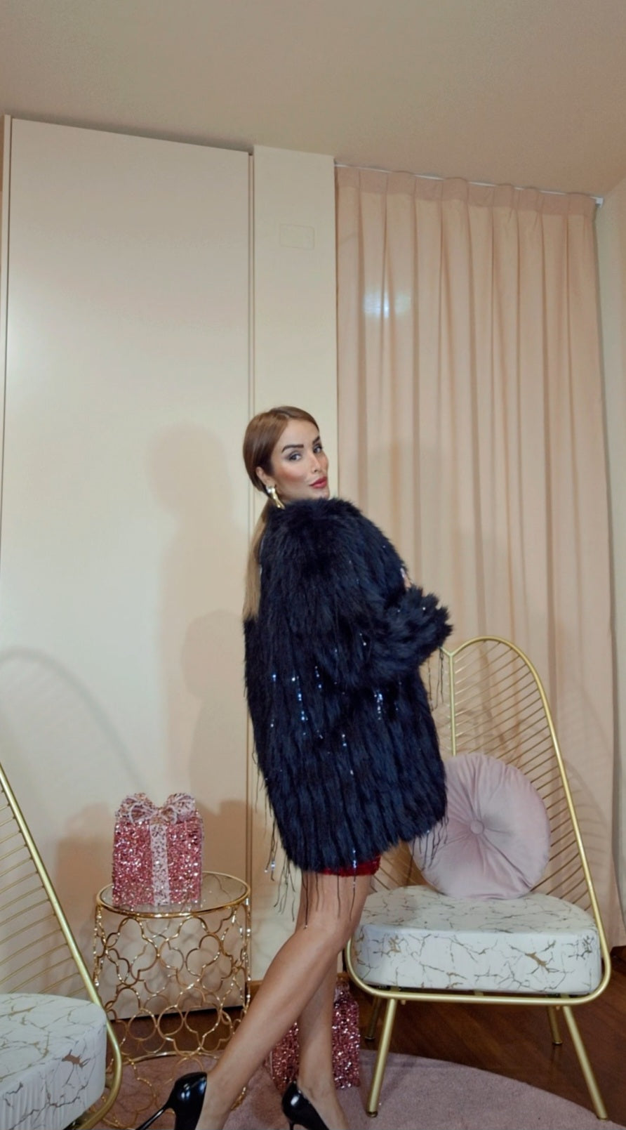 La Pelliccia Odette è realizzata in pregiata pelliccia sintetica,con raffinate frange di strass che aggiungono un tocco di brillantezza sofisticata, perfetto per occasioni speciali e serate glamour. Le comode tasche laterali garantiscono funzionalità senza sacrificare l'estetica. Ideale per chi ricerca un capo versatile che trasforma qualsiasi outfit, dal più casual al più elegante.