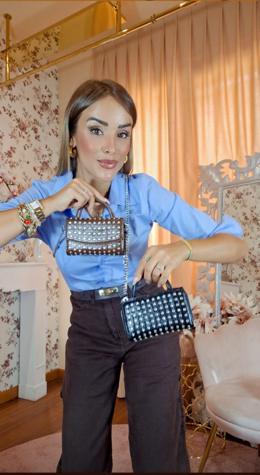 Pochette/portafoglio unisce eleganza e funzionalità grazie al suo doppio scomparto che permette una perfetta organizzazione. Arricchito da borchie brillantinate, è dotato di un manico compatto e di una tracolla a catena rimovibile, ideale per adattarsi a ogni esigenza di stile e comfort. Perfetto per chi cerca un accessorio versatile e raffinato.