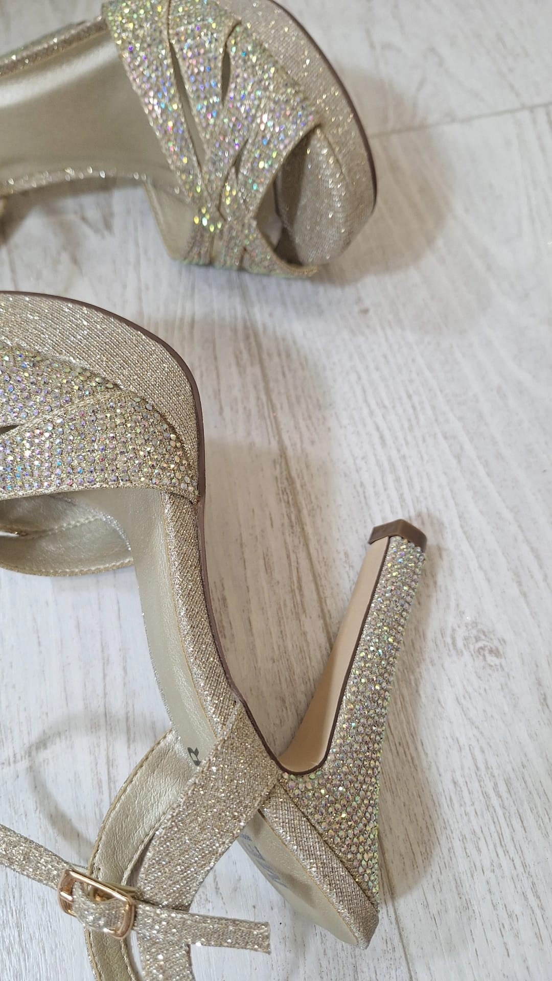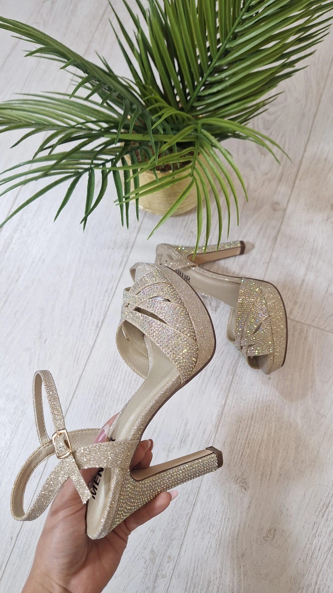 Sandali Mahia - Sandali glitterati con strass, cinturno alla caviglia, tacco alto e plateau