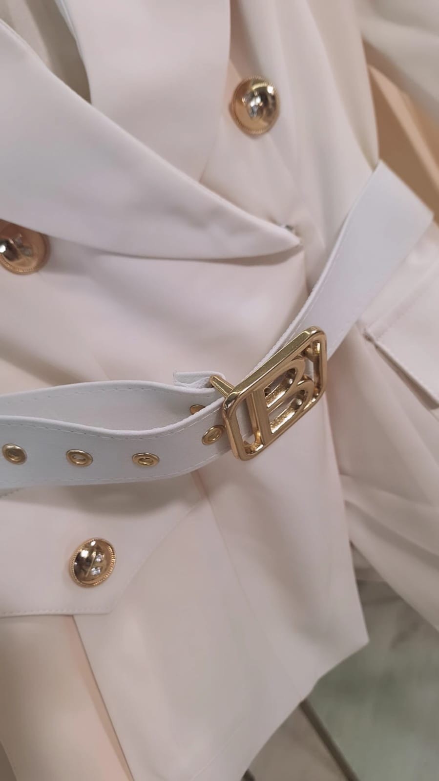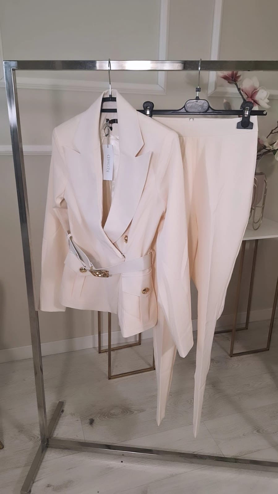 Set completo Jadelin - Set completo pantalone vita alta vestibilità skinny e giacca sciancrata con bottoni dorati, tasche frontali e cintura in vita