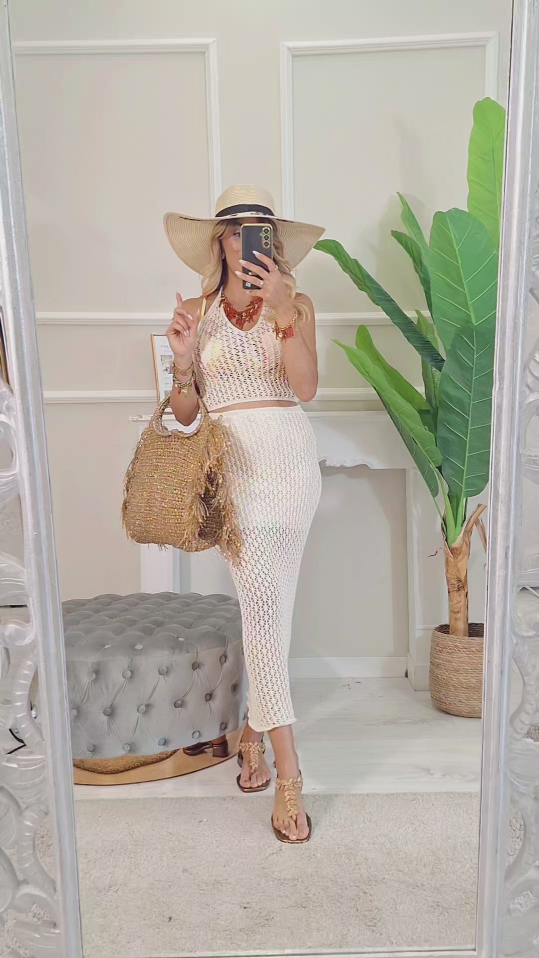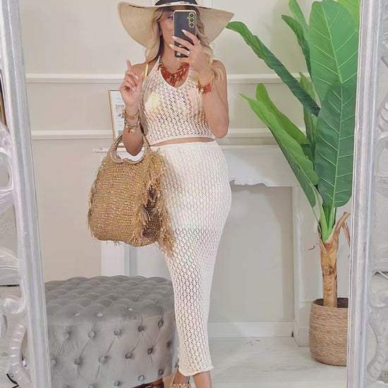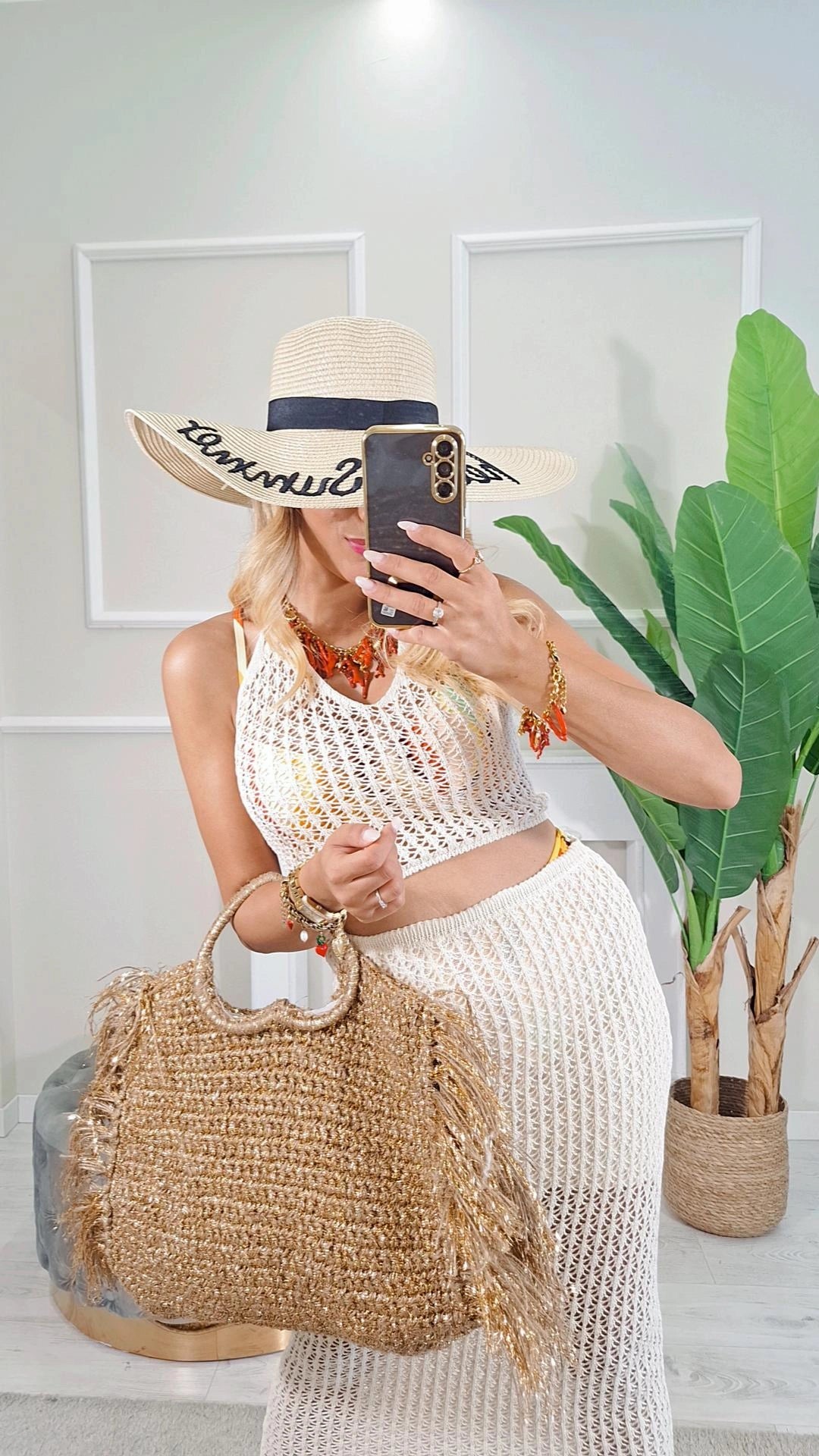"Con il Set Completo Rene, avrai un'aggiunta perfetta al tuo guardaroba estivo. Realizzato in morbida maglia, questo set completo di gonna e top è adatto anche come copri costume. La sua versatilità e il suo design moderno si adattano a qualsiasi occasione, assicurandoti sempre un look perfetto."