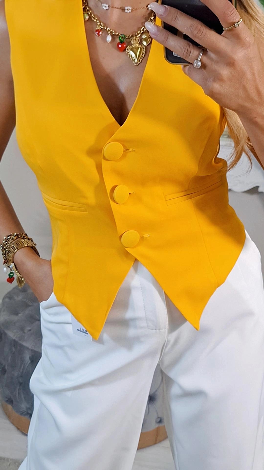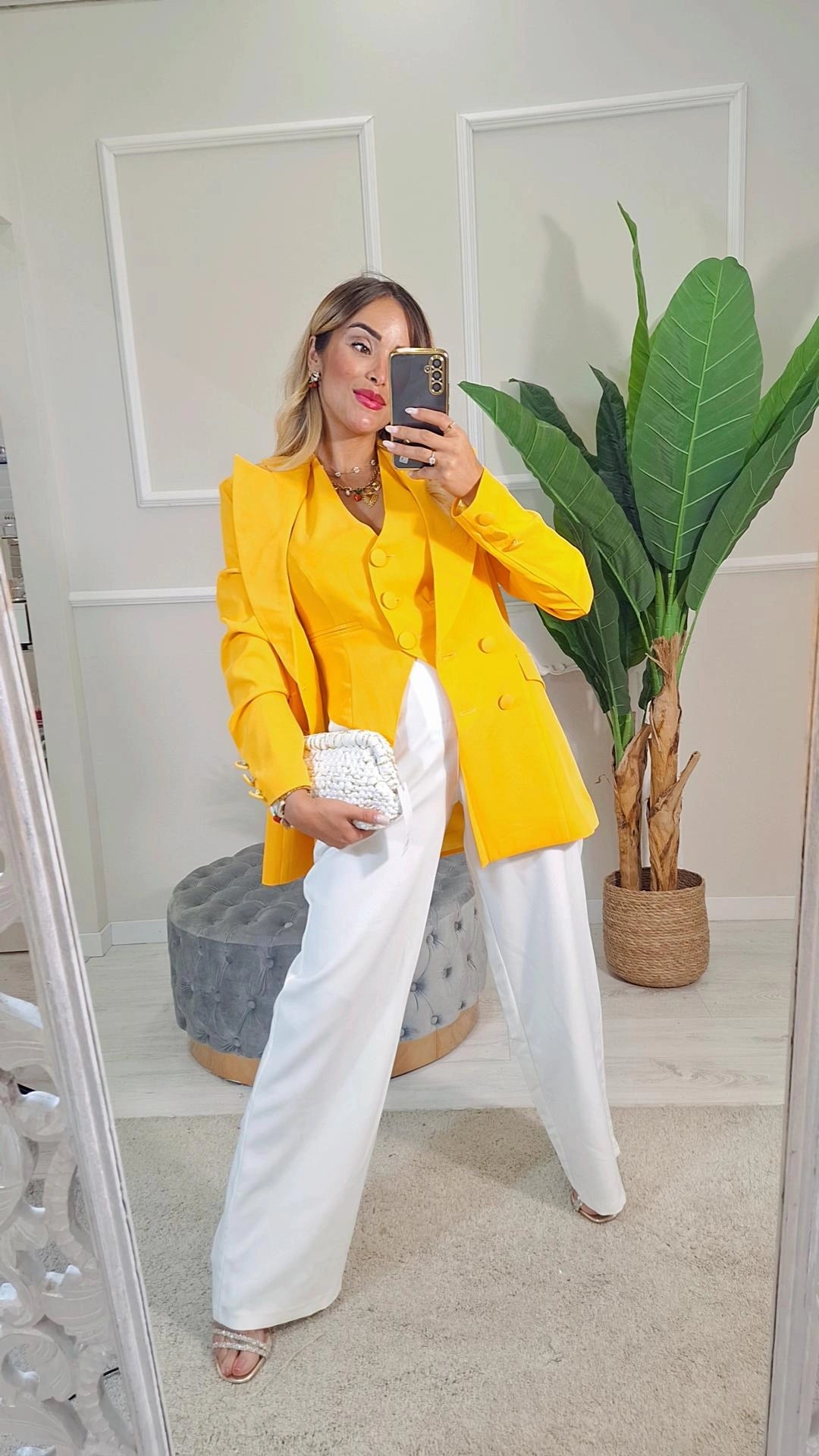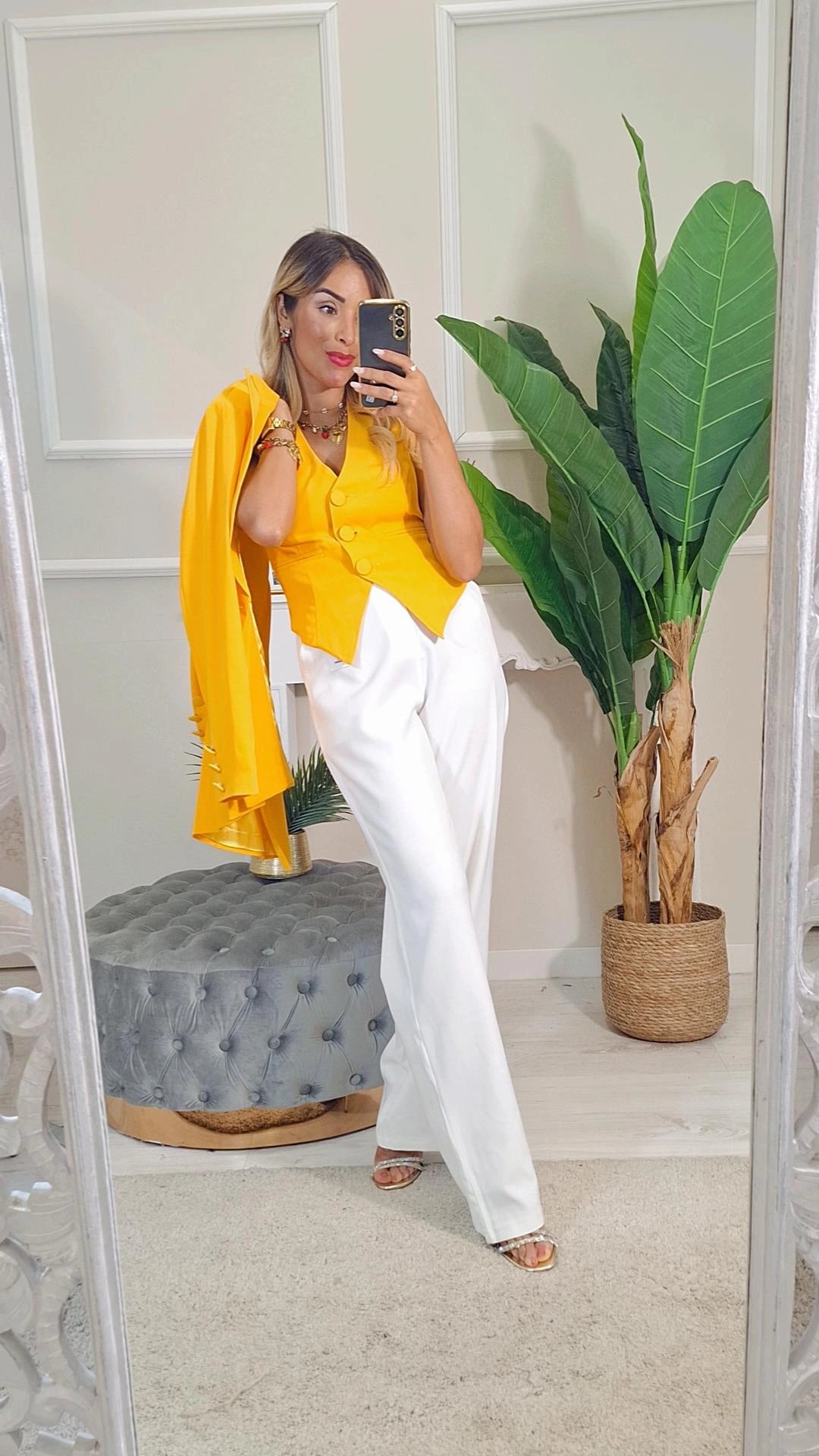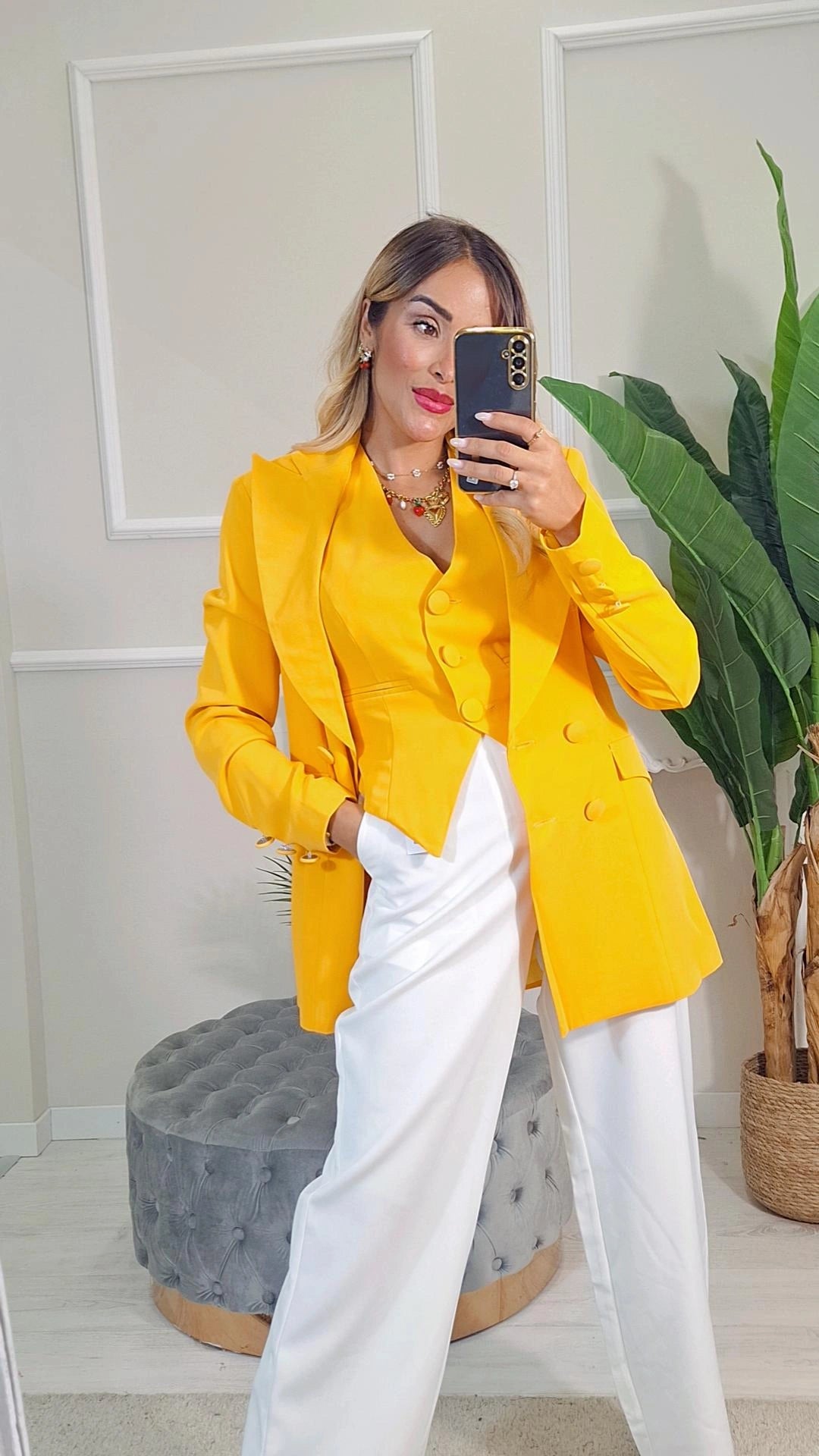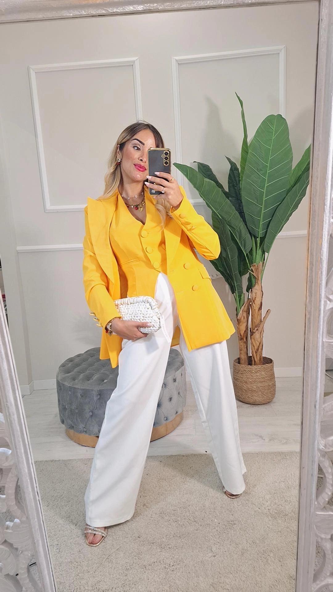 Il Set Completo Sofy combina un gilet e una giacca in tessuto giallo elegante con un design casual, perfetto per chi desidera un look sofisticato ma rilassato. Realizzato con materiali di alta qualità e tagli moderni, questo completo offre comfort e stile, ideale per eventi informali o occasioni in cui distinguersi con classe senza rinunciare alla comodità.