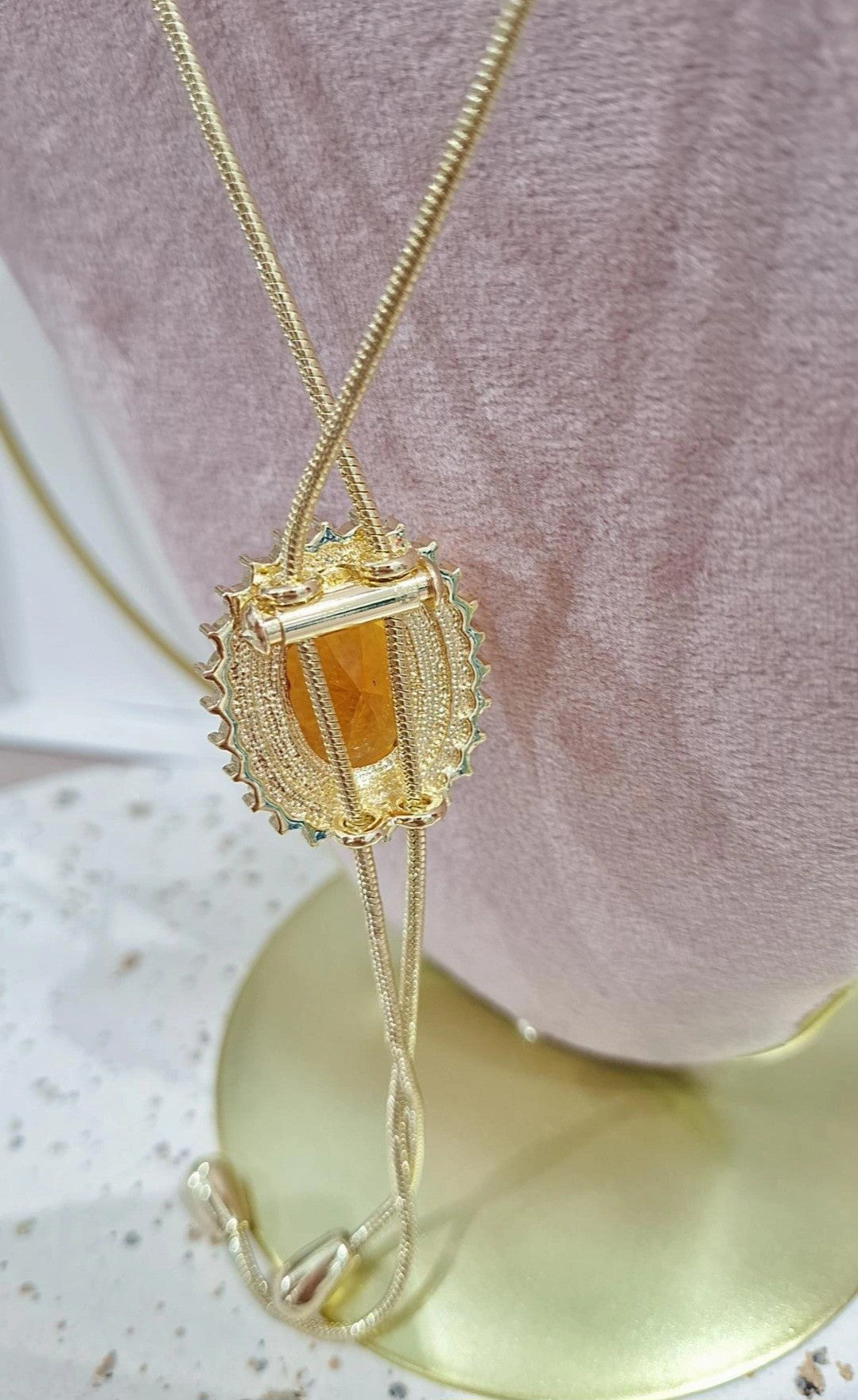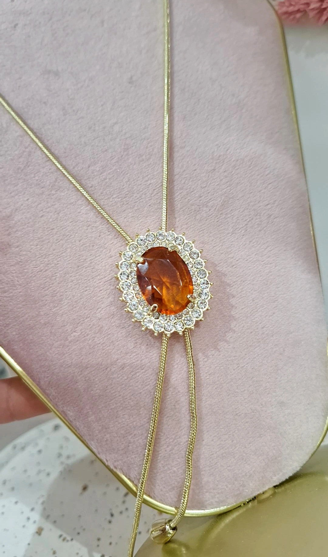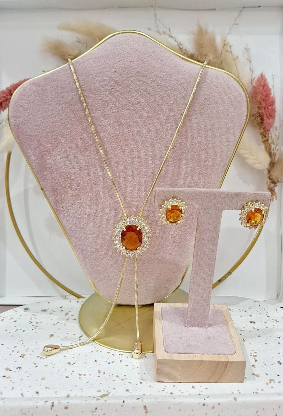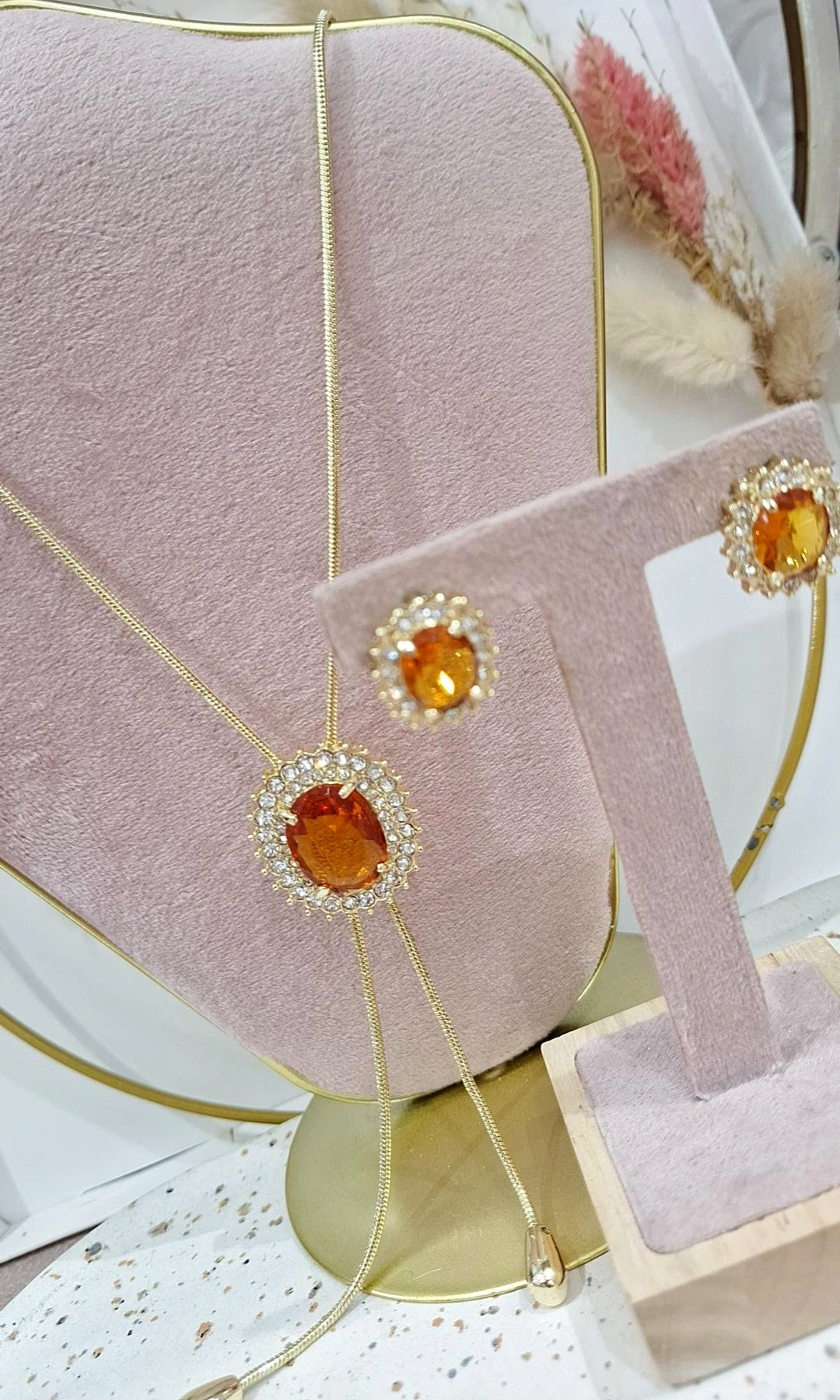 Set Gioiello Tessy- Set gioiello composto da collana e orecchini con grande perla arancio circondata da strass