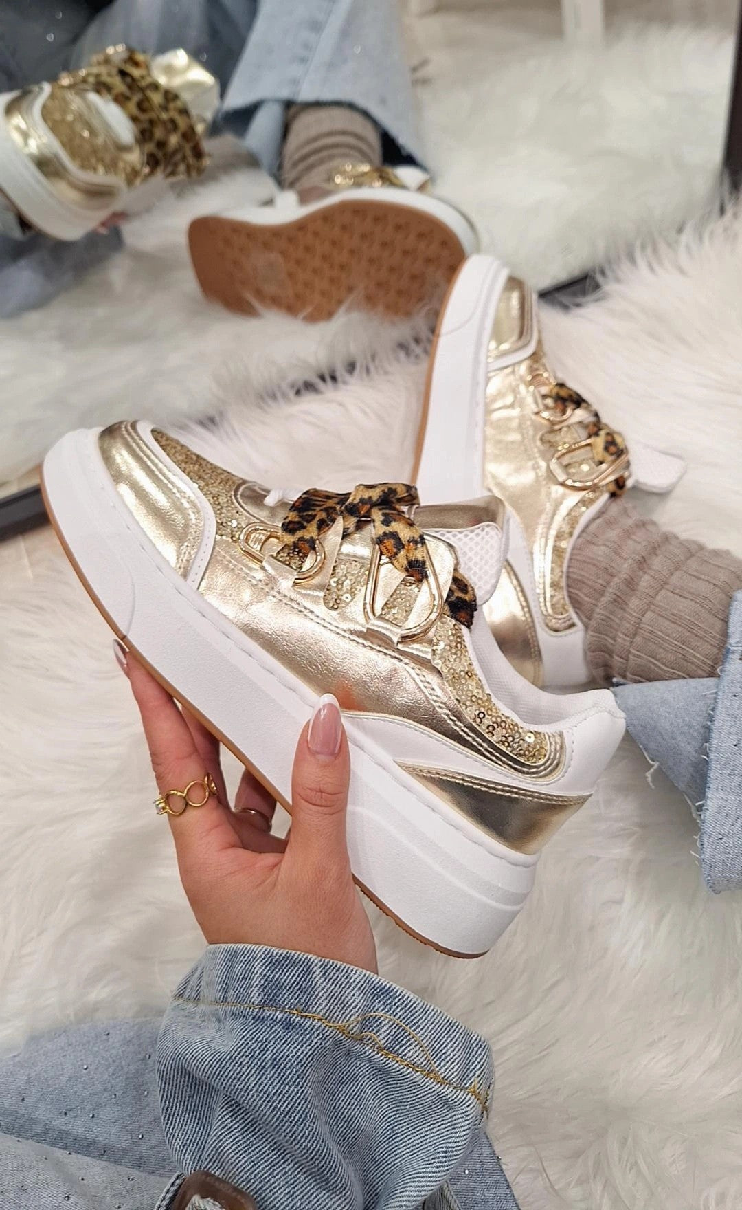 Sneakers Raffy- Sneakers con platform dorate, inserto con paillettes e lacci leopardati