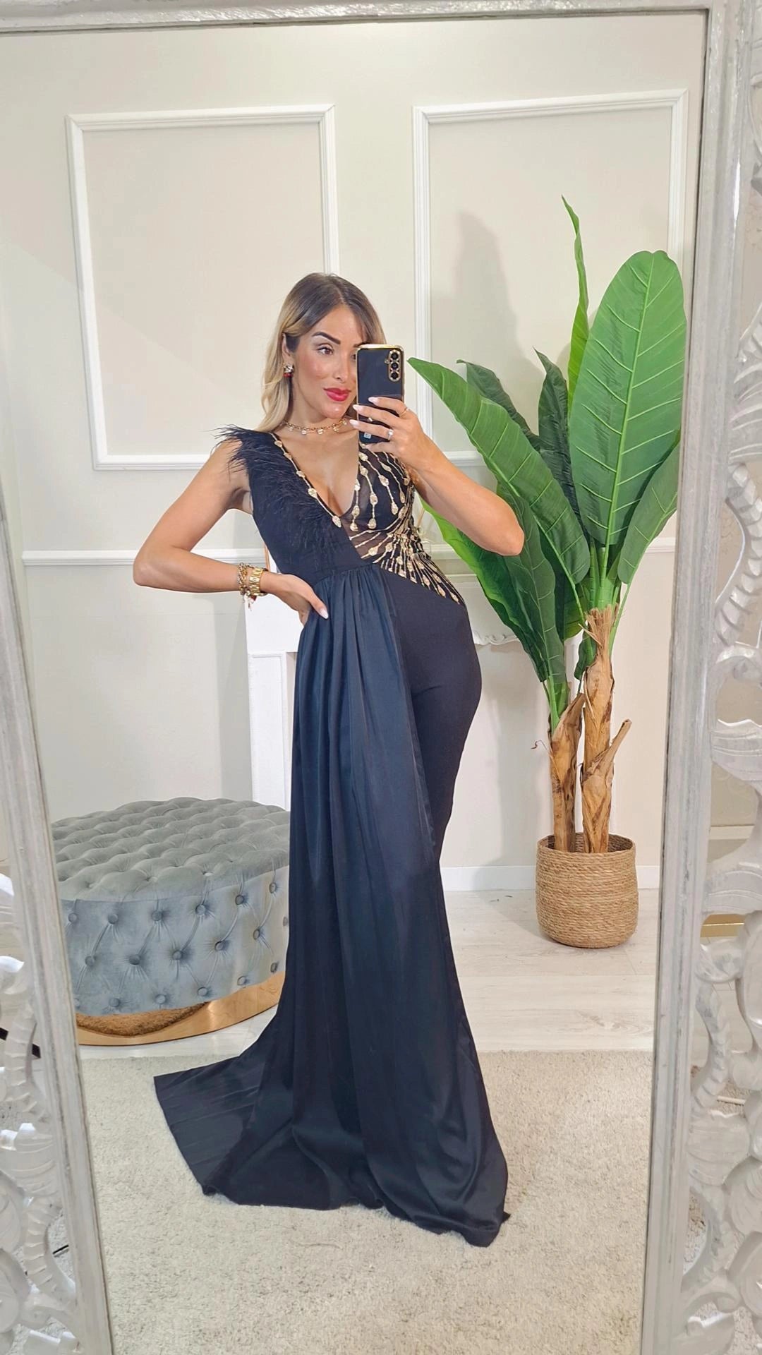 La Tuta Da Cerimonia Jilly si distingue per il raffinato decoro dorato a motivo piume sul petto, che conferisce un’eleganza unica e sofisticata. Il design studiato valorizza la figura con linee pulite e moderne, perfette per eventi formali. Realizzata con materiali di alta qualità, garantisce comfort e una vestibilità impeccabile, ideale per chi cerca uno stile esclusivo e ricercato.