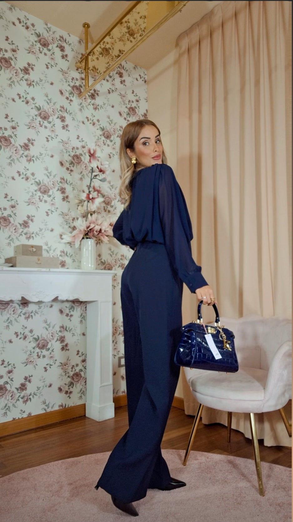 La Tuta Parsey unisce eleganza e comfort con una parte superiore a camicia plissettata che dona raffinatezza ad ogni movimento. Il pantalone a palazzo, arricchito da bottoni dorati disposti verticalmente, aggiunge un tocco di sofisticatezza, mentre la chiusura con cerniera posteriore garantisce una vestibilità perfetta. La leggera apertura sul retro valorizza la silhouette, rendendo questo capo ideale per chi cerca uno stile distintivo ma equilibrato.